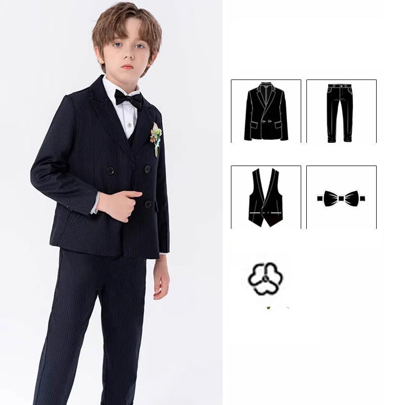 Dress your child in a stylish and sophisticated stripe wedding suit for formal ceremonies, parties, and performances. This ensemble includes a tuxedo dress, perfect for teenagers and kids alike. Let your little one exude elegance and charm in this versatile and fashionable costume.