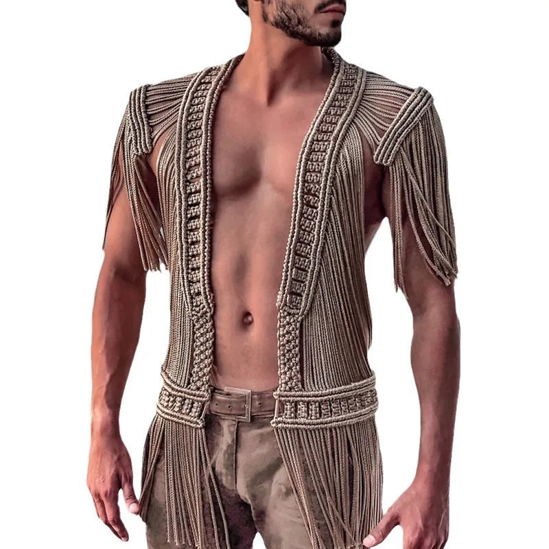 Elevate your summer style with this handmade crochet cardigan for men. Featuring a bohemian-inspired hollow-out design and playful tassel accents, this lightweight cover-up is perfect for the beach or poolside. Crafted with care for a breezy, see-through look, it pairs effortlessly with your favorite bathing suit or swimwear. Ideal for adding a touch of sexy, relaxed flair to your vacation or summer outings.