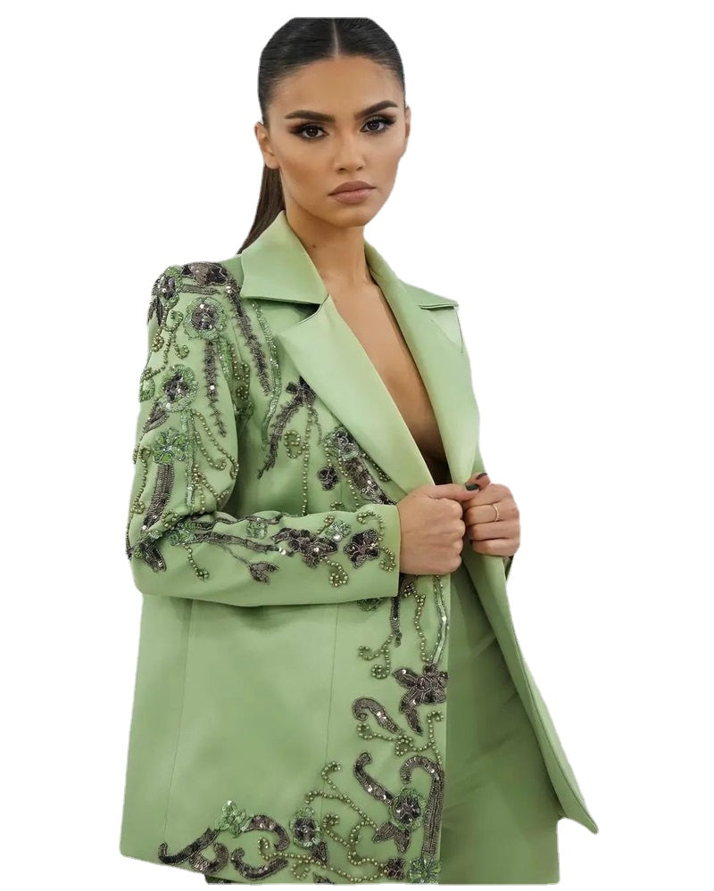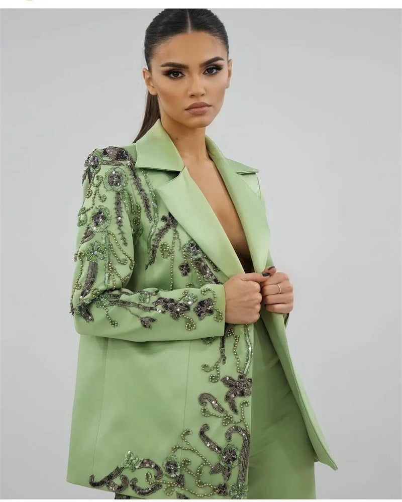 Designer Green Women Suits Set Luxury Beads Appliques Formal Wedding Evening Party Prom Dress 2 Pieces Blazer+Pants Custom Made