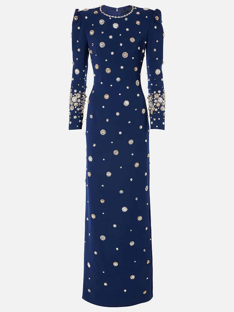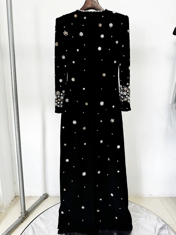 Command the room in this luxurious beaded maxi dress, tailored for formal occasions with elegant long sleeves and a sweeping, floor-length silhouette. Meticulous beadwork delivers sophisticated sparkle from every angle, while the structured bodice and defined waist sculpt a flattering, elongated shape. Crafted for comfort and movement, it drapes beautifully as you walk—ideal for black-tie events, galas, and weddings. Complete the look with sleek heels, a jeweled clutch, and understated earrings for timeless glamour.