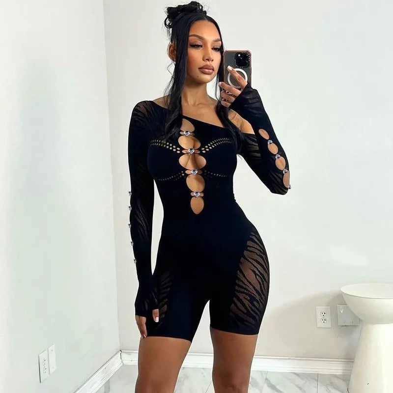 Diamonds Hollow Out Playsuits Women Sexy Slash Neck Off Shoulder Gloves Long Sleeve Shorts Rompers Clubwear Slim Party Overalls