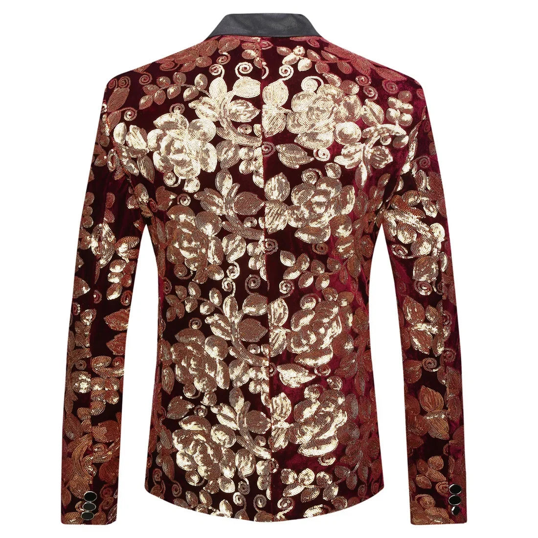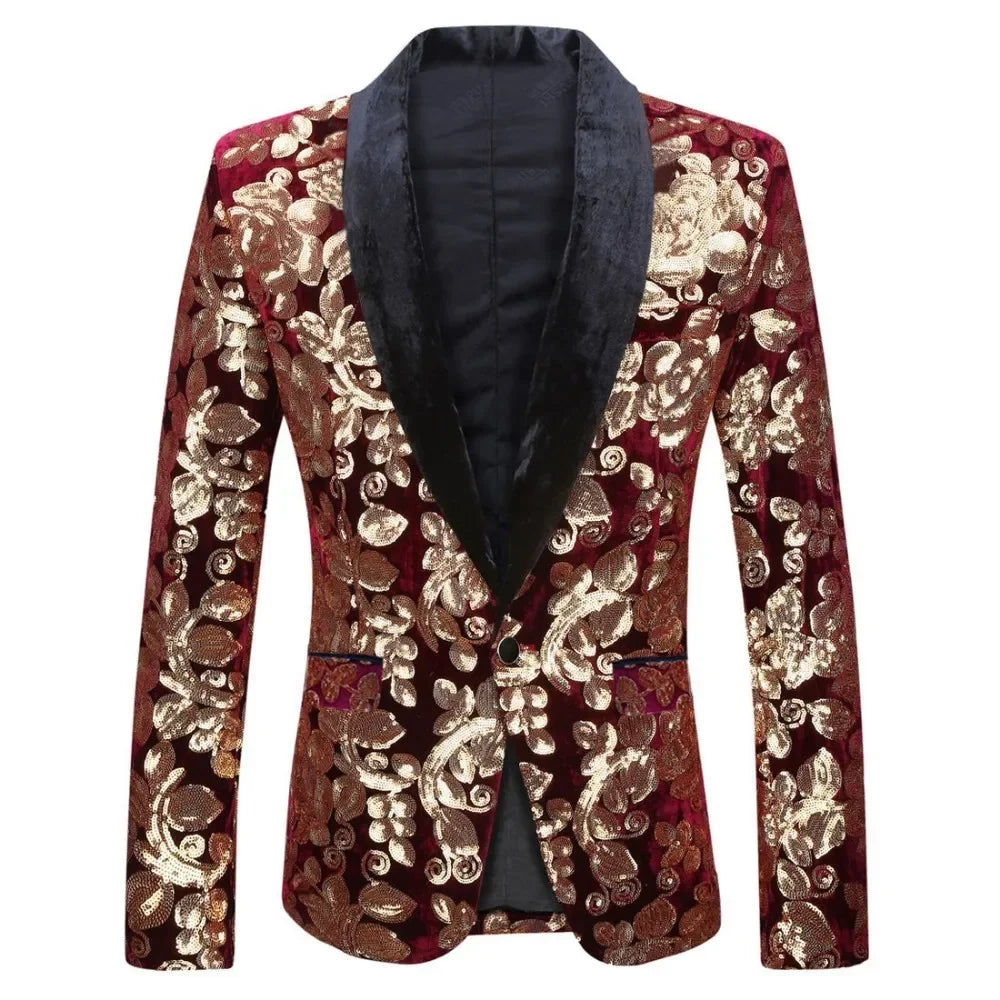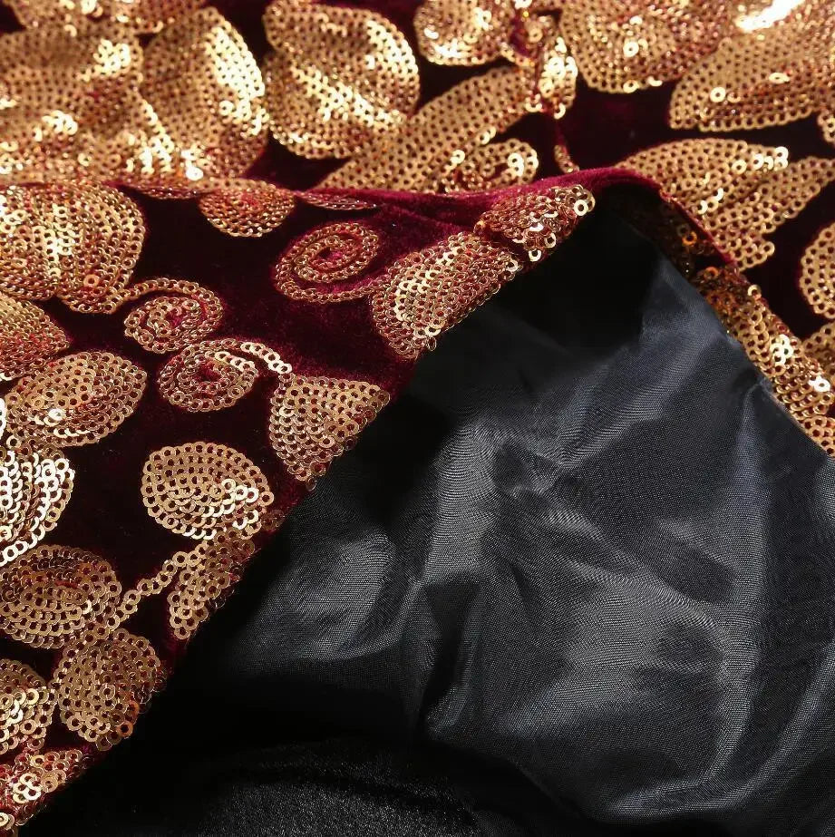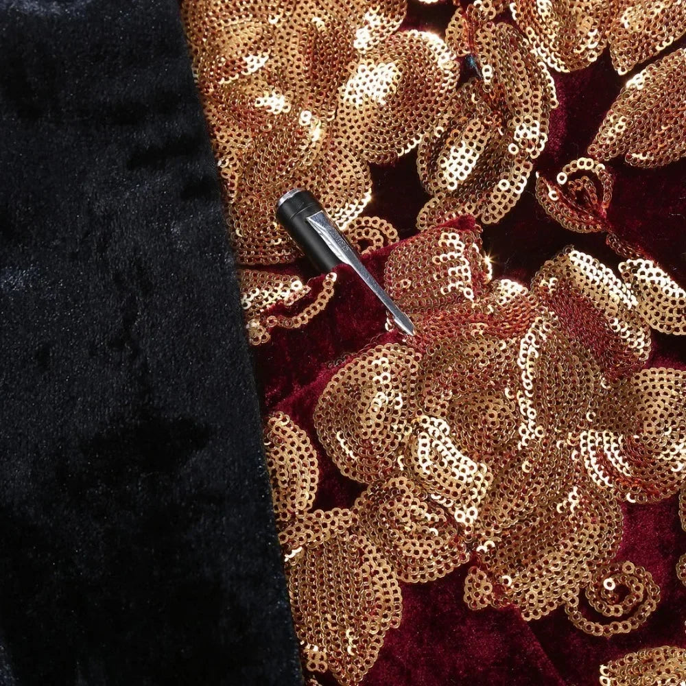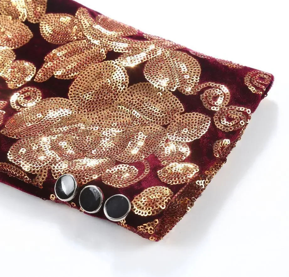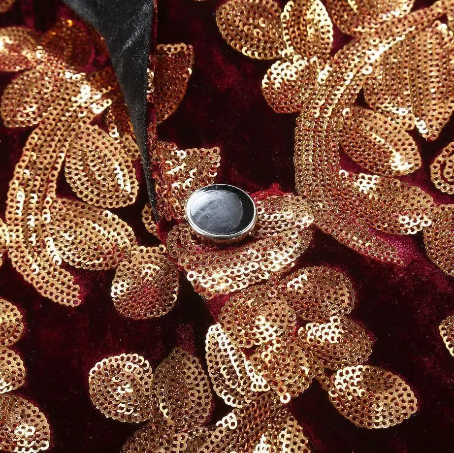 Look dapper and stylish in this slim fit men's suit set, featuring a burgundy velvet blazer and trousers adorned with sequins. Perfect for weddings and special occasions, this fashion-forward ensemble exudes sophistication and charm. The luxurious velvet fabric adds a touch of elegance, while the sequin detailing adds a hint of glamour to the outfit. Whether you're the groom, part of the wedding party, or attending a formal event, this 2-piece set will elevate your look and make you stand out. Make a statement with this trendy and fashion-forward suit that combines classic style with modern flair for a memorable and stylish appearance.