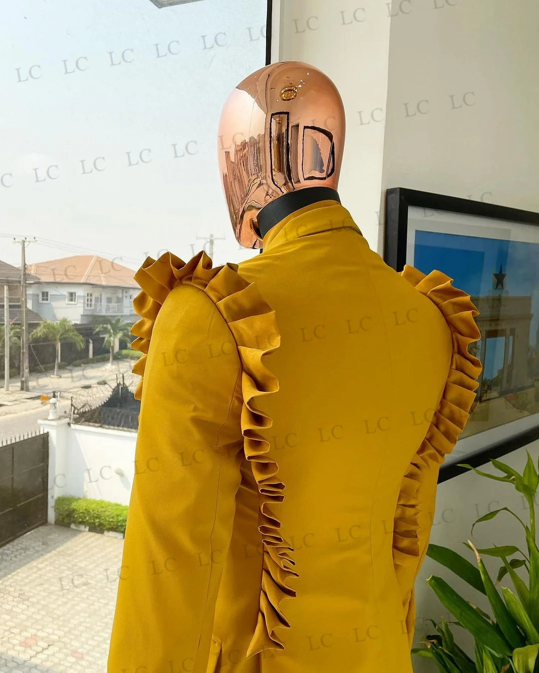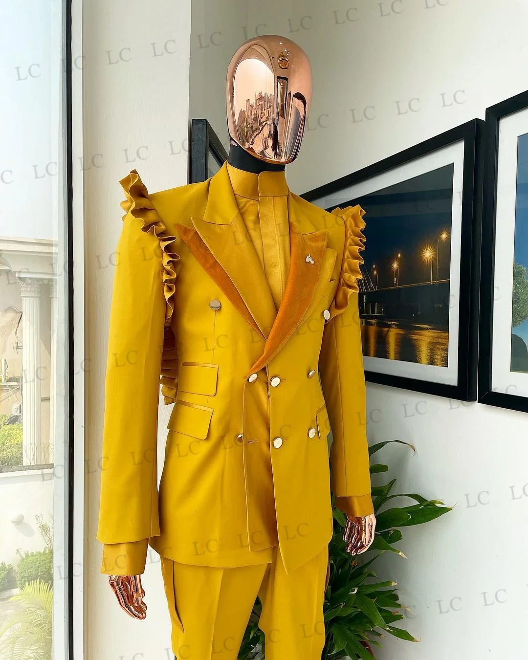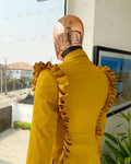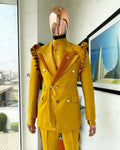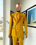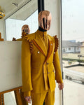 Men's Mustard Double-Breasted Suit with Ruffle Shoulder Detail and Matching Trousers