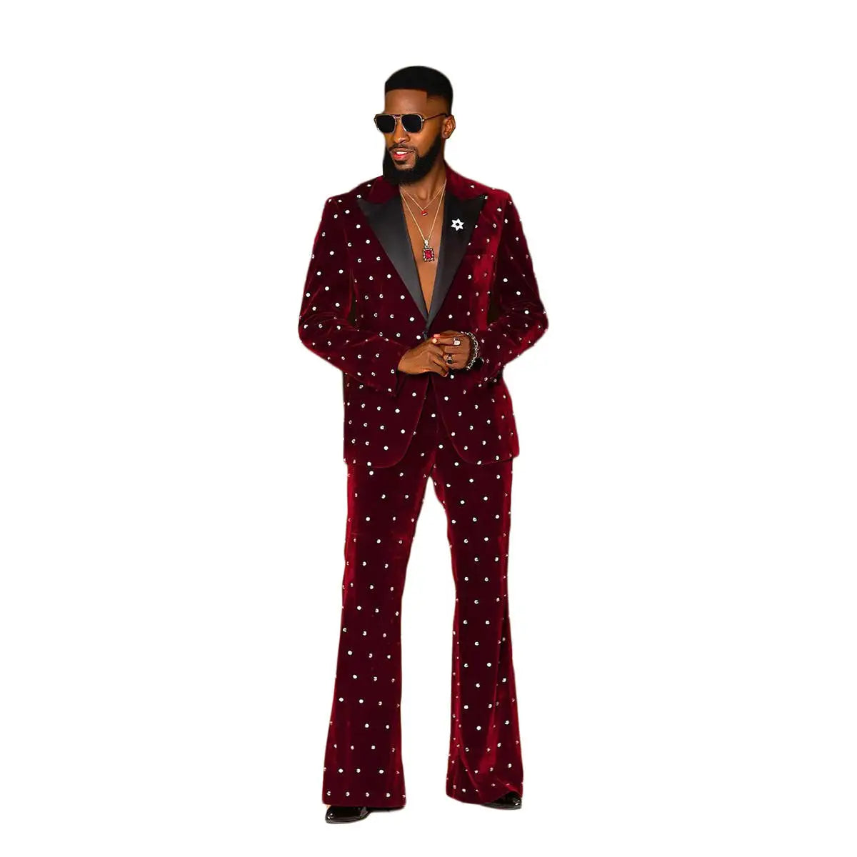 Glamorous Men's Velvet Wedding Tuxedo with Crystal Accents - Custom Made 2-Piece Blazer and Pants Set for Stylish Grooms and Prom Events