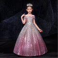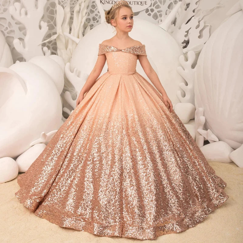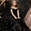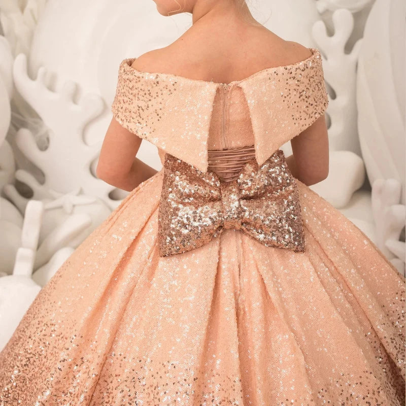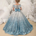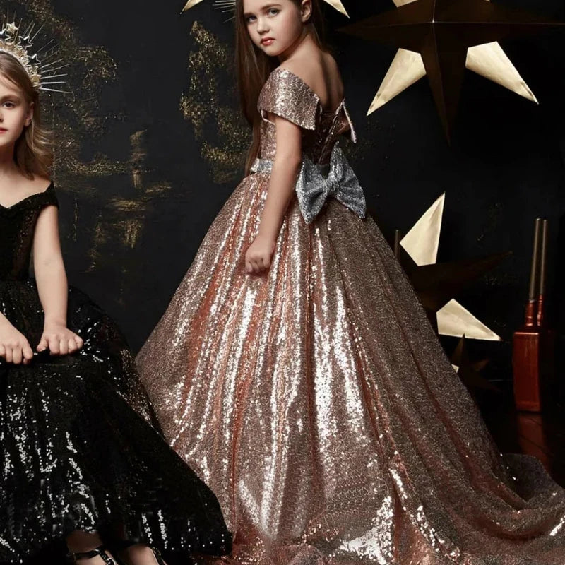 Elevate your child's birthday party or any special occasion with this elegant evening dress for girls. The dress features intricate sequin detailing, a fluffy and luxurious design, and a long silhouette fit for a princess. Perfect for pageants, proms, and formal events, this ball gown is adorned with a charming bow to add a touch of sophistication to your child's outfit.