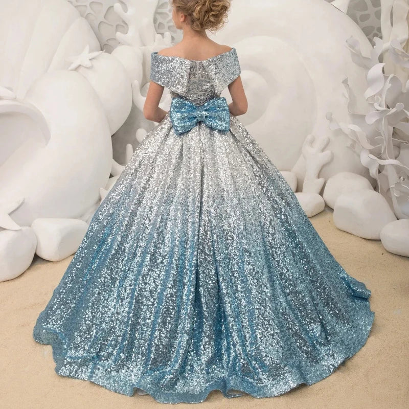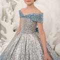 Girls Sequin Ball Gown Off Shoulder Blue and Silver Glitter Dress