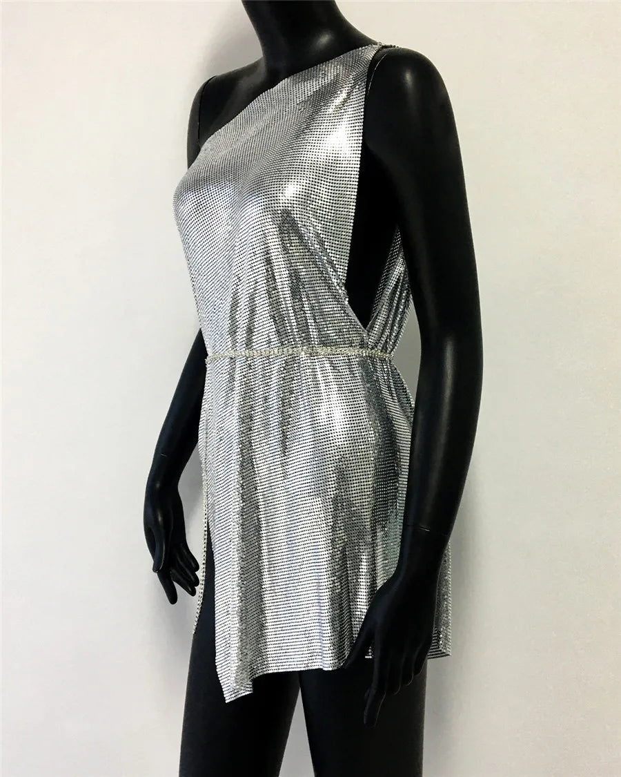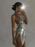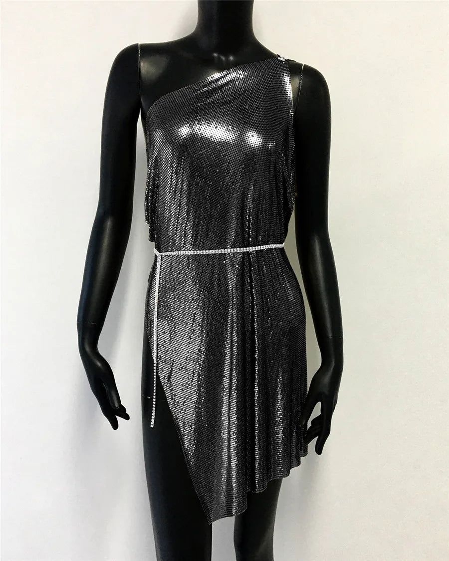 Glitter Metallic Sequins Mini Dress Sexy Backless Single Shoulder Side Split Dress for Women Rave Festival Party Evening Dresses
