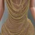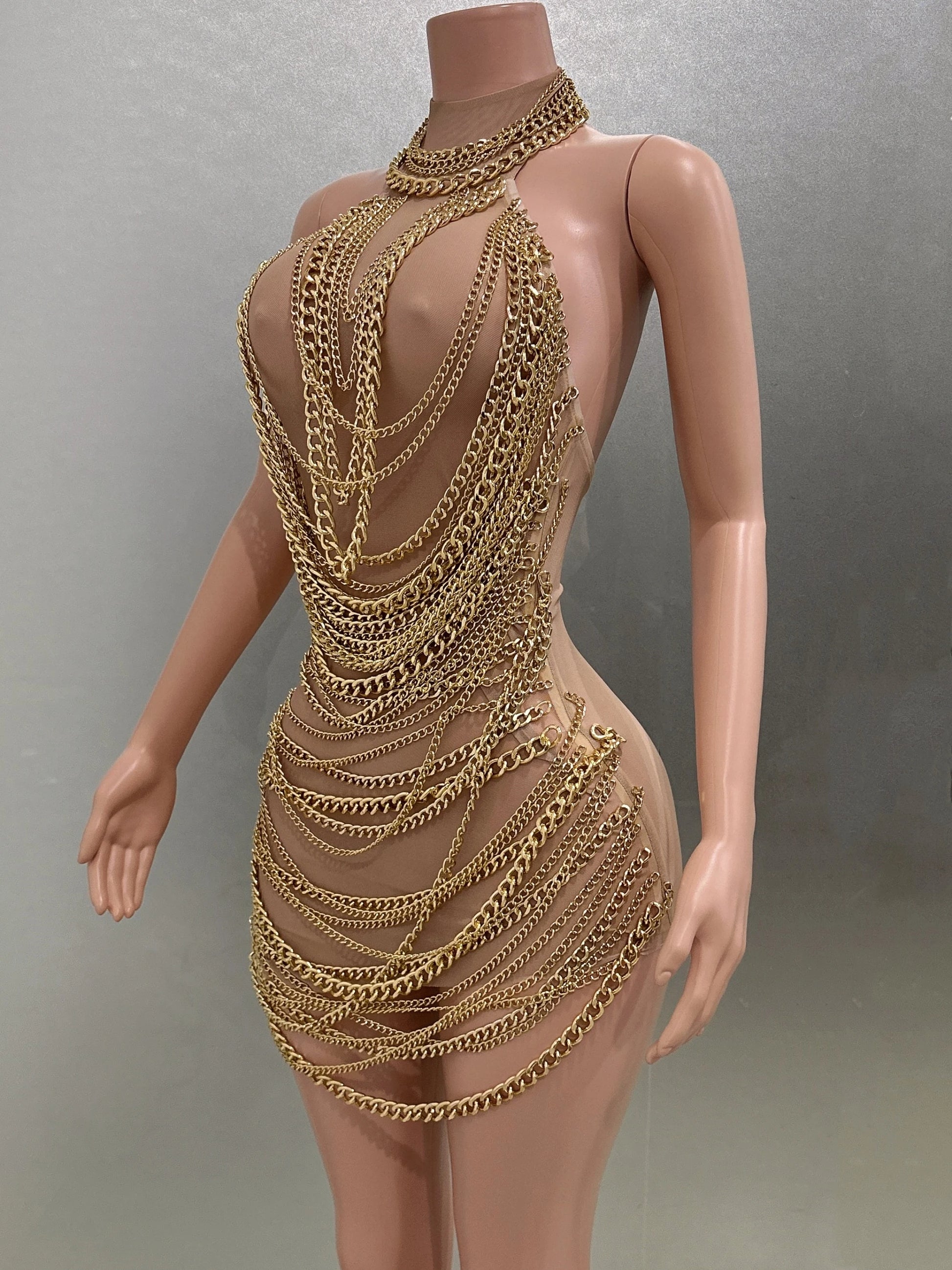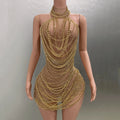 Gold Luxury Chains Khaki Sexy See-Through Sheath Mini Dress Evening Party Performance Costume Bar Nightclub Singer Stage Wear