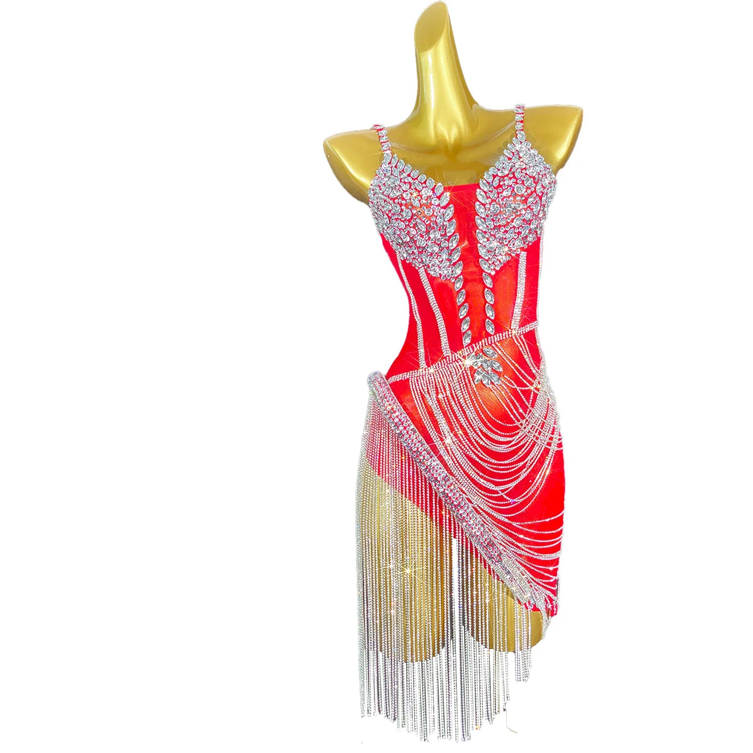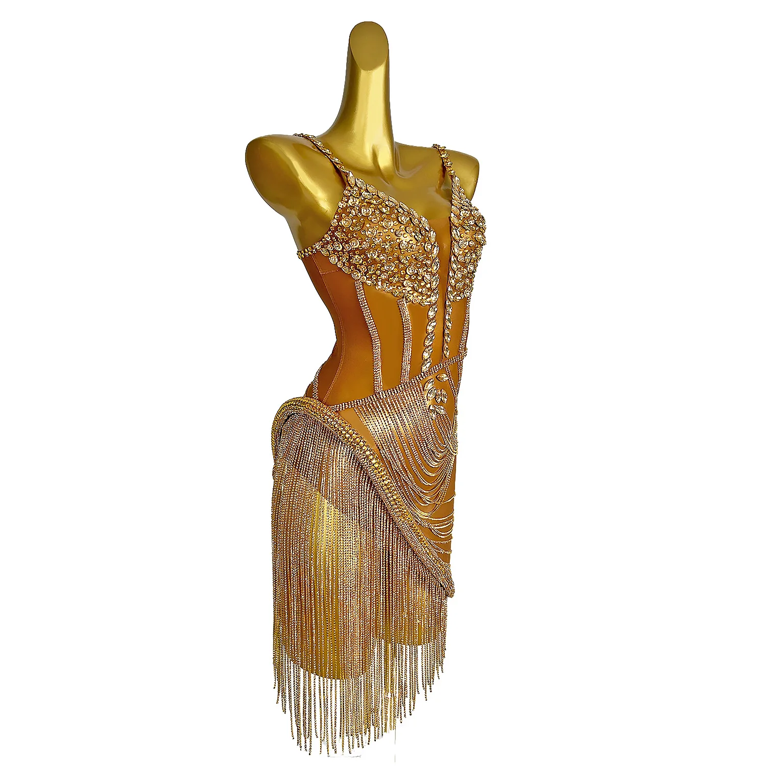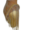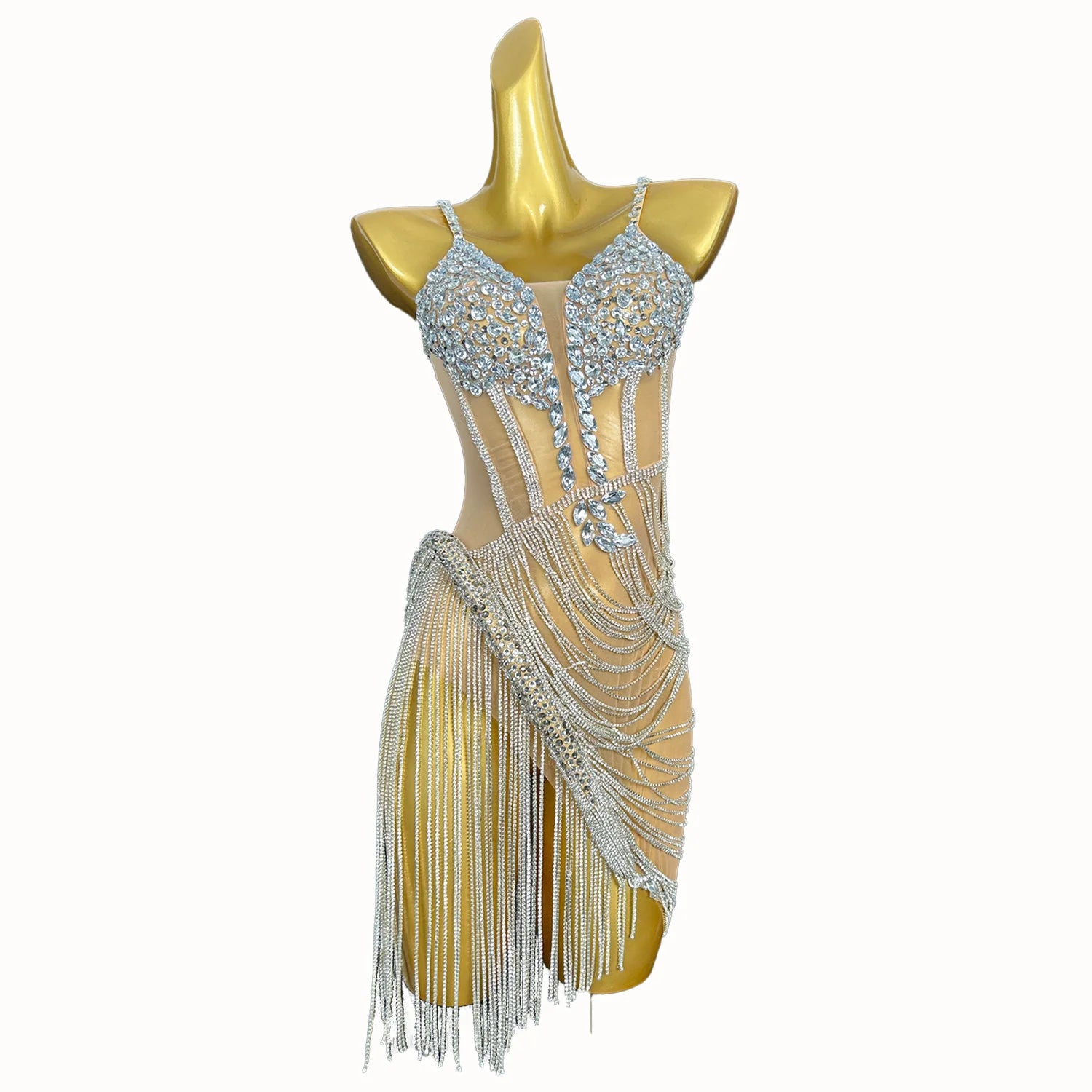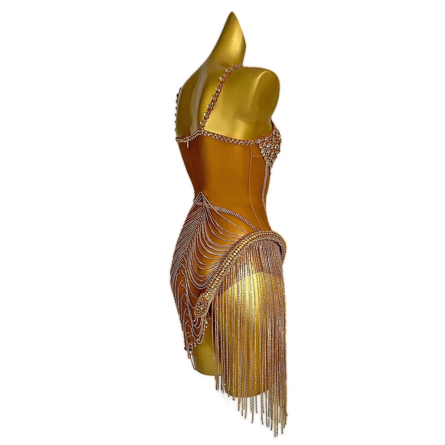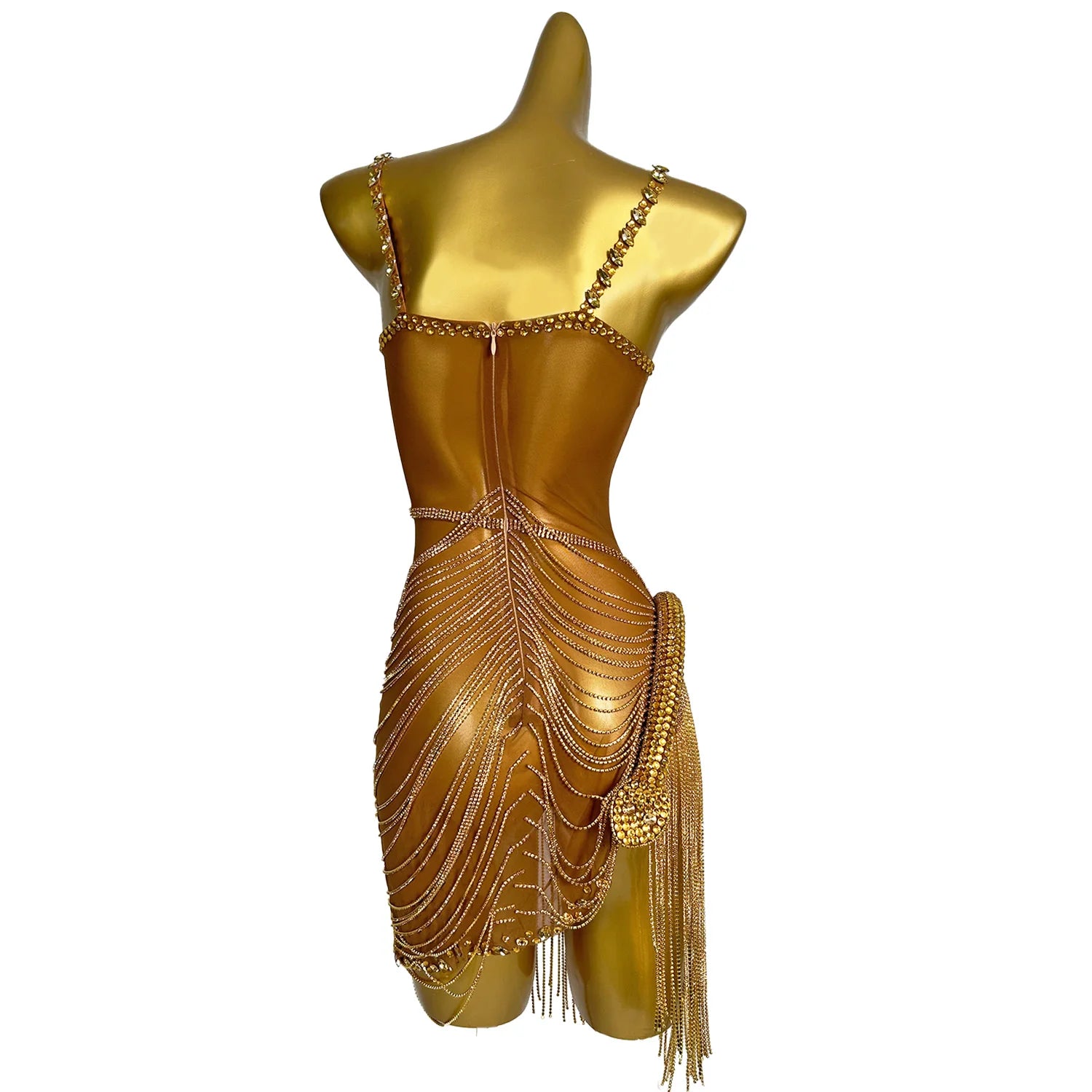 Gold Rhinestones Chains Transparent Short Dress Birthday Celebrate Prom Gowns Evening Costume Dance Performance Dress