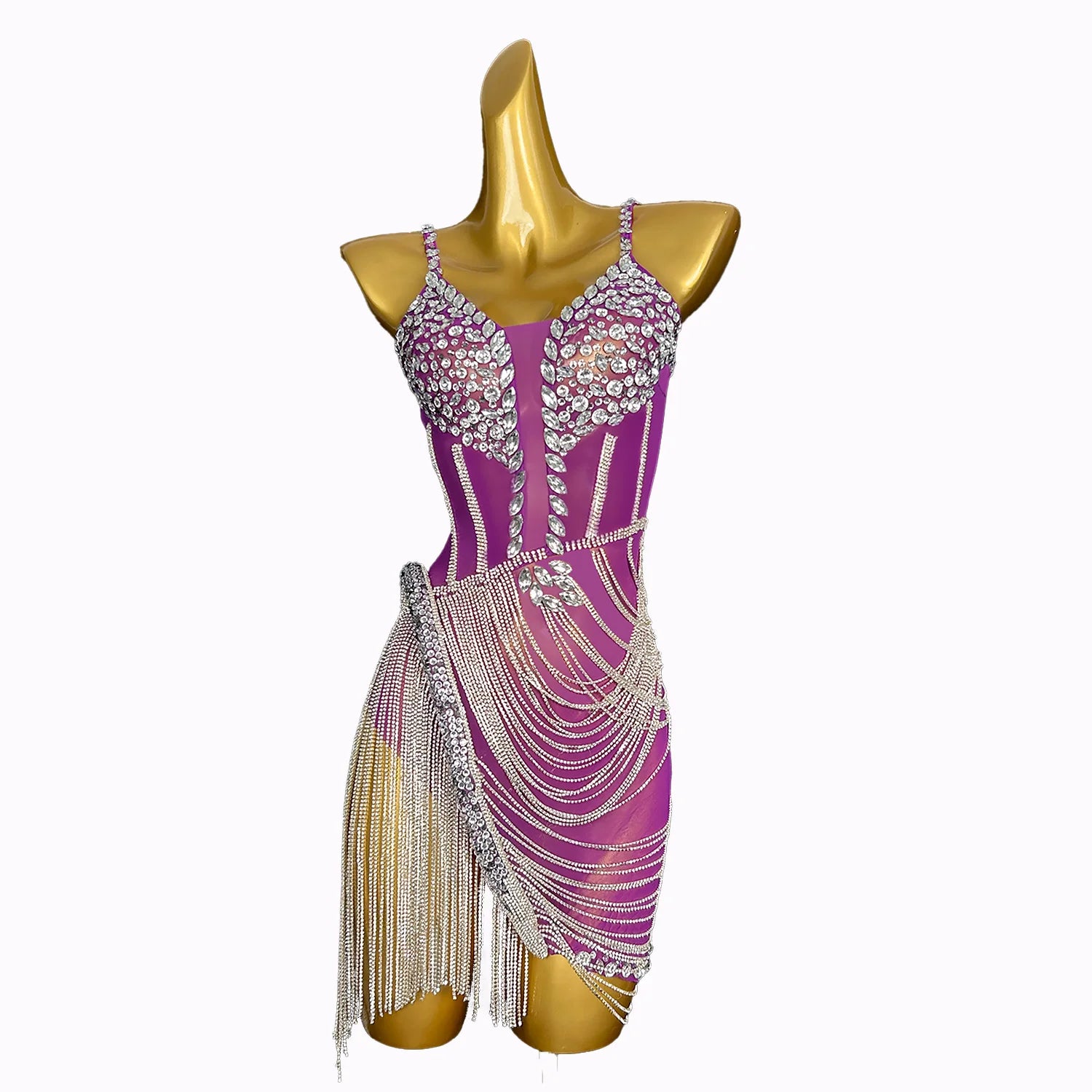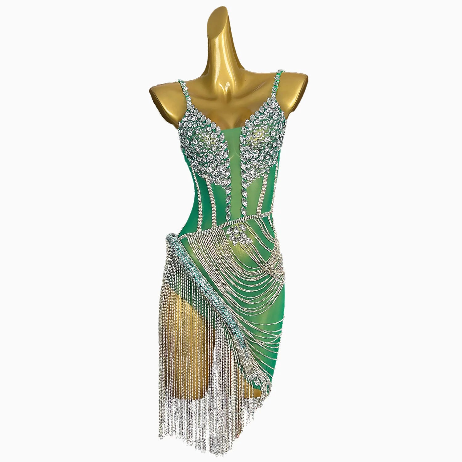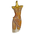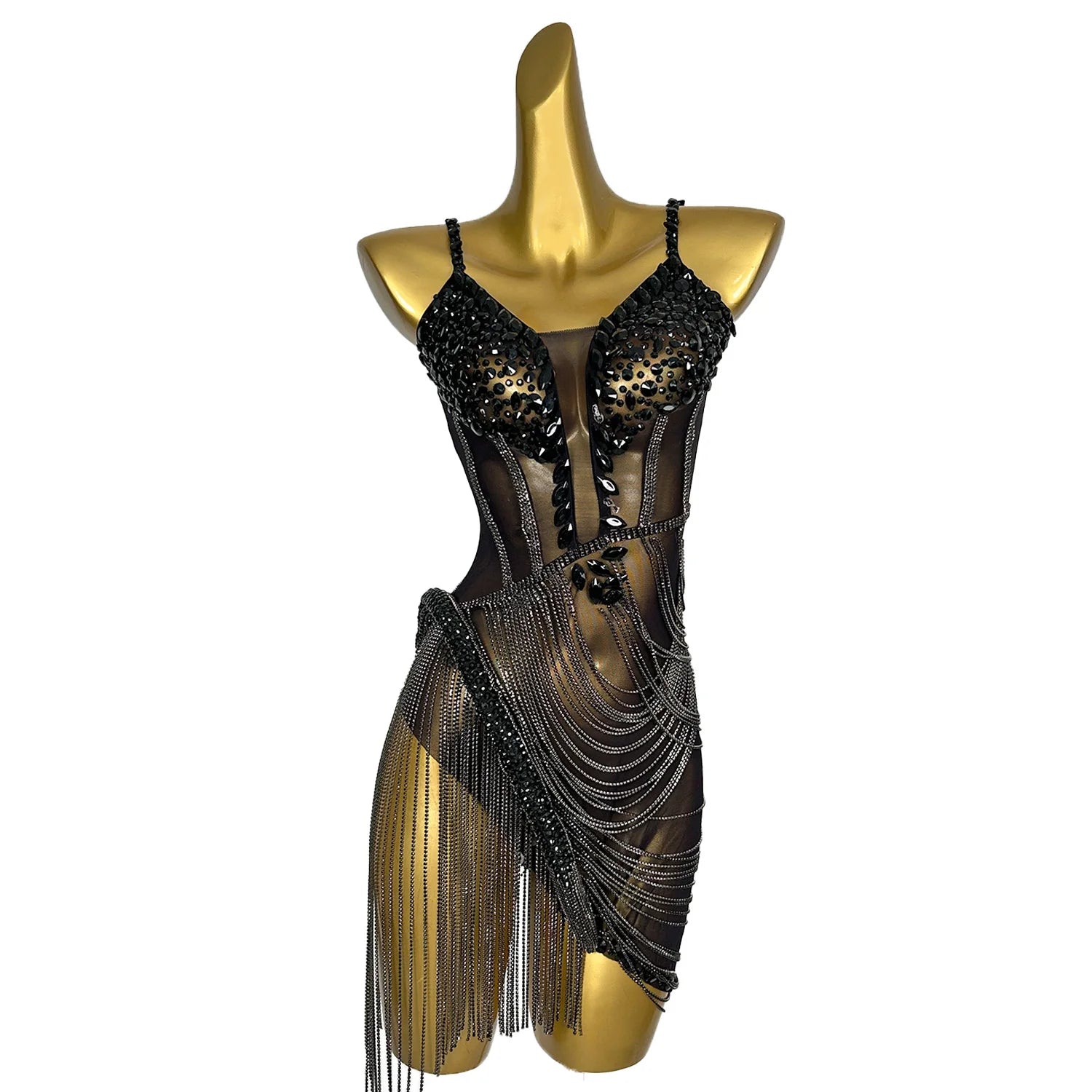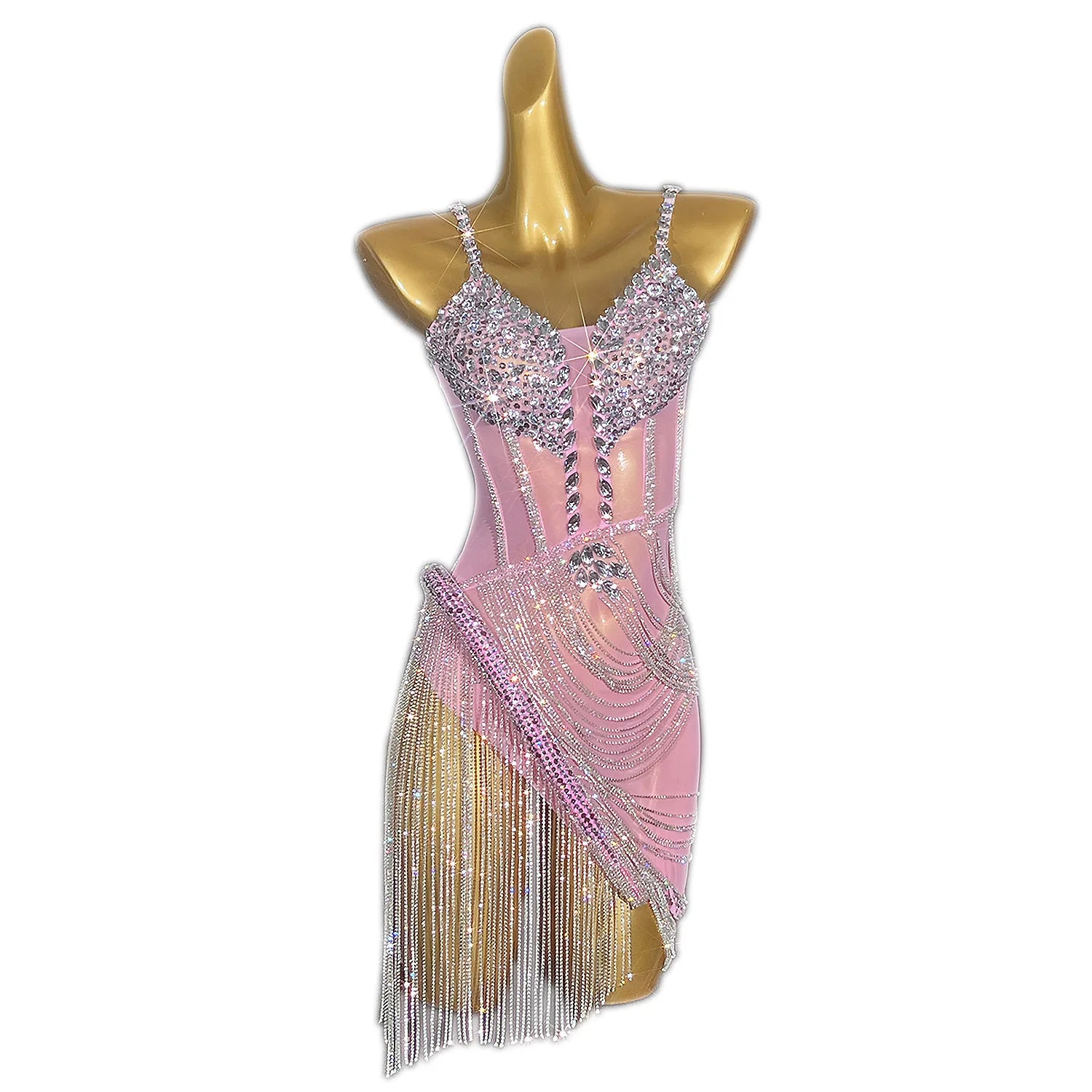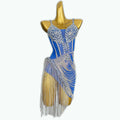 Gold Rhinestones Chains Transparent Short Dress Birthday Celebrate Prom Gowns Evening Costume Dance Performance Dress
