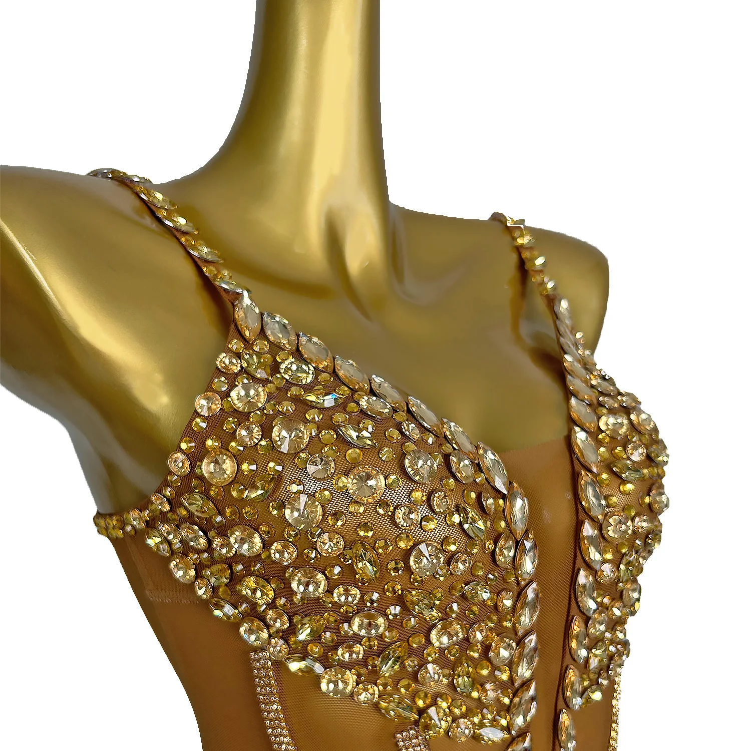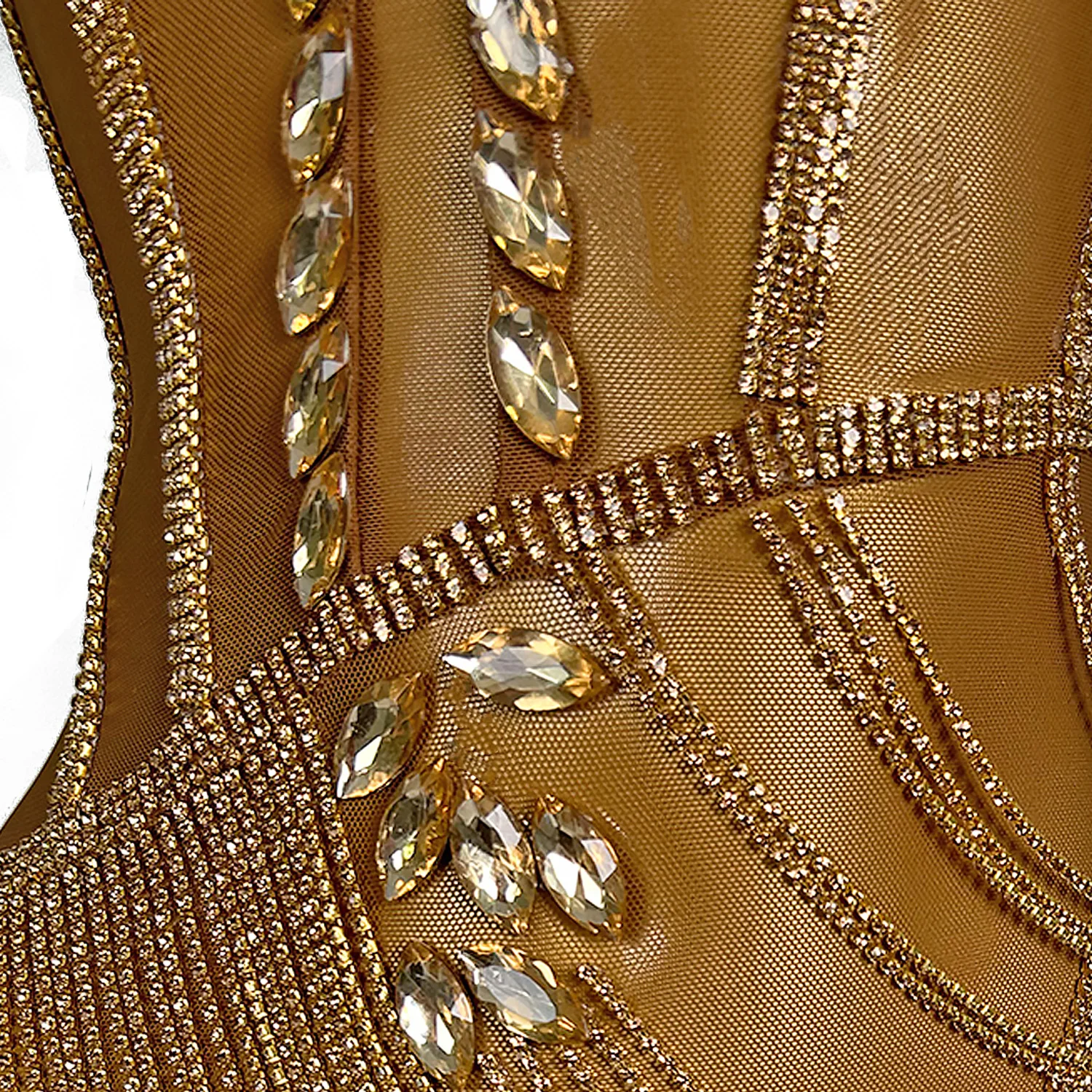 Gold Rhinestones Chains Transparent Short Dress Birthday Celebrate Prom Gowns Evening Costume Dance Performance Dress Liehu