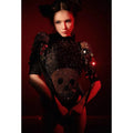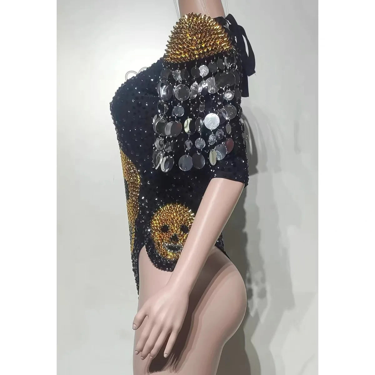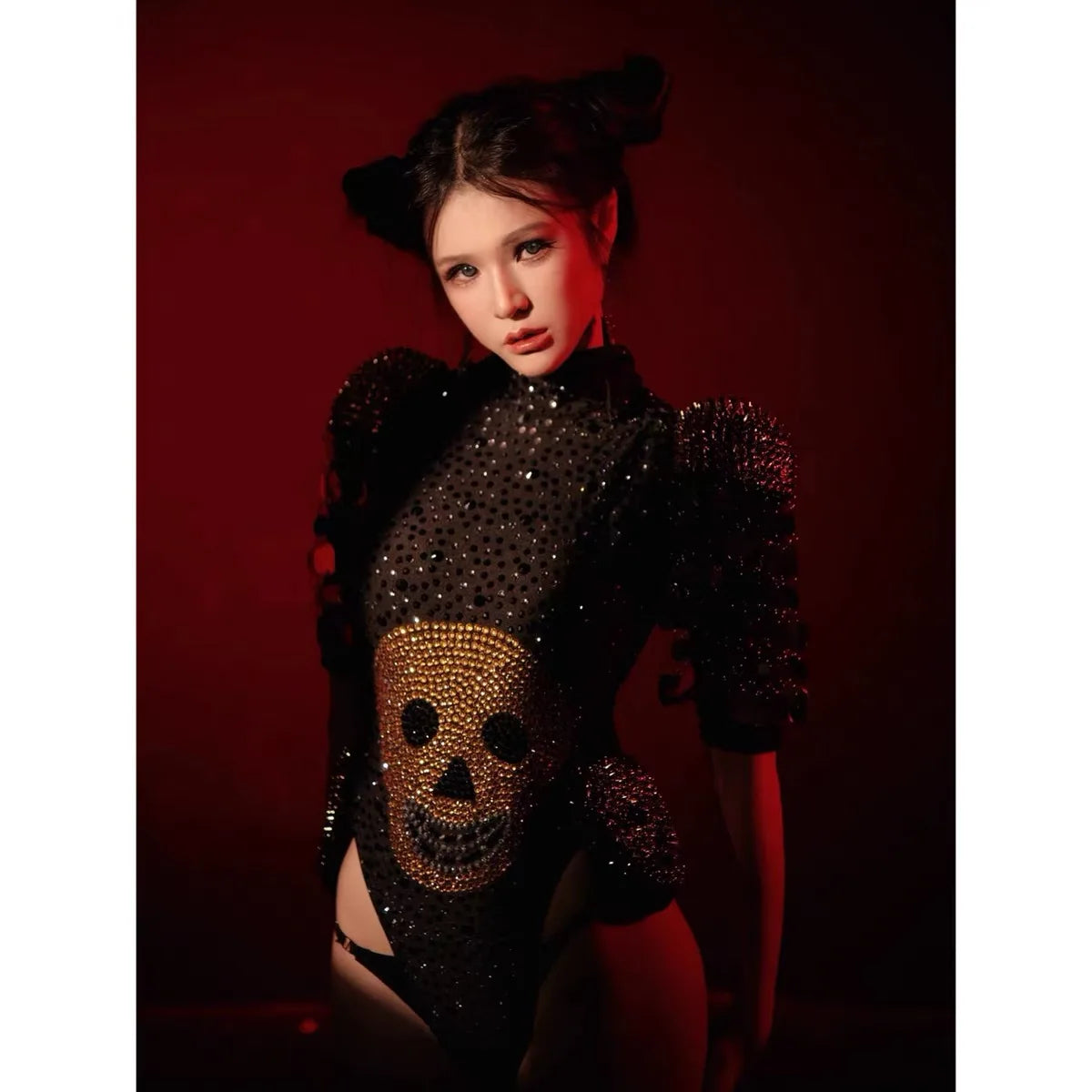 Gothic Glam Skull - Embellished Bodysuit - Sparkly Rhinestones and Spiked Shoulders, Ideal for Nightclubs and Themed Events