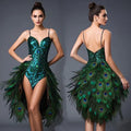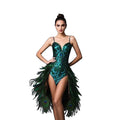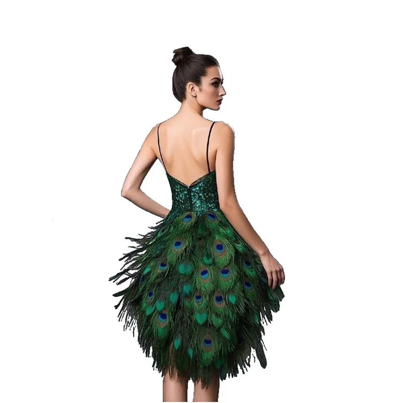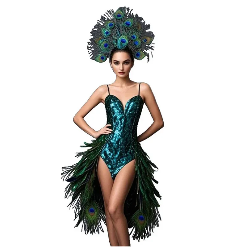 Hi Melody Peacock Feather Dress Headdress Party Gown for Women Nice Carnival Costume Photoshoot Stage Cosplay