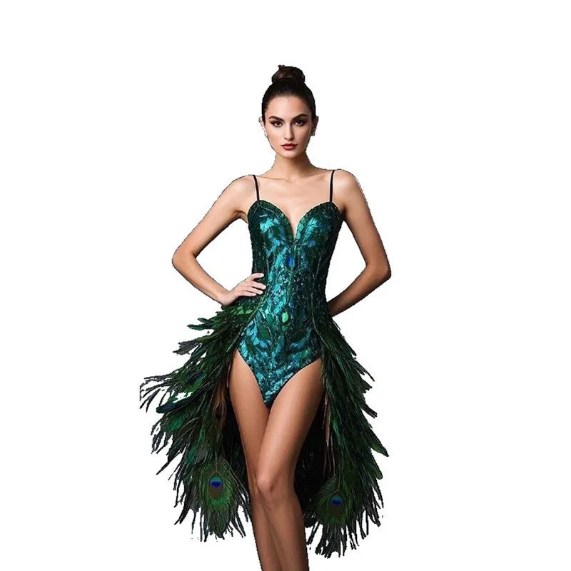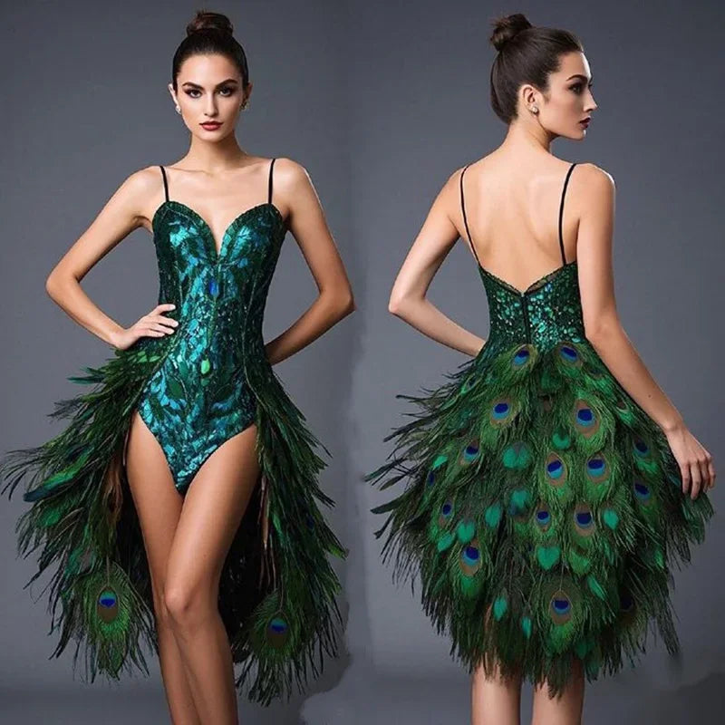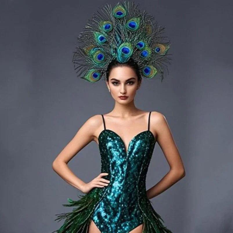Make a spectacular entrance and embody regal drama with the Melody Peacock Feather Dress and Headdress — a couture-inspired carnival costume designed for photoshoots, stage performances, cosplay, red-carpet looks, and festival pageantry. This showpiece channels the vibrant, iridescent beauty of a peacock with artful feather layering, luxe fabrics, and sculptural tailoring to create a queenly silhouette that reads breathtaking from every distance.