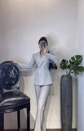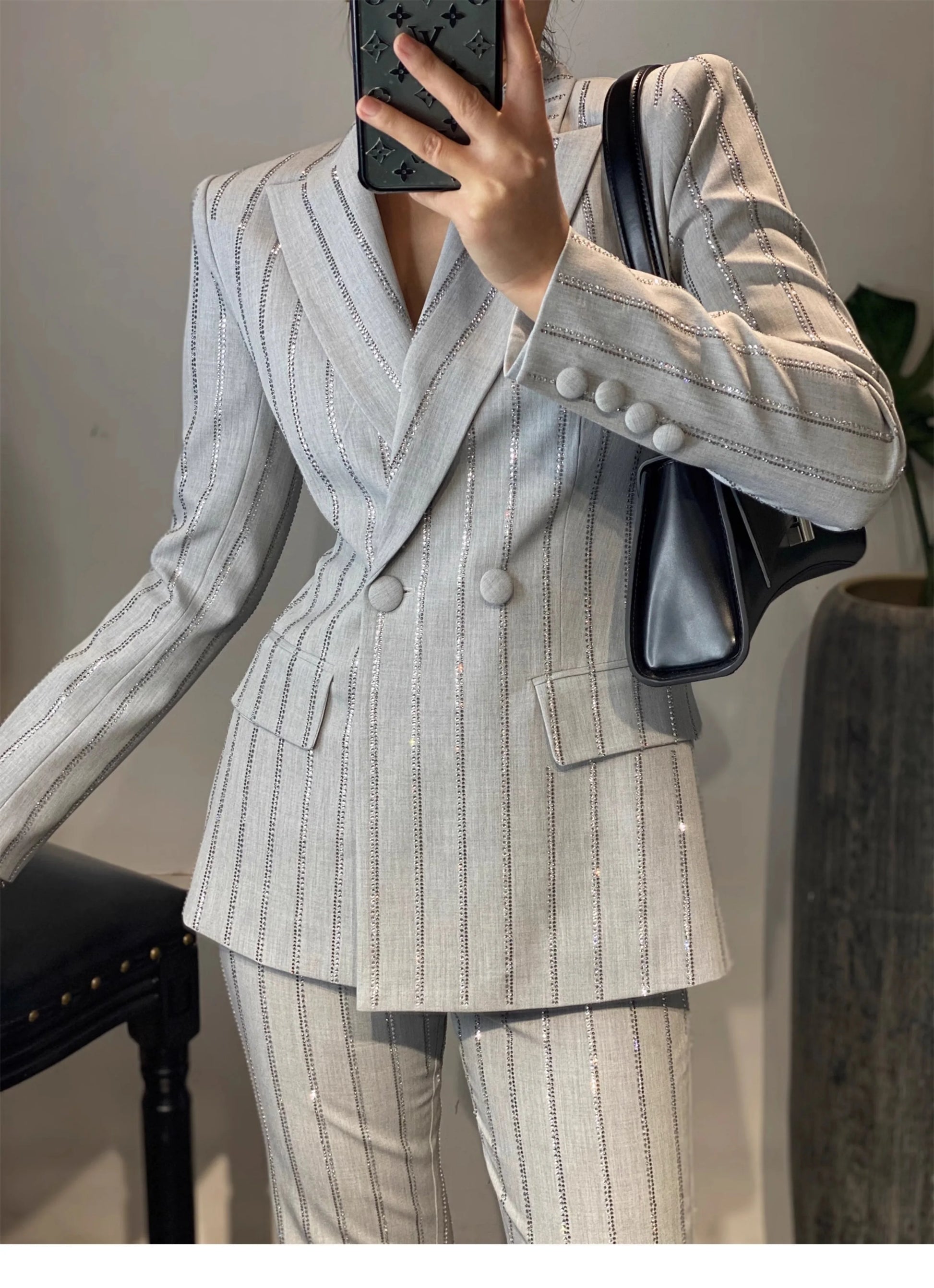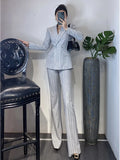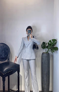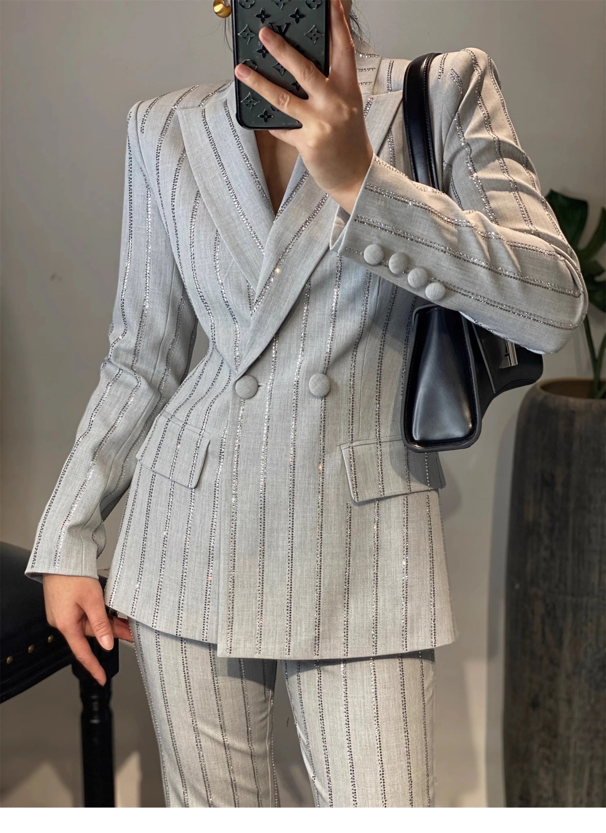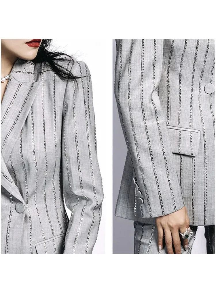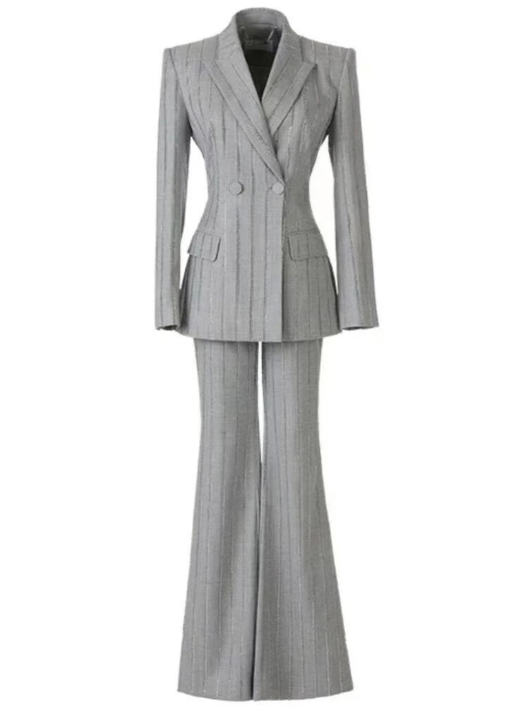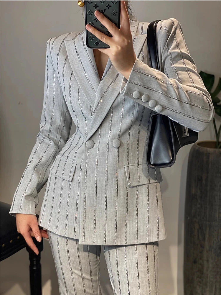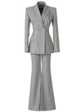 High-End Grijze Zware Lndustrie Hot Boorpak VrouwenElegante DubbeleRij Knopen Jas Wijde Pijpen Broek Trajes Elegantes Para Mujer