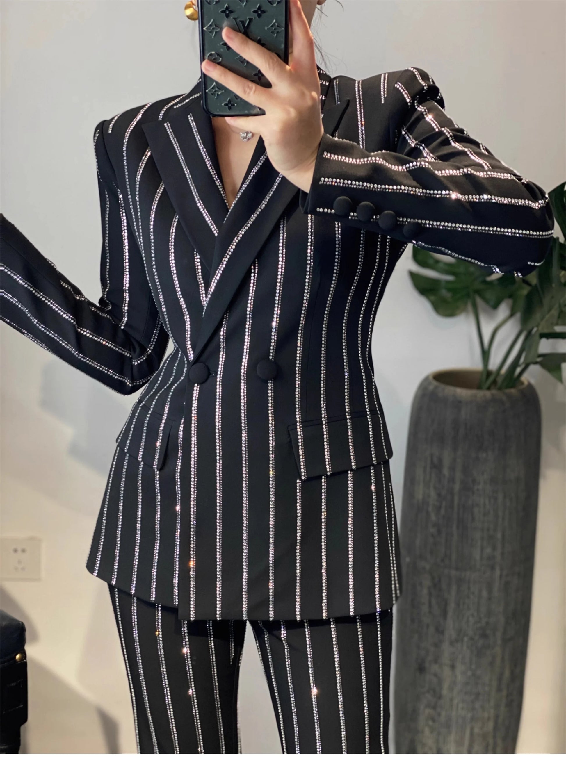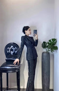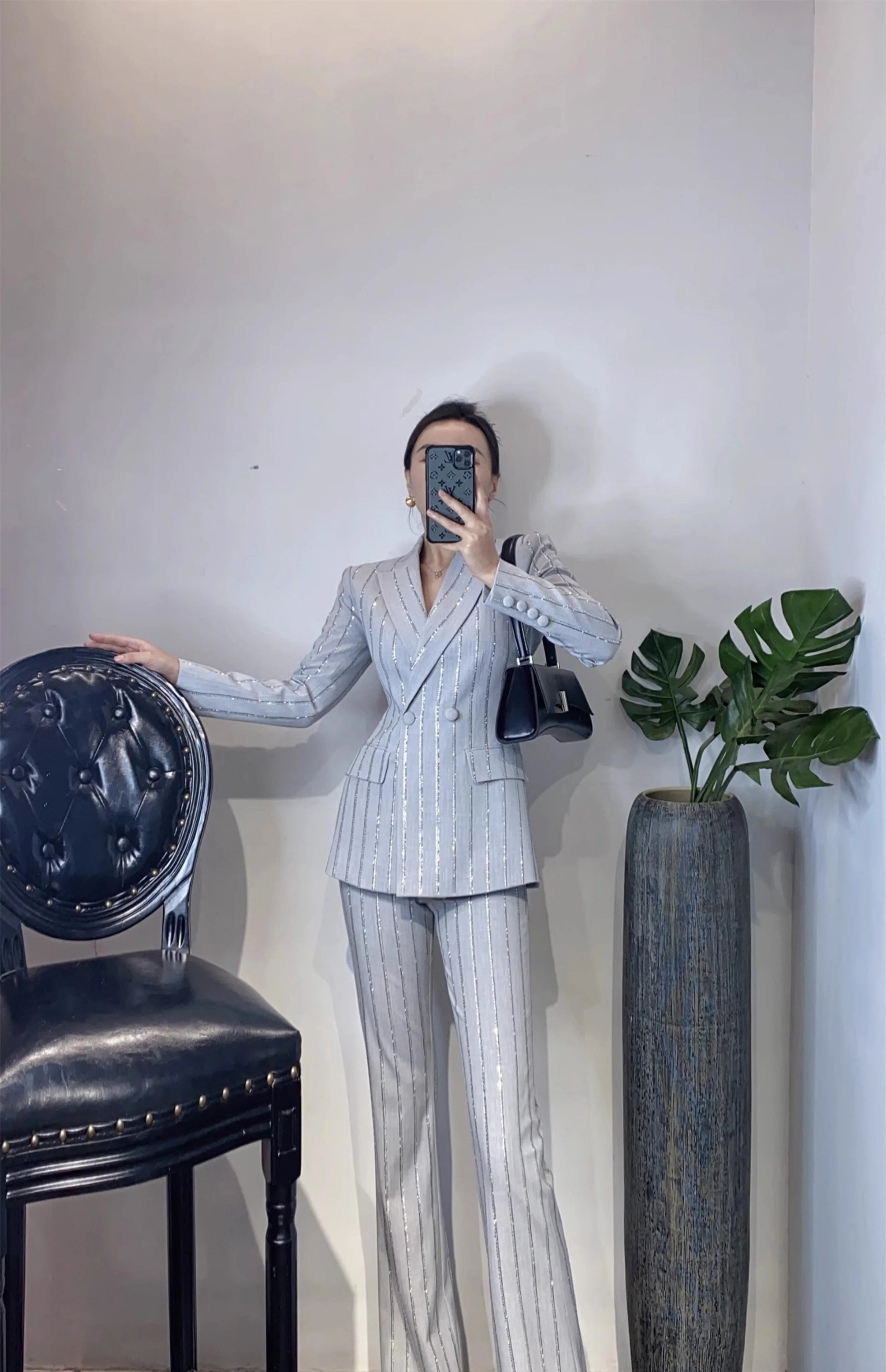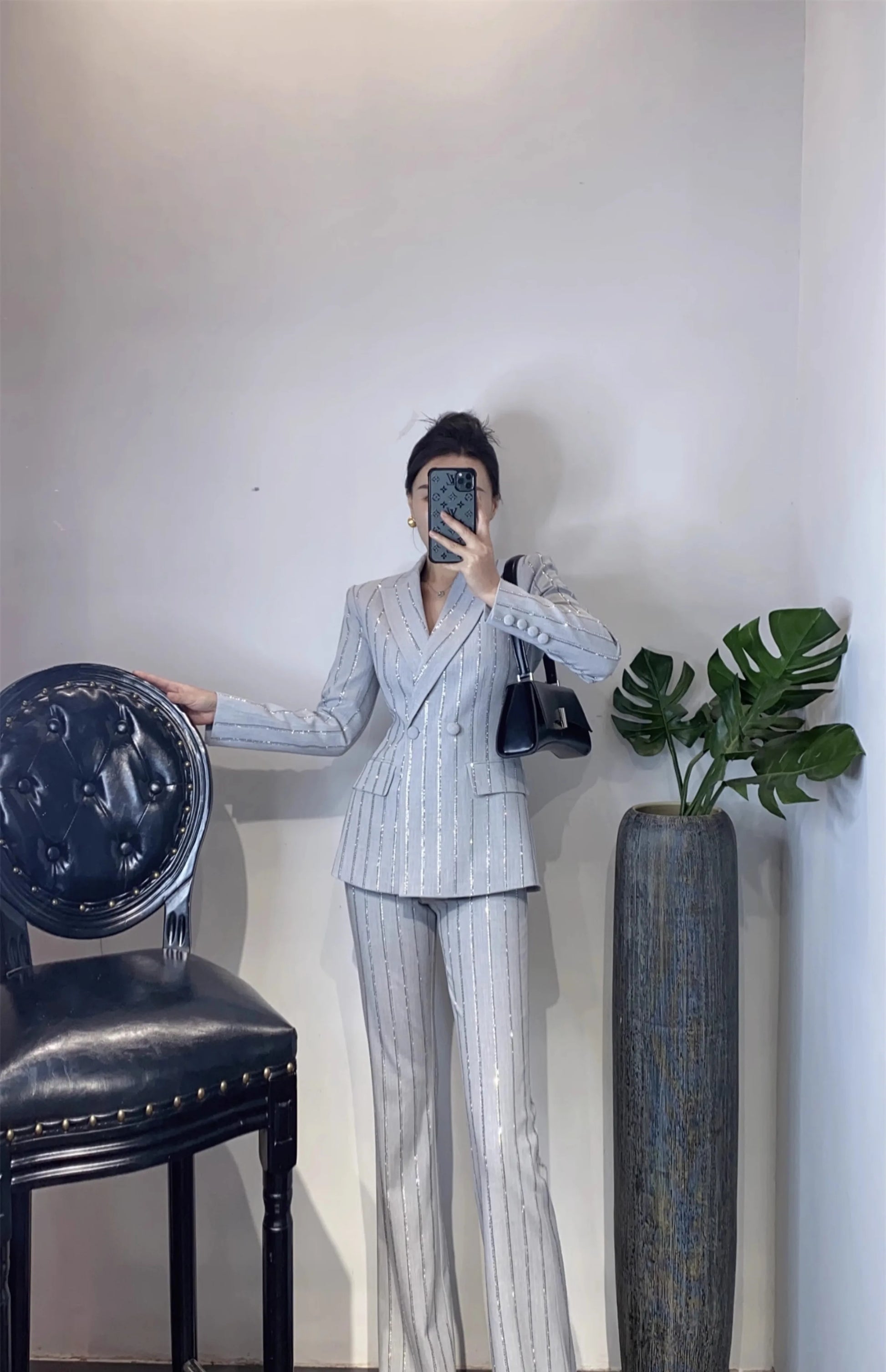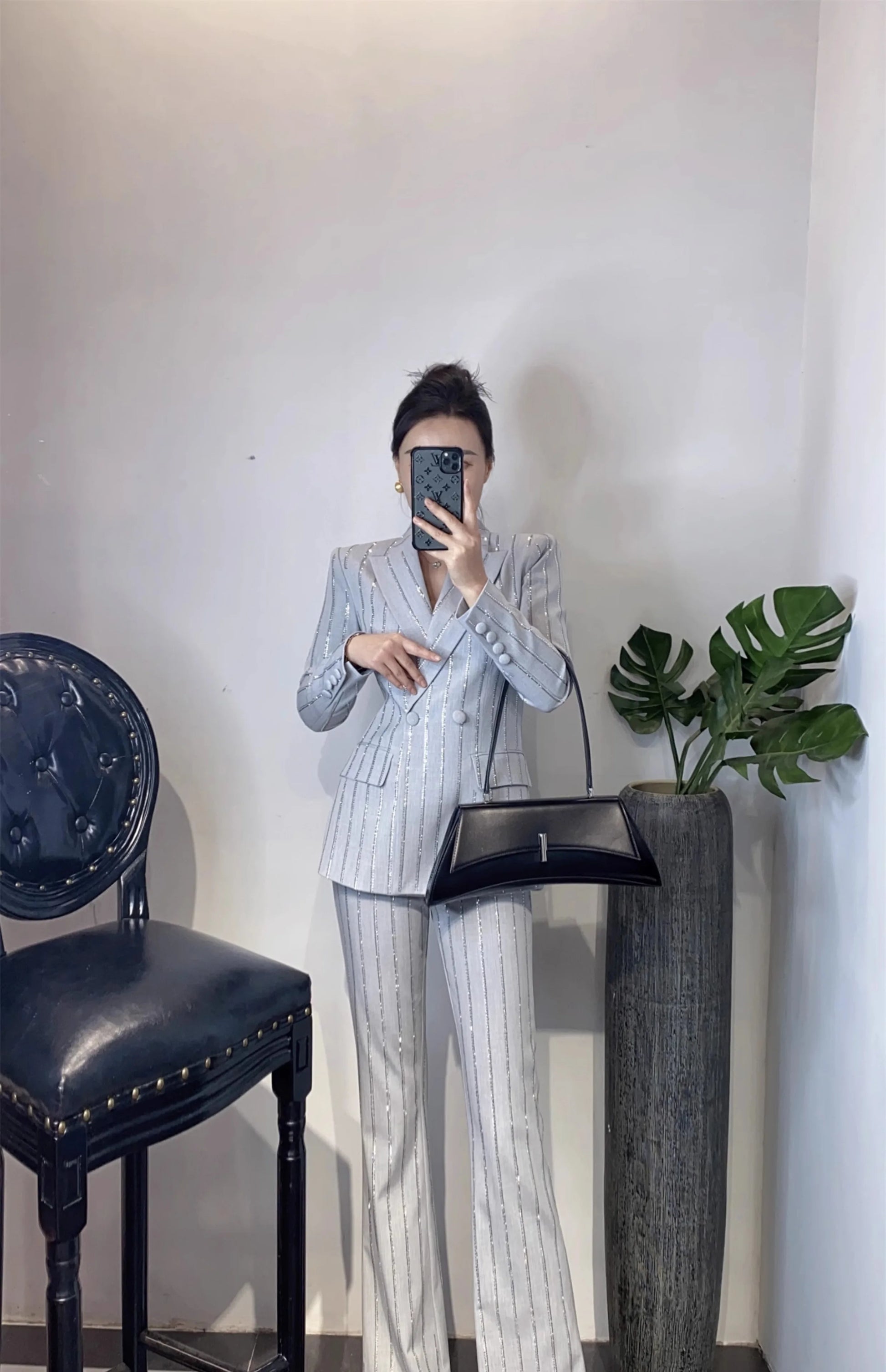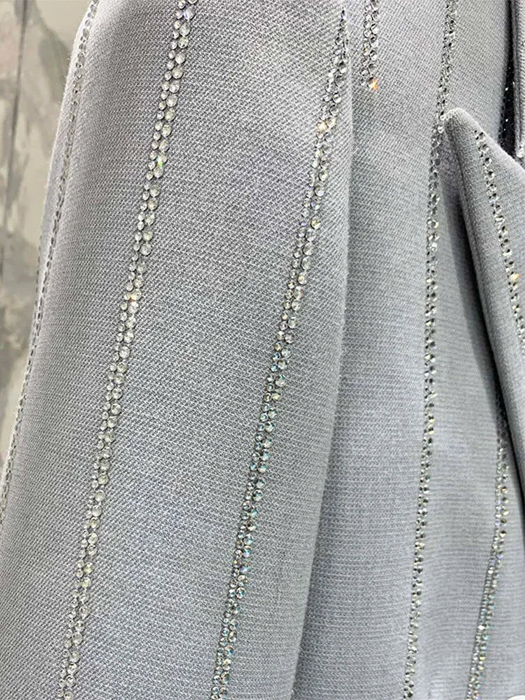 High-End Grijze Zware Lndustrie Hot Boorpak VrouwenElegante DubbeleRij Knopen Jas Wijde Pijpen Broek Trajes Elegantes Para Mujer