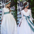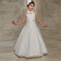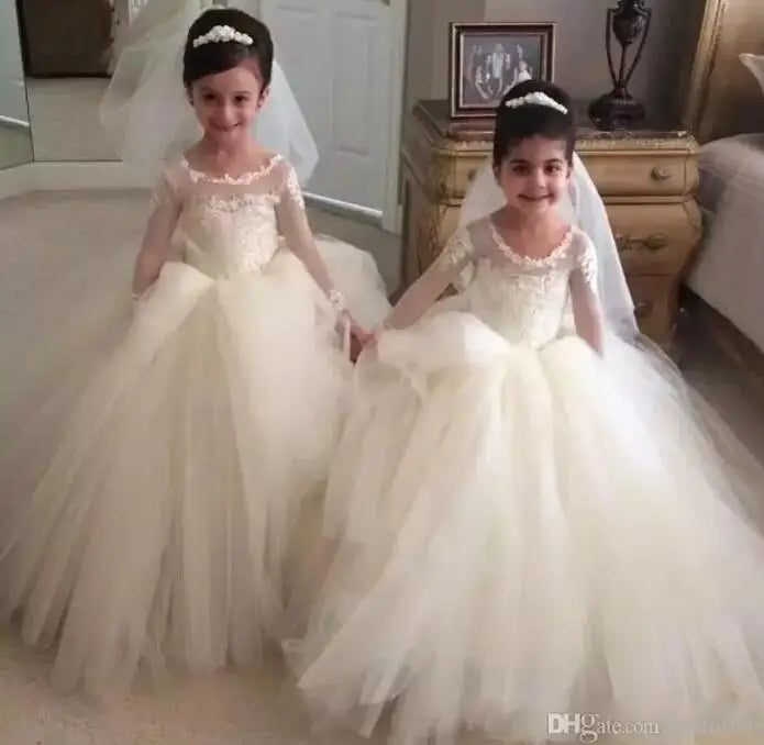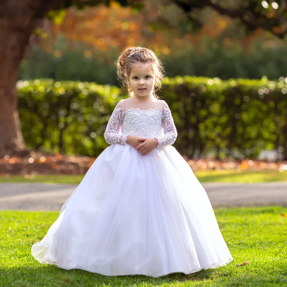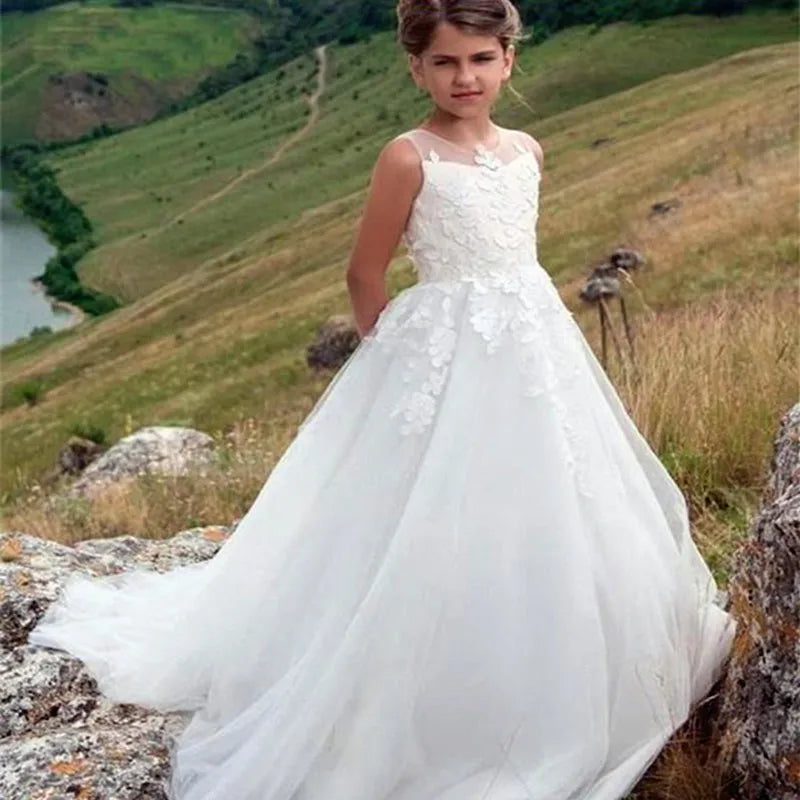 This divine princess flower girl dress exudes elegance with its ball gown silhouette, lace detailing, and sleeveless design. The tulle skirt adds a touch of whimsy, making it a perfect choice for pageants, weddings, or first communion ceremonies for girls.