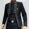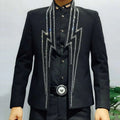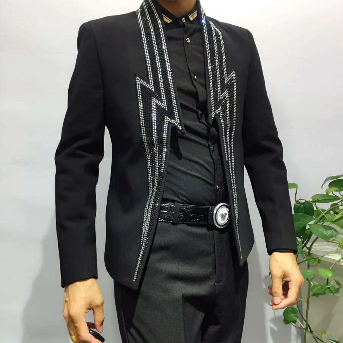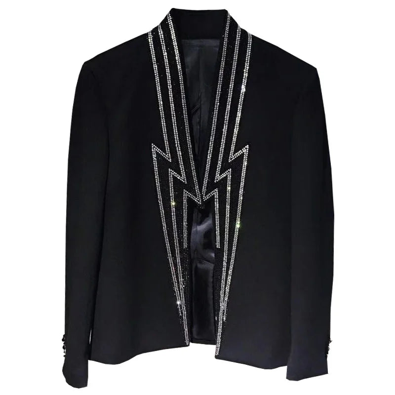 Make a statement with this luxurious men's jacket, perfect for upscale events and parties. This heavy industry-inspired blazer features intricate lightning rhinestone embellishments, making it a standout piece for club outings or stage performances. Elevate your style and exude confidence with this unique and eye-catching garment.