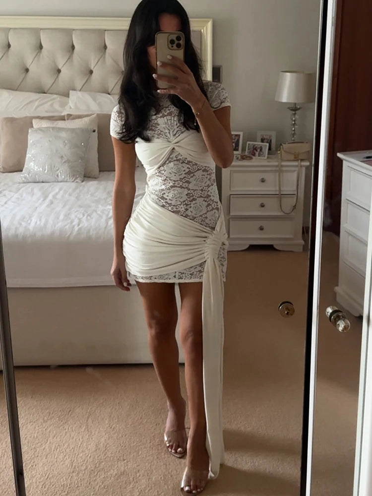 Step out in style with this stunning patchwork sheer lace dress for women. Featuring a sleek round neck and elegant blue tones, this bandage dress combines sexy sheer lace panels with a slim, figure-hugging silhouette. Perfect for spring parties, clubs, or any special occasion, this elegant and fashionable vestido offers a sophisticated yet alluring look that is sure to turn heads wherever you go.