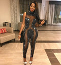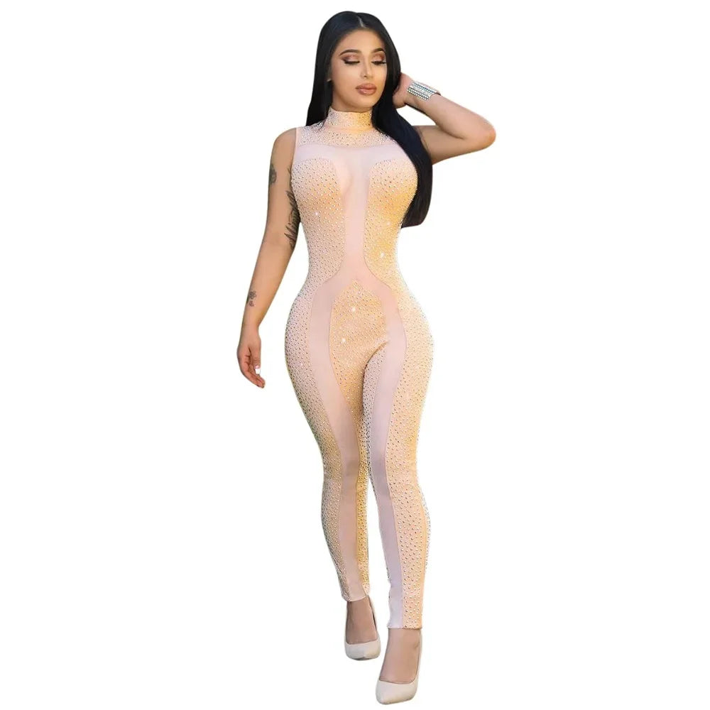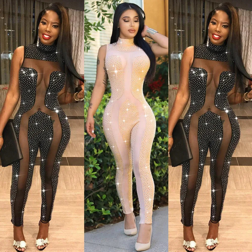 Turn heads wherever you go in this Hot Sale Sexy Transparent Jumpsuit, featuring embedded diamonds for a touch of luxury and sparkle. Designed to smooth and slim your silhouette, this two-tone women's fashion piece is perfect for nightclubs and bold parties. The sheer, figure-hugging design accentuates your curves, making you the center of attention at any event.
