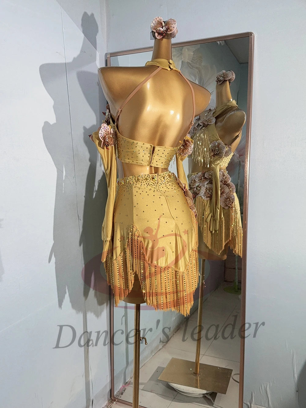 Latin Dance Costume AB Stone Female Adult Children High end Customized Gold Dress Flower Collar Samba Performance Dress