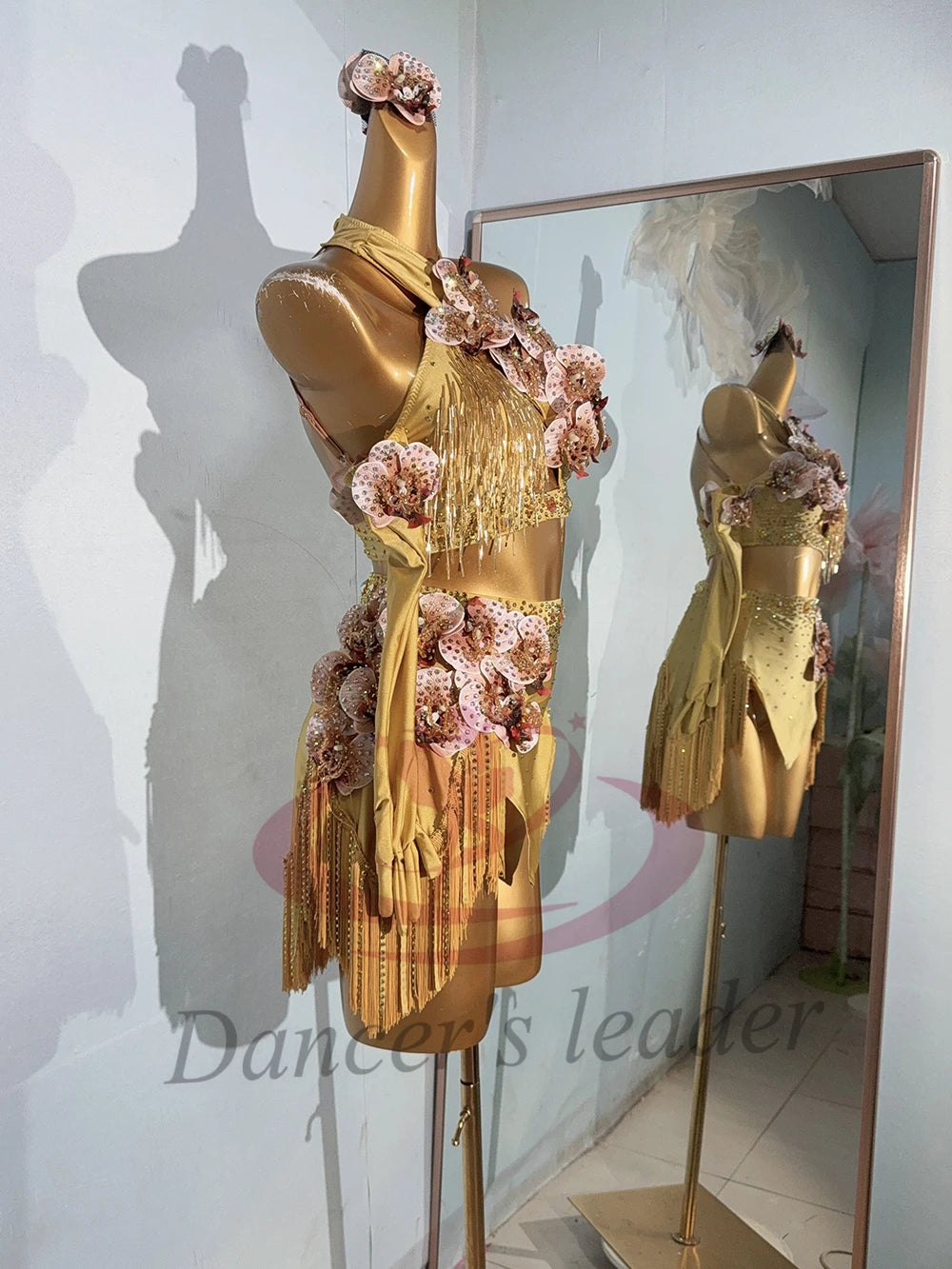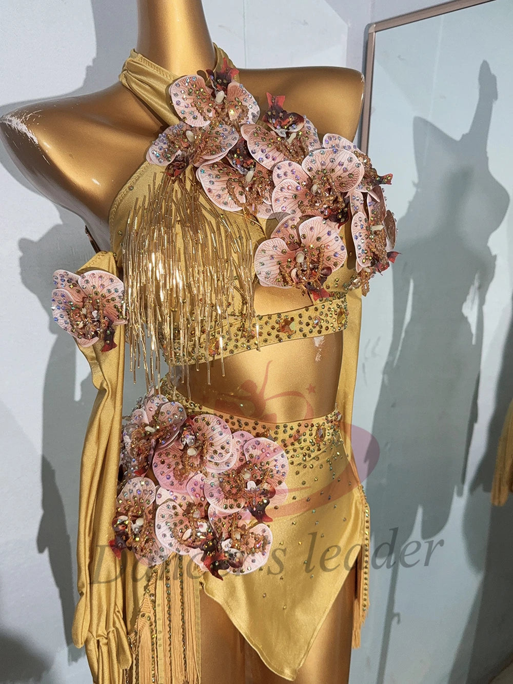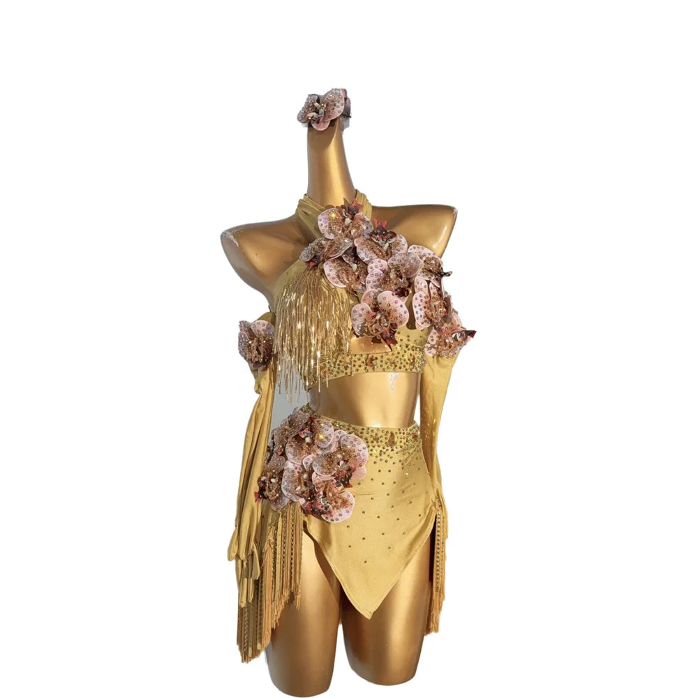 This high-end, custom Latin dance costume — Latin Dance Costume AB Stone Female Adult & Children High-End Customized Gold Dress Flower Collar Samba Performance Dress — is designed for performers who want glamorous stage presence, technical durability, and tailored comfort. Suitable for both adults and children, the costume blends couture detailing with dance-engineered construction to support Samba, Salsa, Rumba, and other Latin routines.
