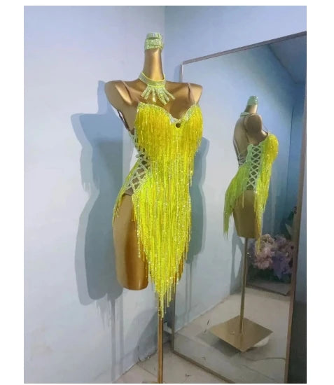 A high‑end, made‑to‑measure Latin dress designed specifically for children competing in Cha‑Cha and Tango. Features include a secure, performance‑grade construction, thick tassel embellishments to emphasize footwork and hip action, and competition‑appropriate coverage and durability.