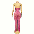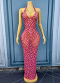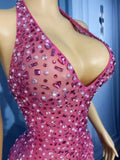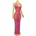 Luxurious Shining Rhinestones Sexy V-neck Rosy Mesh Dress Holiday Journey Seaside Outfit Evening Cocktail Party Gown Stage Wear
