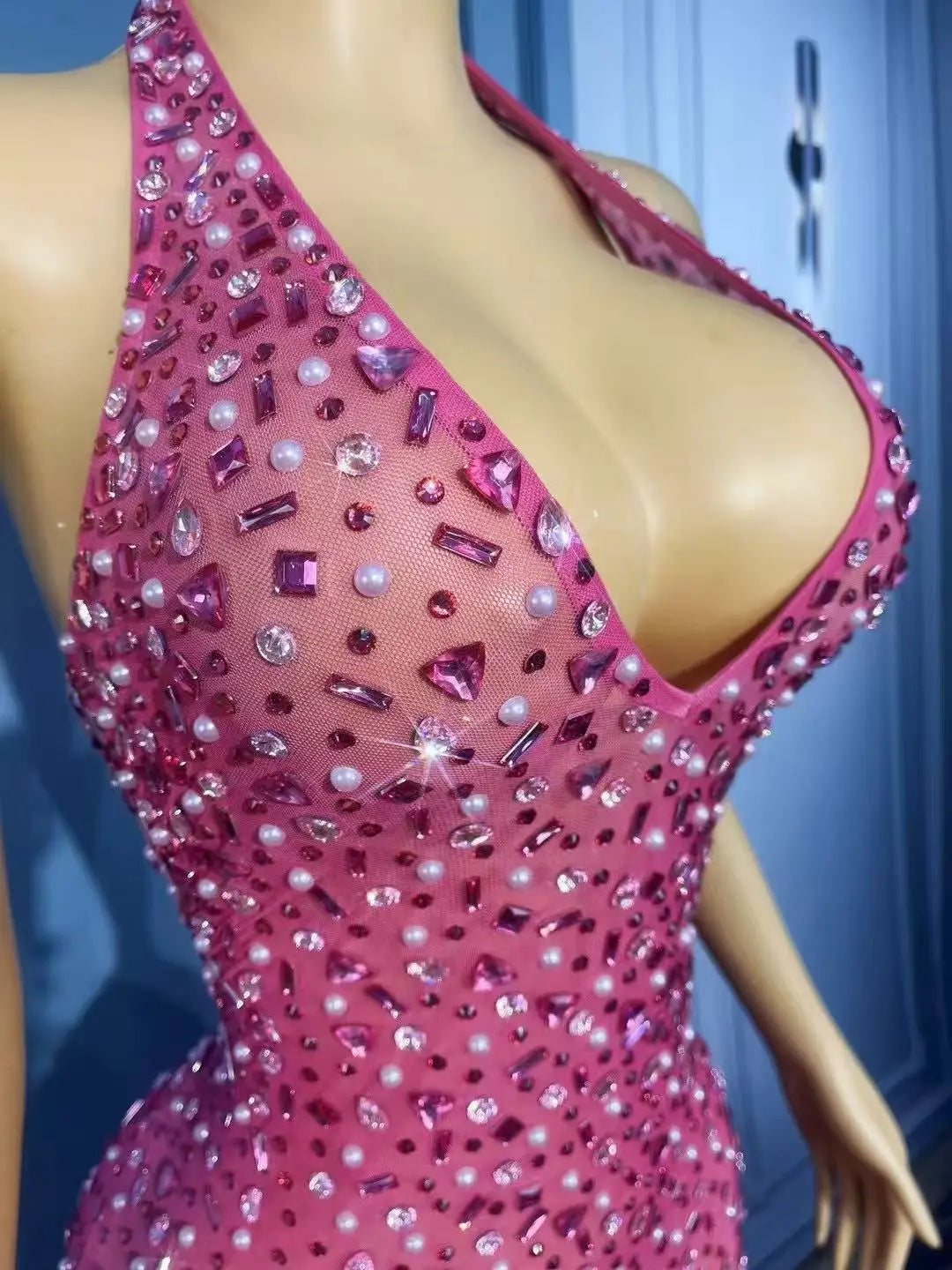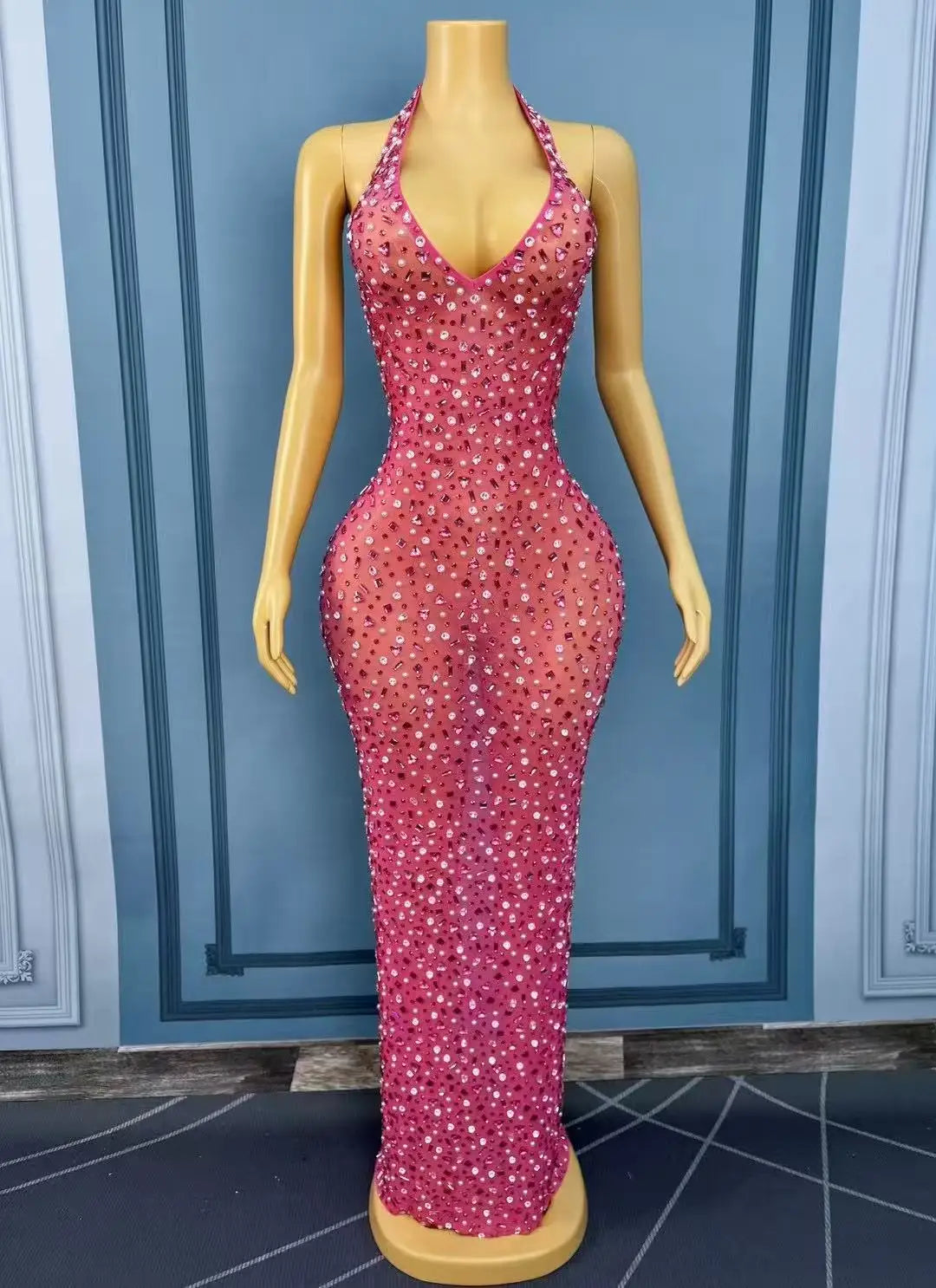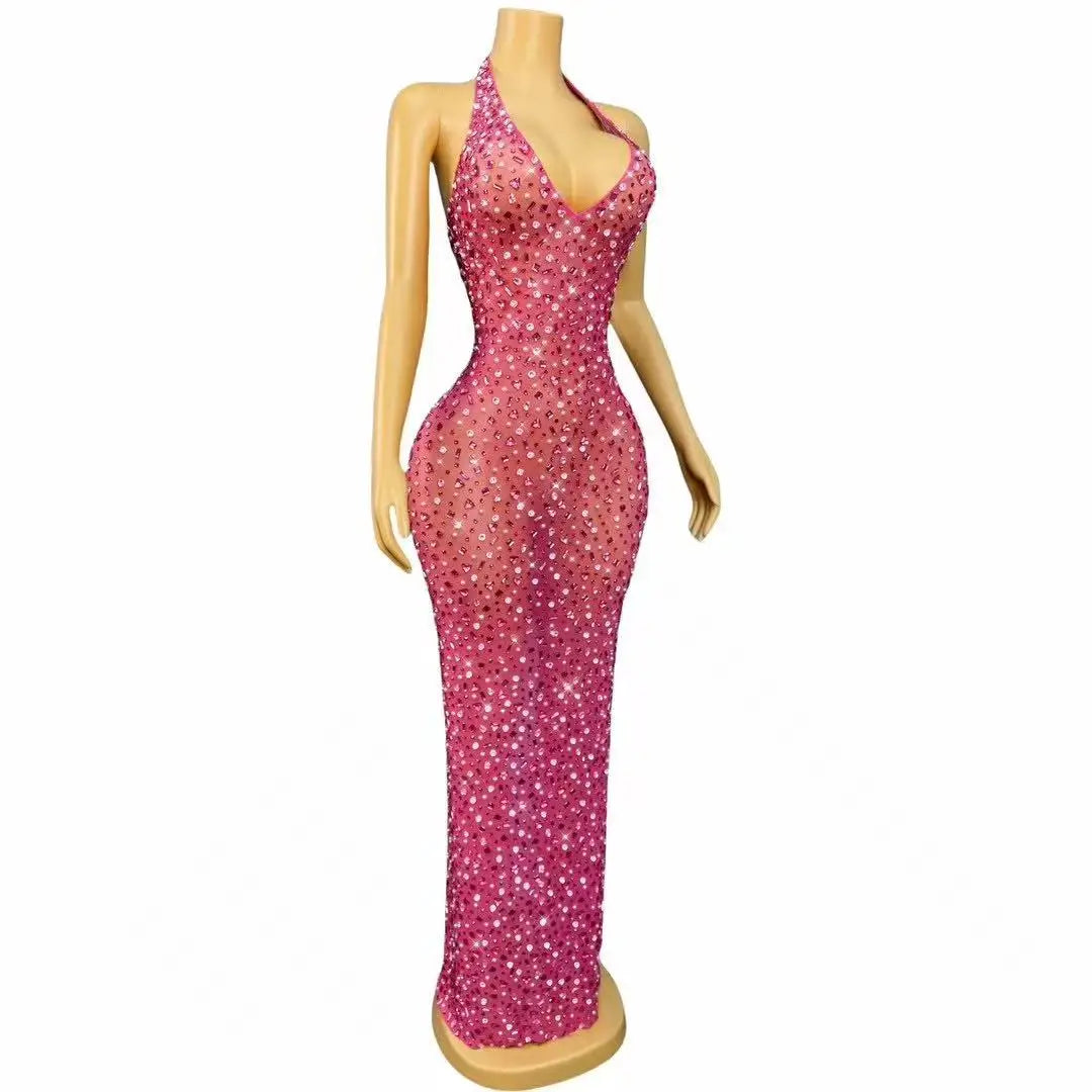 Embrace radiant glamour with this Luxurious Shining Rhinestones Sexy V-neck Rosy Mesh Dress, an enchanting gown designed for seaside holidays, evening cocktail parties, photoshoots, and stage performances. The dress pairs a delicate rosy-hued mesh with masterfully placed rhinestones to create a romantic, luminous look that flatters in both daylight by the shore and under warm event lighting.
