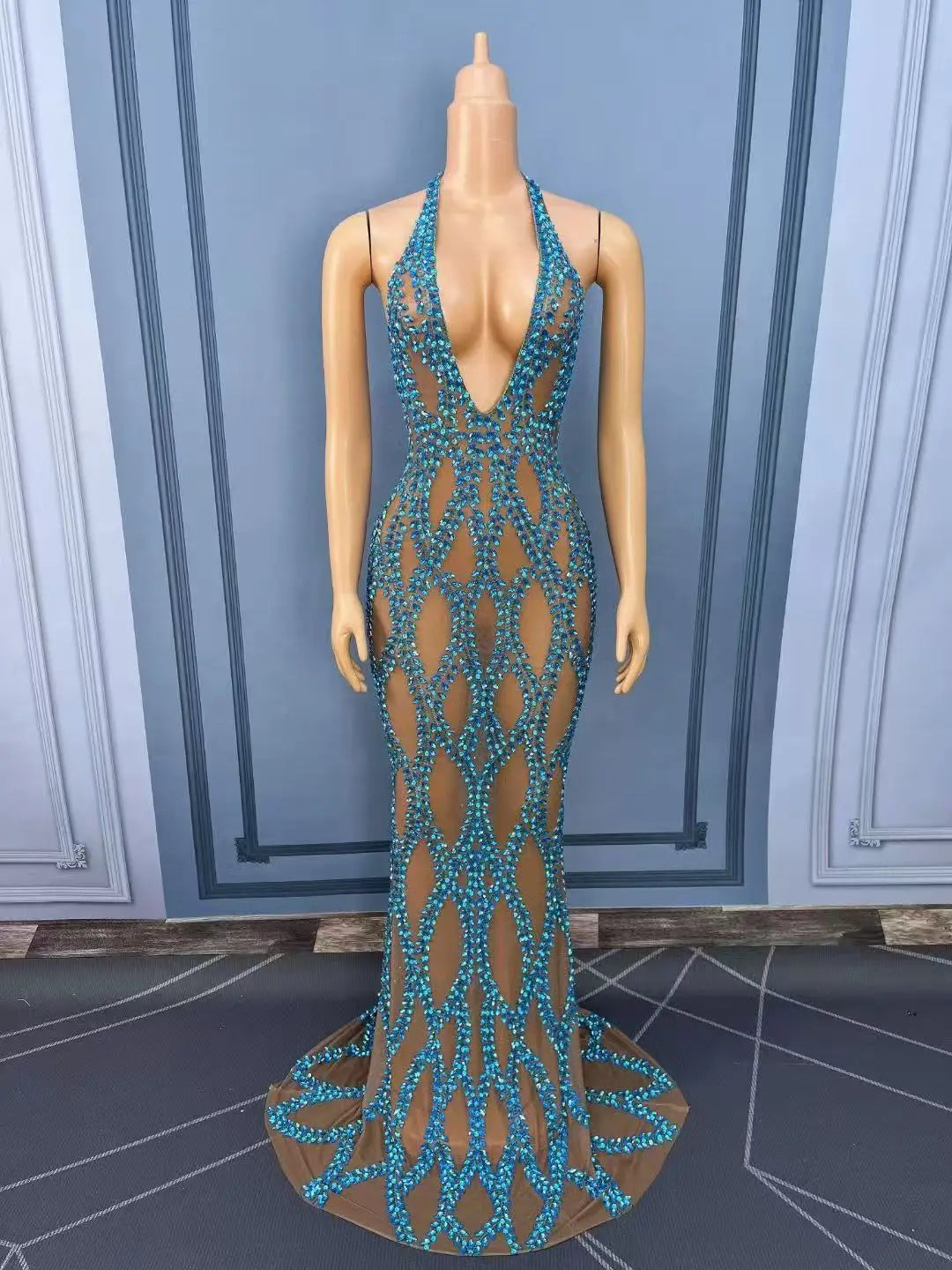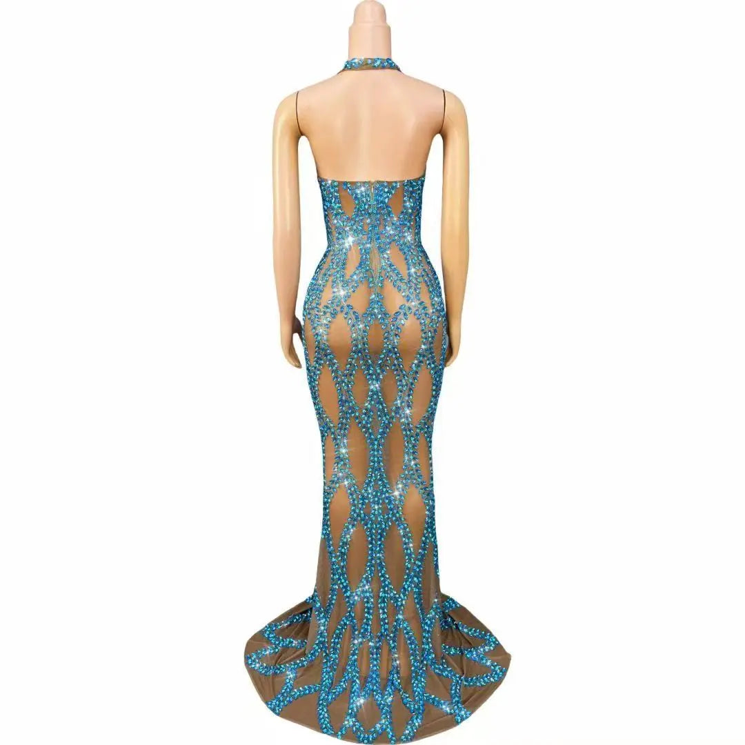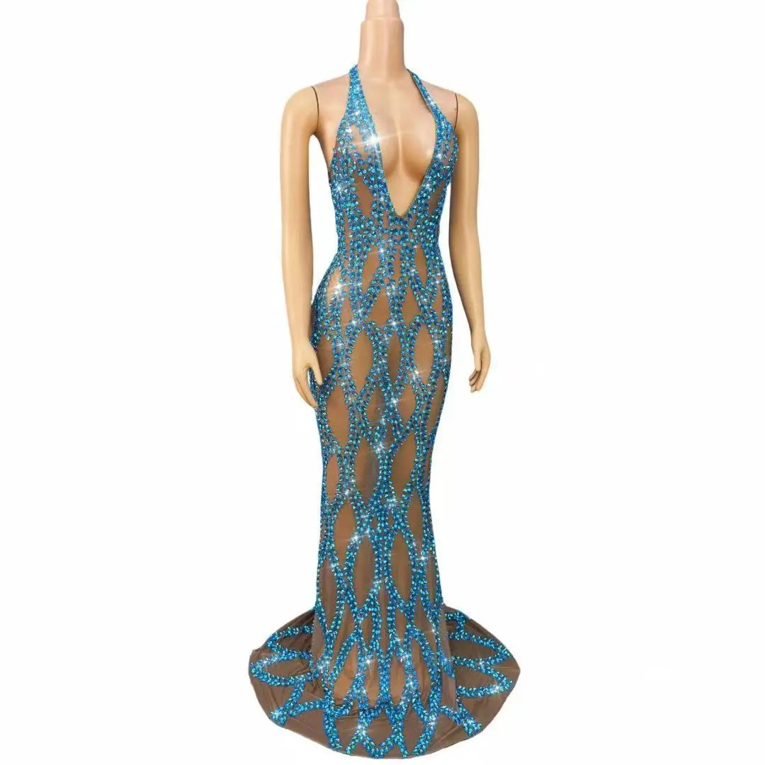 Luxurious Sparkly Blue Rhinestones Sexy V-neck Backless Nude Mesh Dress Evening Prom Elegant Gown Red Carpet Stage Wear