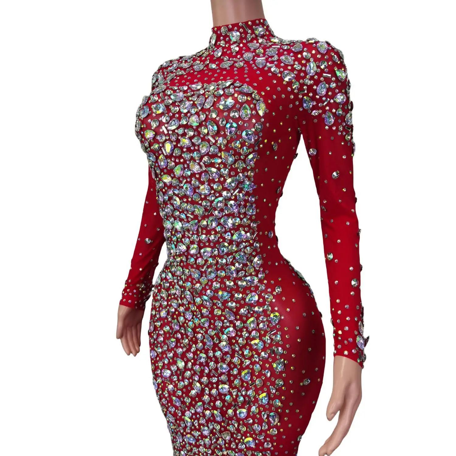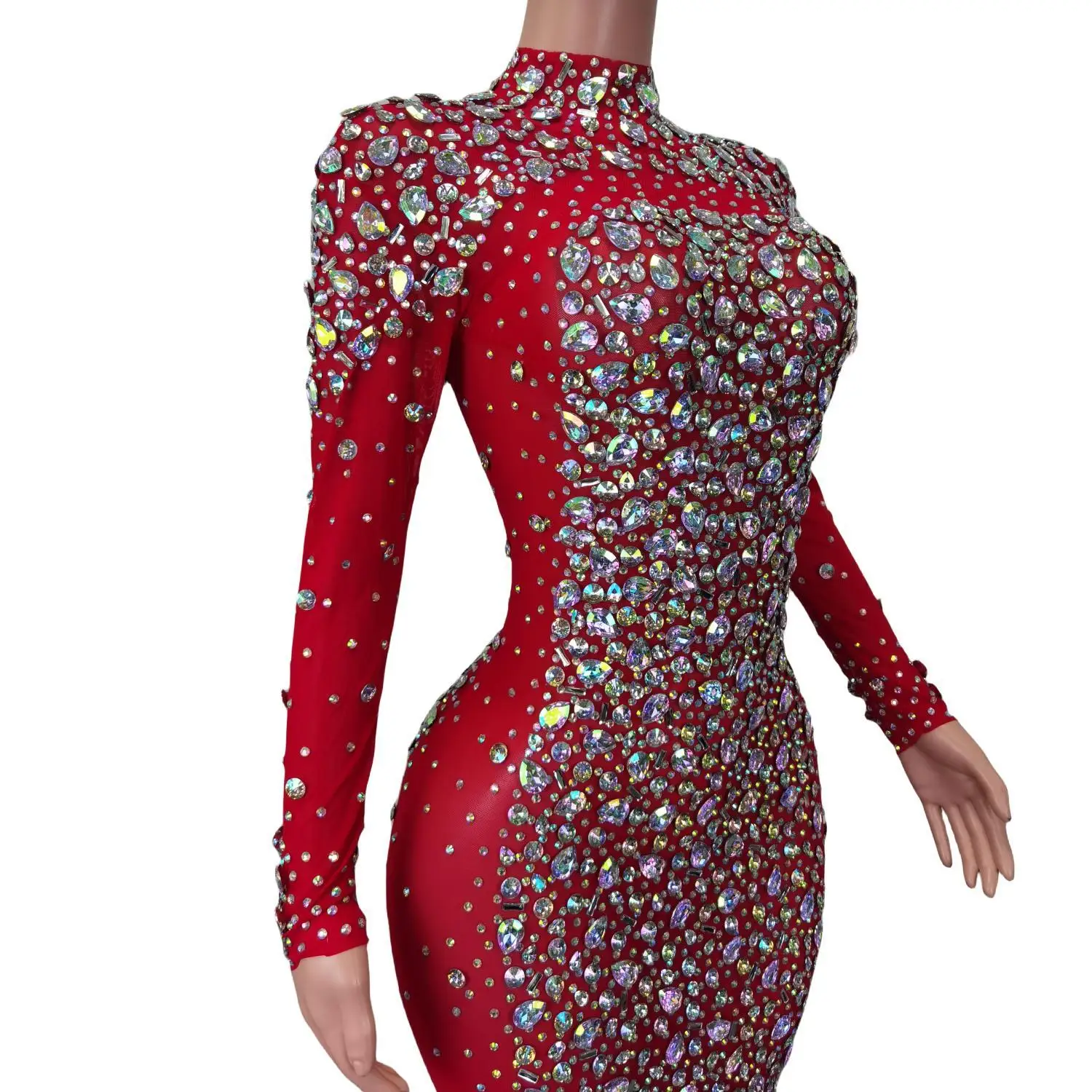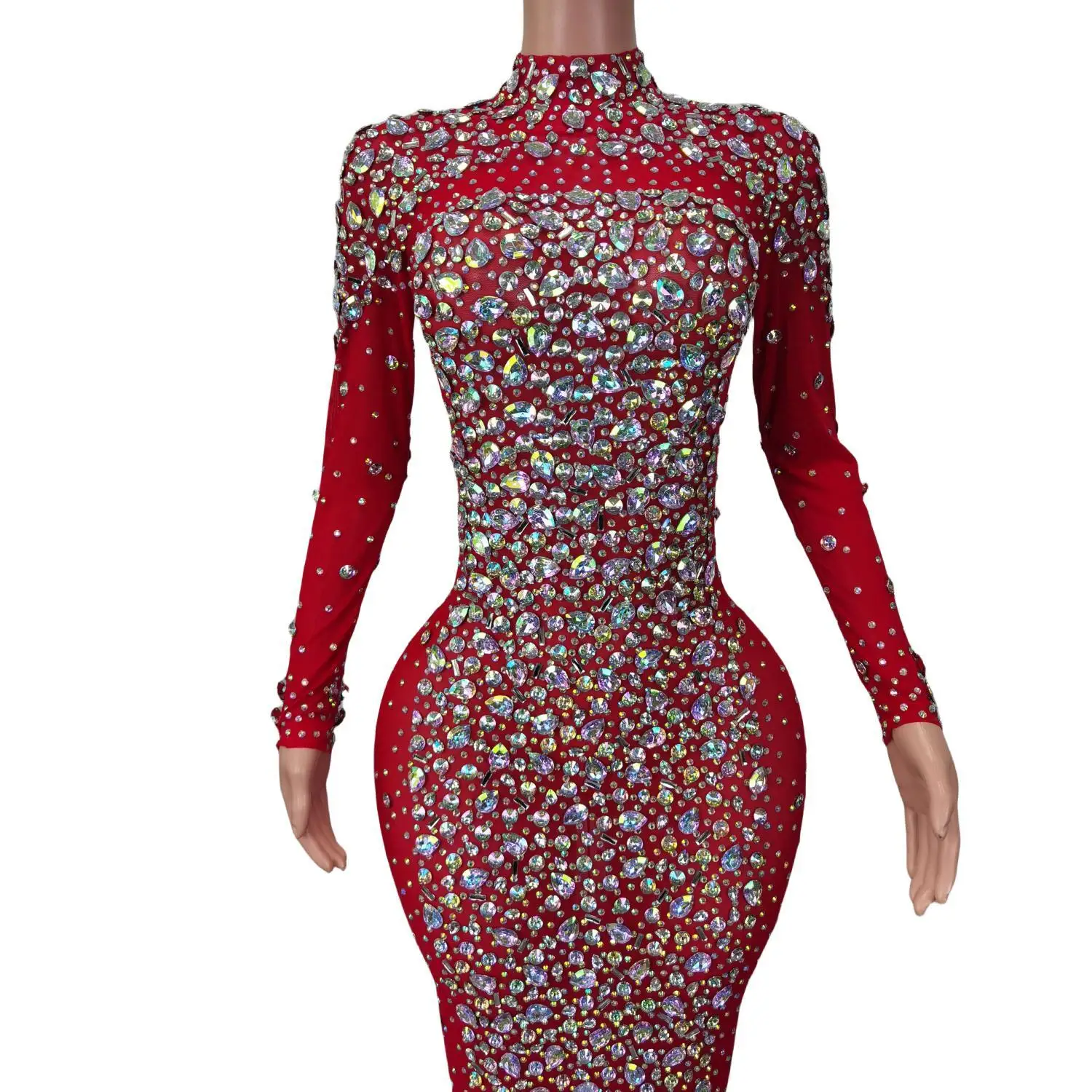 Luxury Celebrate Photo Shoot Props Sparkly Rhinestone Long Dress for Women Elegant Birthday Party Queen Red Dresses Cuixing