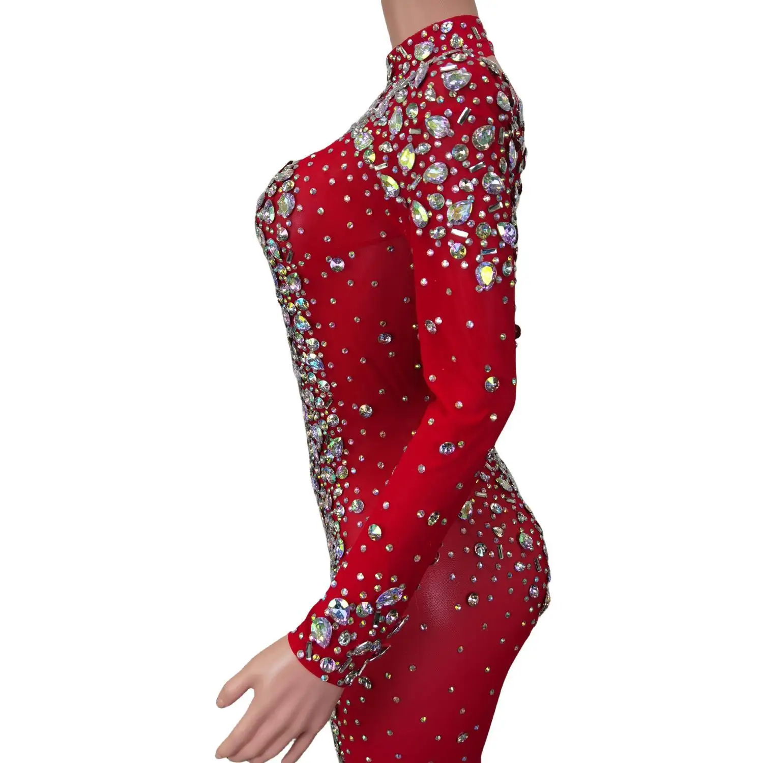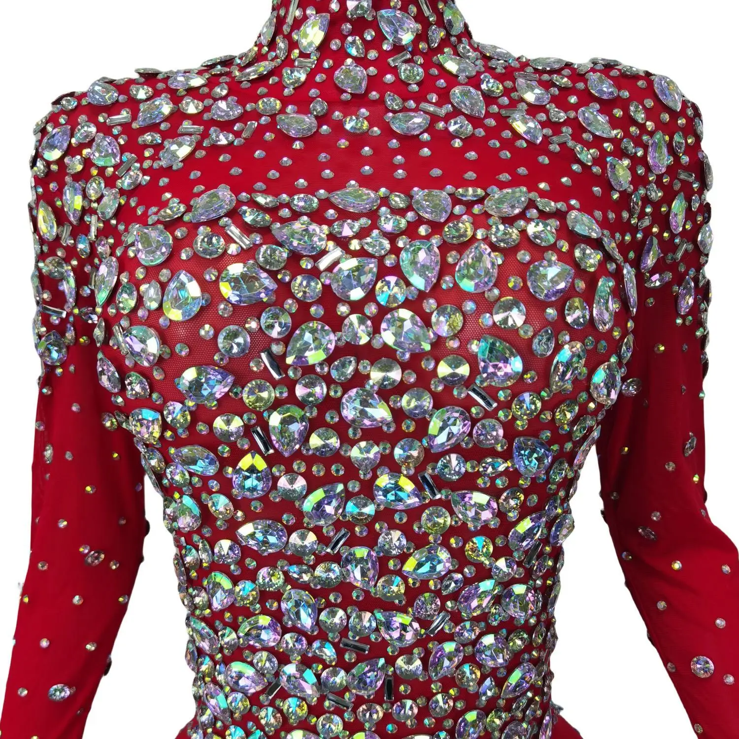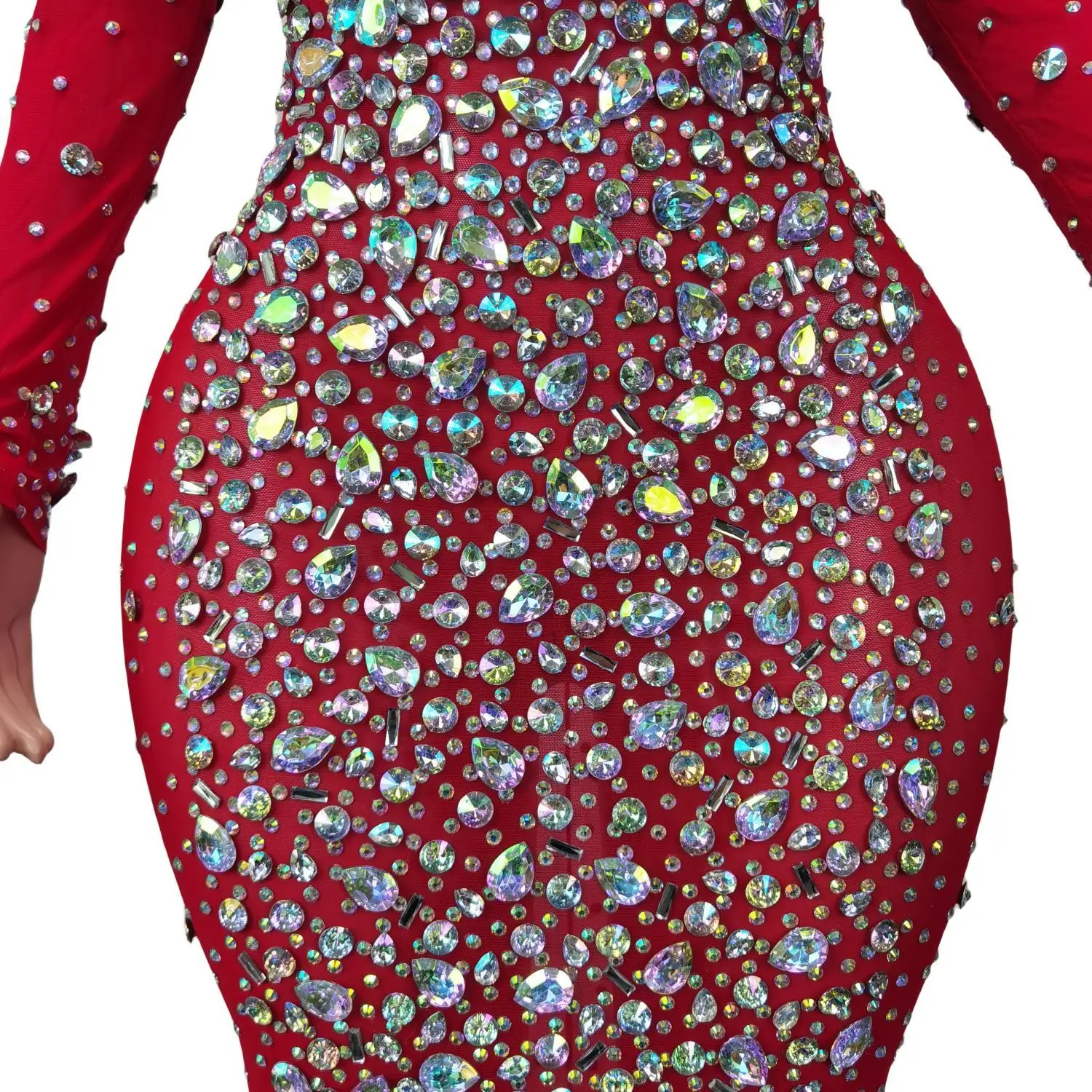 Luxury Celebrate Photo Shoot Props Sparkly Rhinestone Long Dress for Women Elegant Birthday Party Queen Red Dresses Cuixing