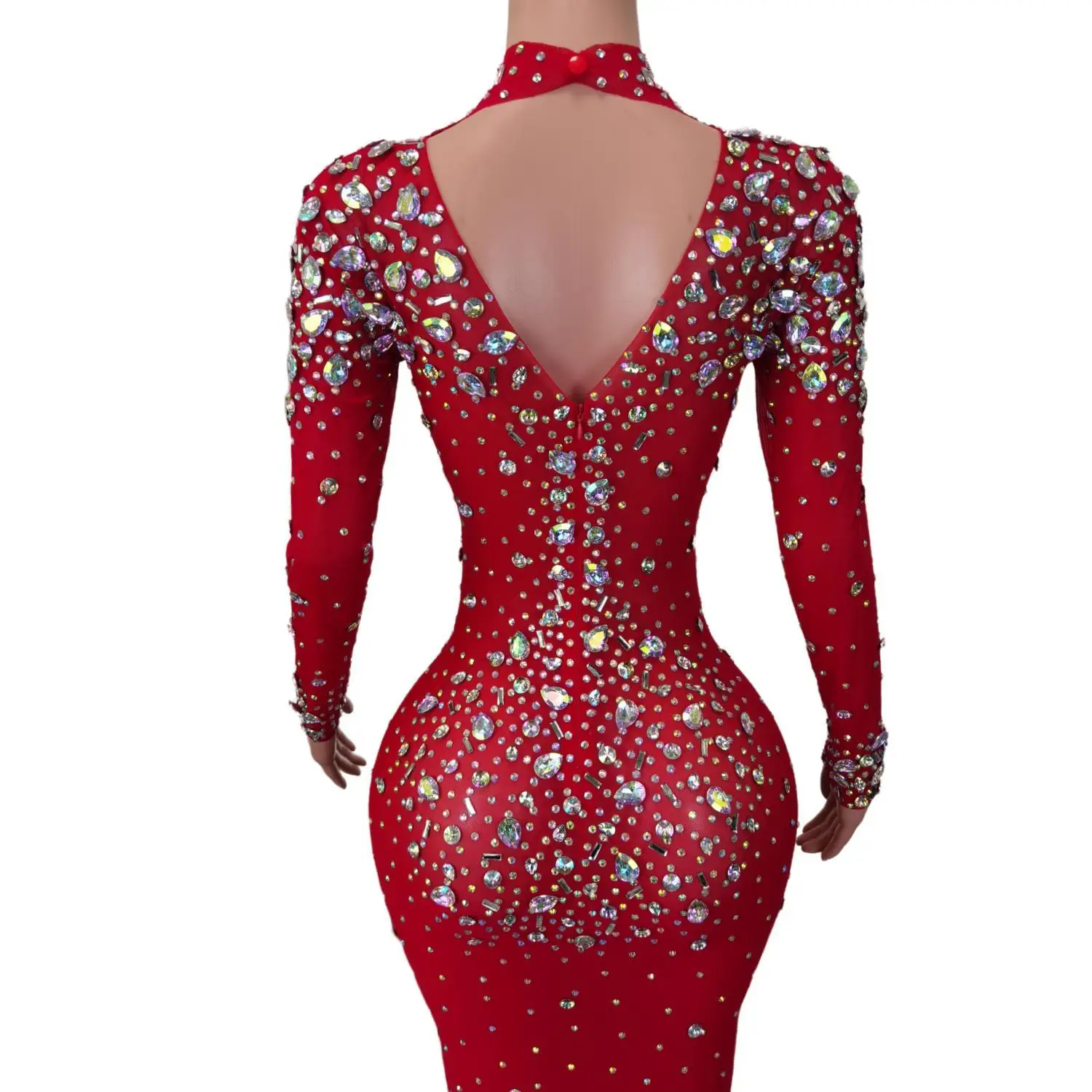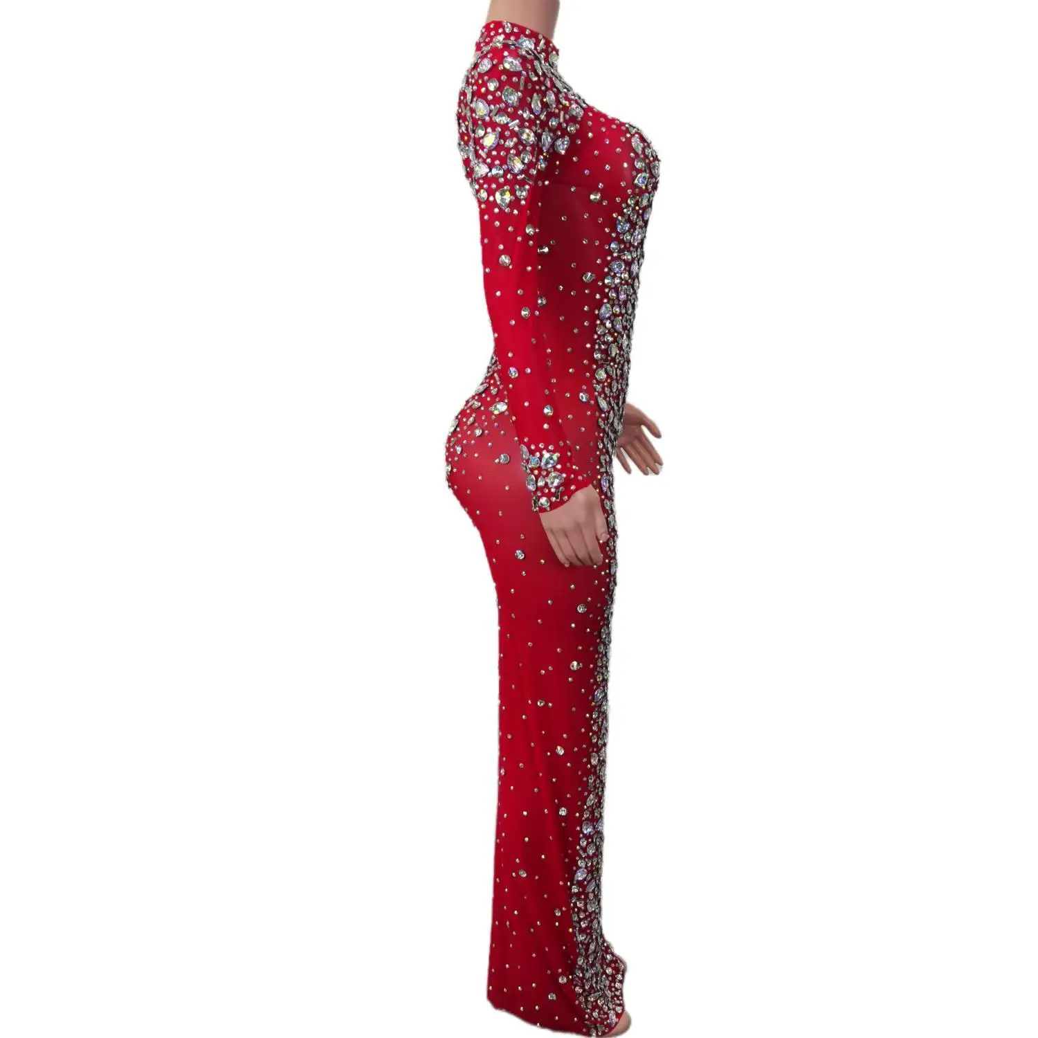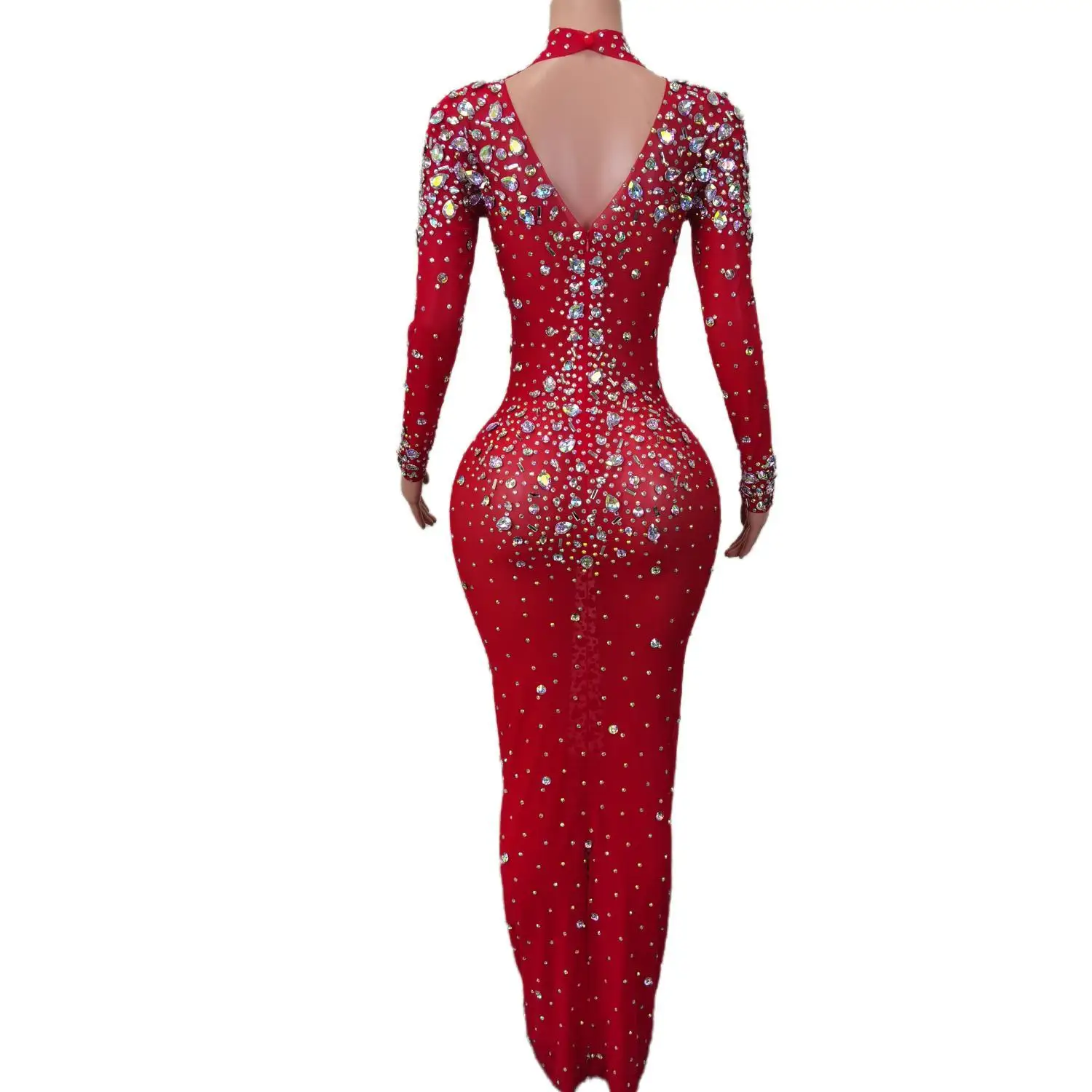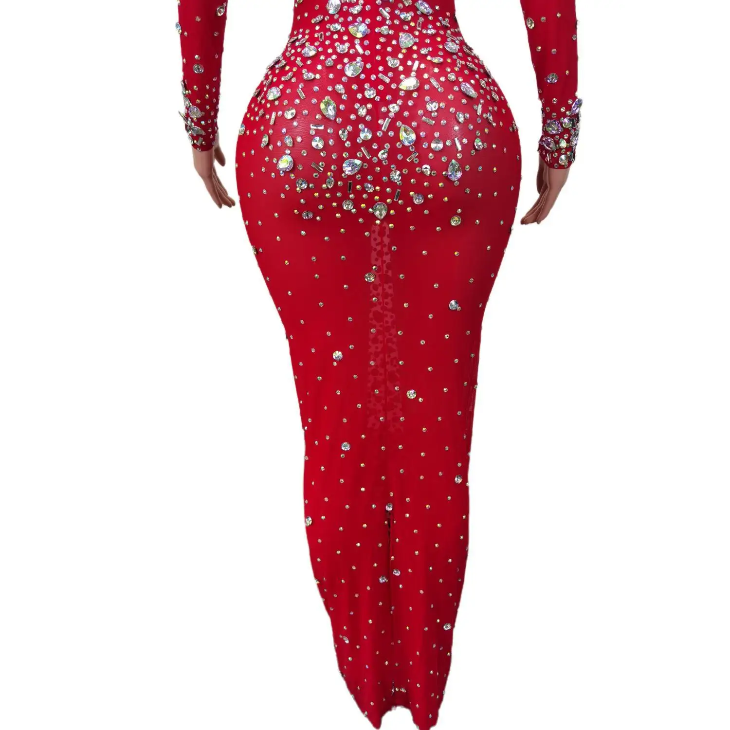 Luxury Celebrate Photo Shoot Props Sparkly Rhinestone Long Dress for Women Elegant Birthday Party Queen Red Dresses