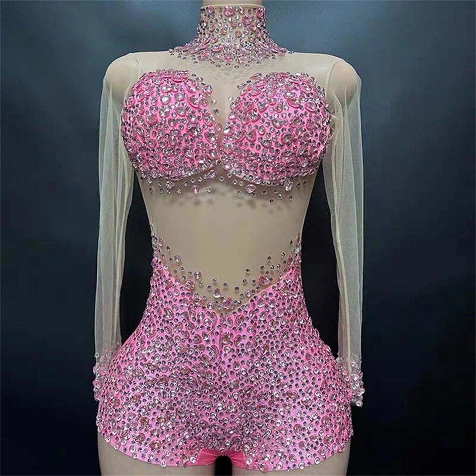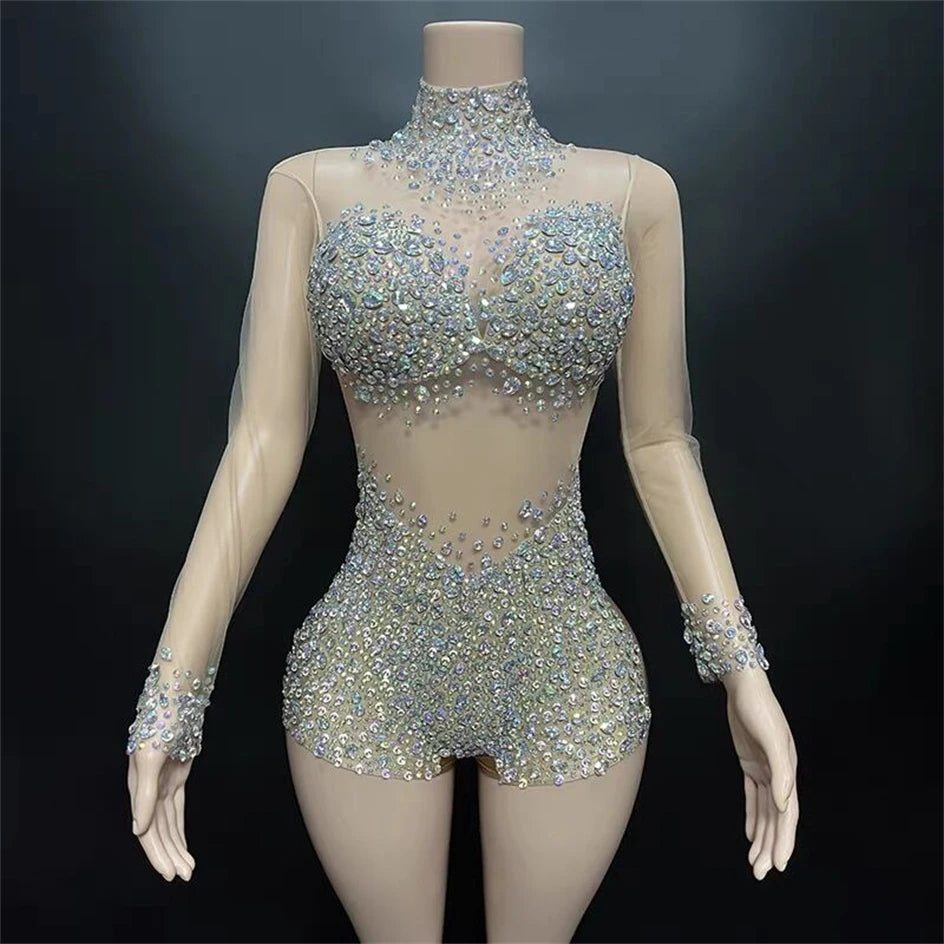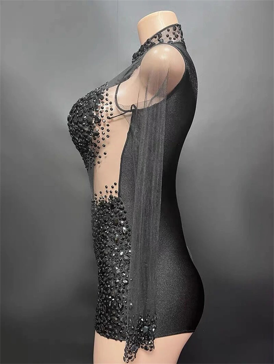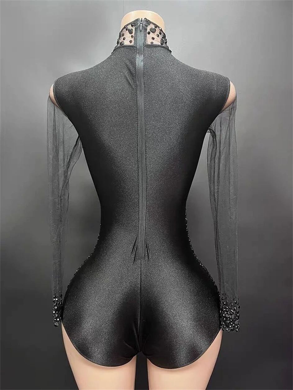 Make an unforgettable entrance in this luxurious black mesh bodysuit, adorned with sparkling crystals for dazzling effect. The sexy, see-through design is perfect for evening parties, performances, nightclubs, or stage appearances. Ideal for singers and dancers, this statement playsuit combines bold style with elegant glamour, ensuring you shine under the spotlight.