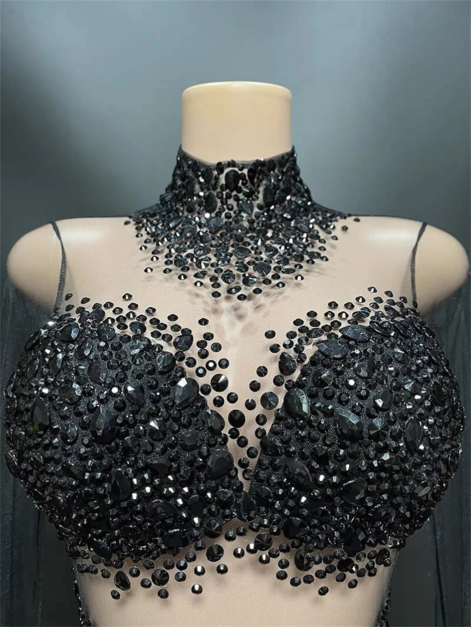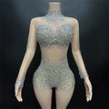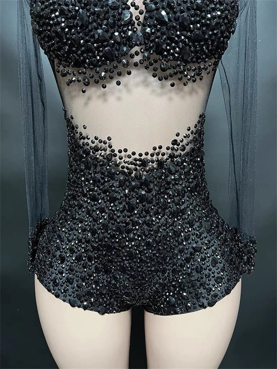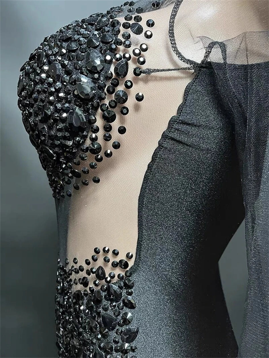 Luxury Crytrals Black Sexy See Through Mesh Bodysuit Evening Party Performance Costume Nightclub Singer Dancer Stage Playsuits
