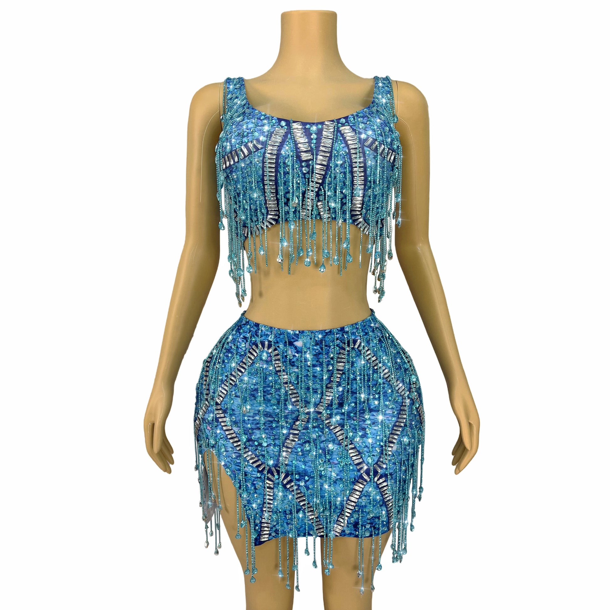 Luxury Fashion Singer Dancer Show Shiny Rhinestone Tassel Costume Suit Skirt Ladies Party Celebration Costume