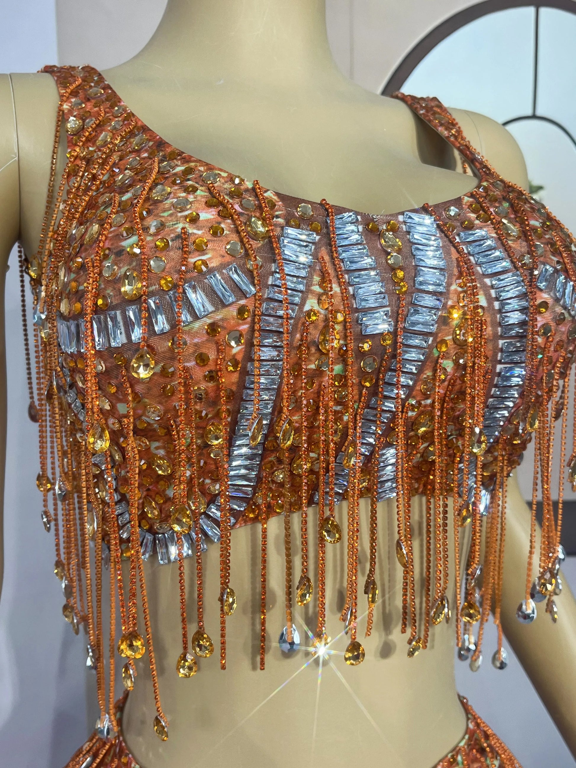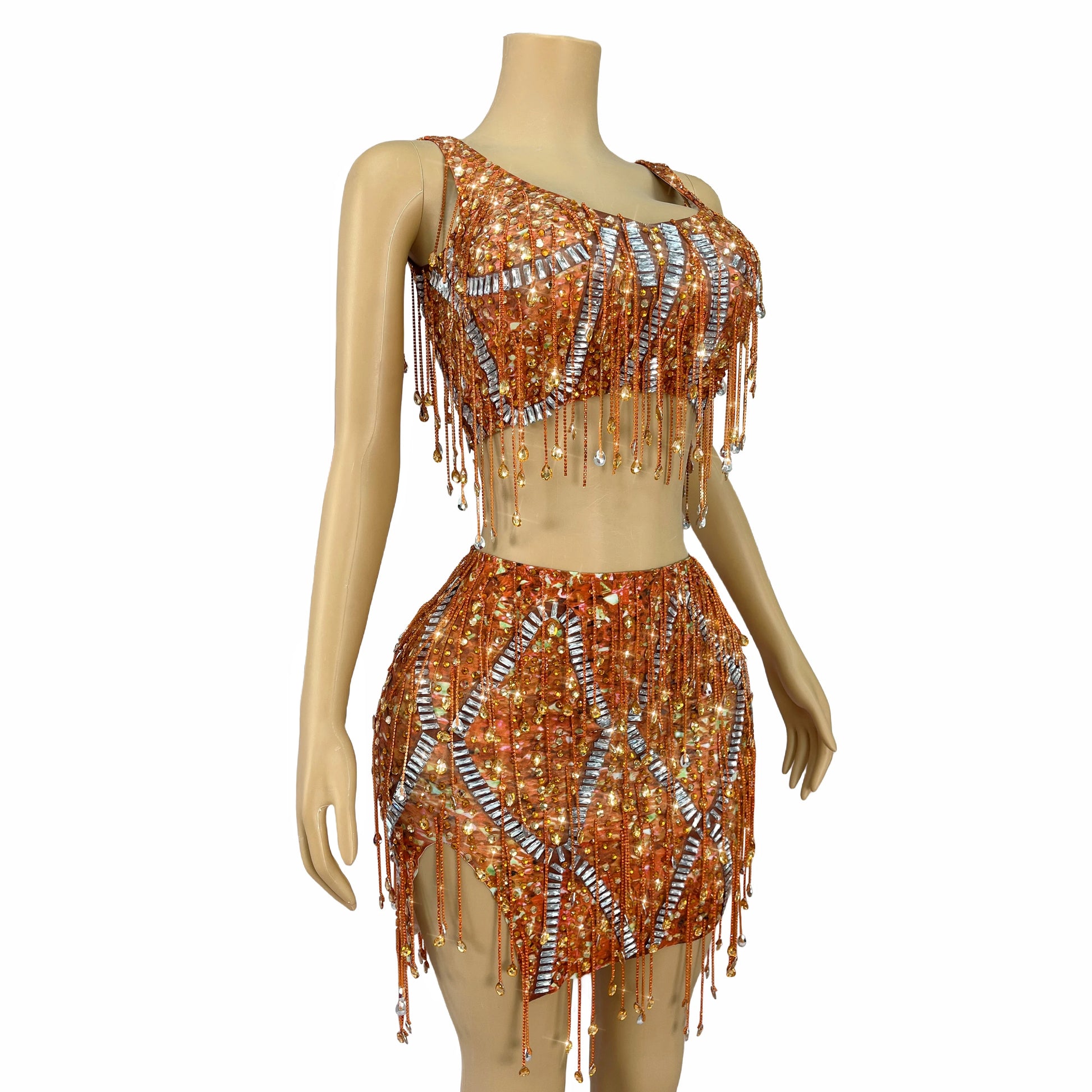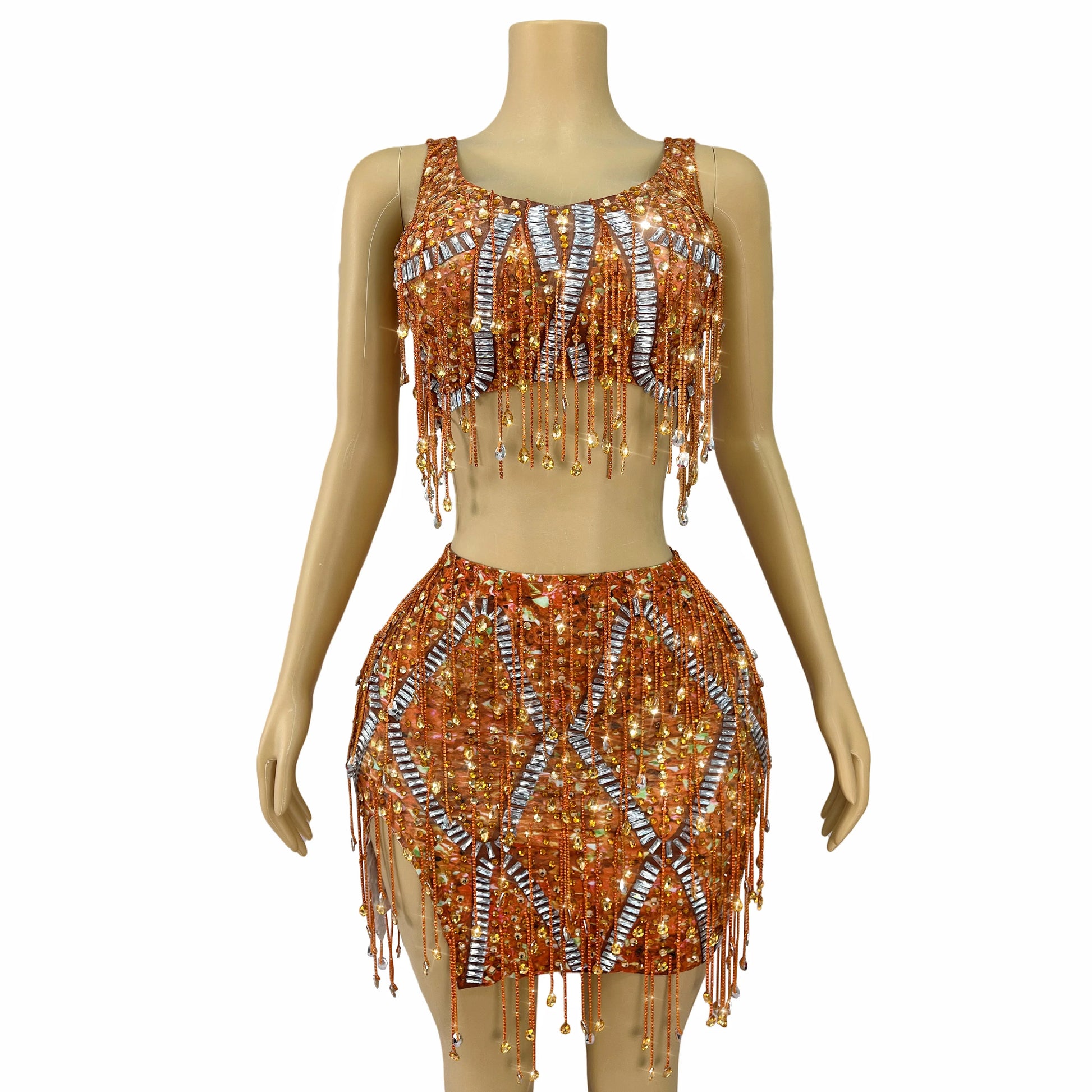 Shine on stage or at your next event with this luxury fashion costume set for ladies. Designed for singers, dancers, and performers, this dazzling outfit features sparkling rhinestone accents and elegant tassel details that catch the light with every move. The stylish suit and matching skirt offer a glamorous silhouette perfect for parties, celebrations, or show performances. Elevate your presence and exude confidence in this eye-catching and unforgettable costume.