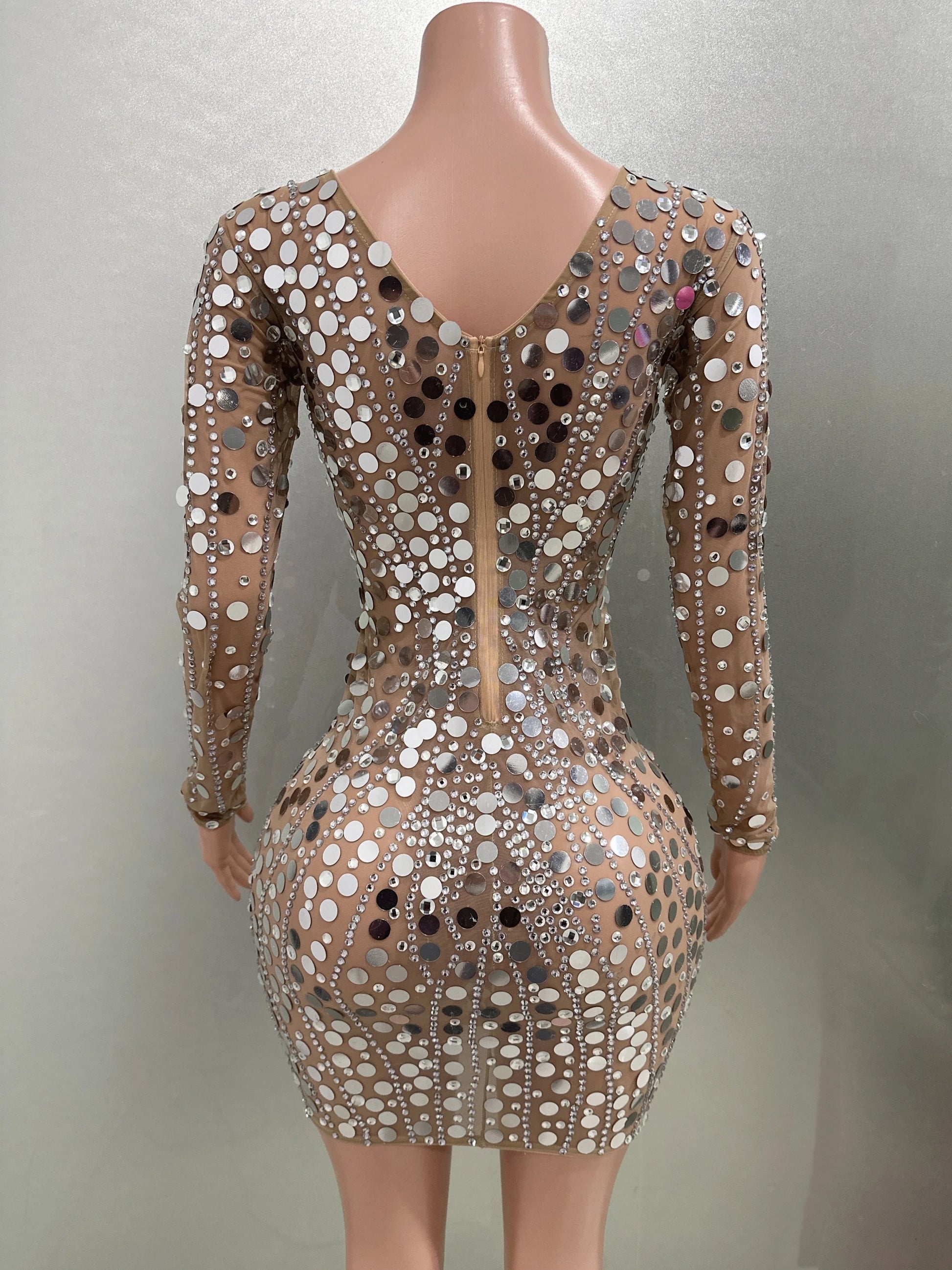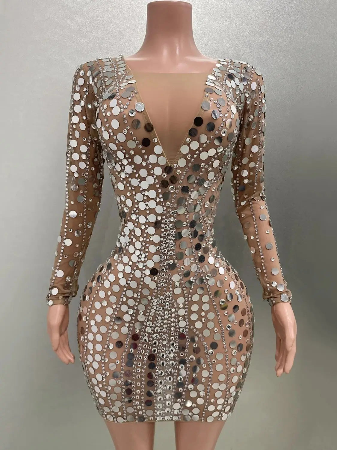 Dazzle the crowd in this luxury mirror-surface sequin sheath dress, designed for a bold, sexy look. Featuring a see-through design that catches the light from every angle, this glamorous evening party and performance costume is perfect for nightclub singers, dancers, and stage wear. Make a stunning entrance and shine with confidence at any special event.