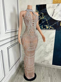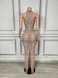 Luxury Pearl Chain Rhinestones Long Dress Women Sexy Mesh Dress Singer Stage Wear Wedding Birthday Drag Queen Photoshoot Dress