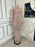 A high‑glamour floor‑length mesh gown adorned with cascading pearl chains and precision rhinestone detailing. Designed for singers, drag performers, brides (after‑party), birthday stars, and photoshoot talent who need couture sparkle, movement, and stage‑ready durability.