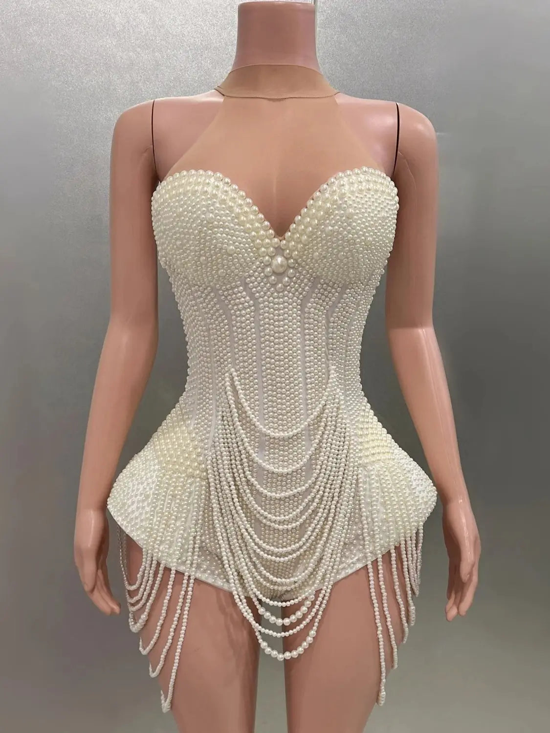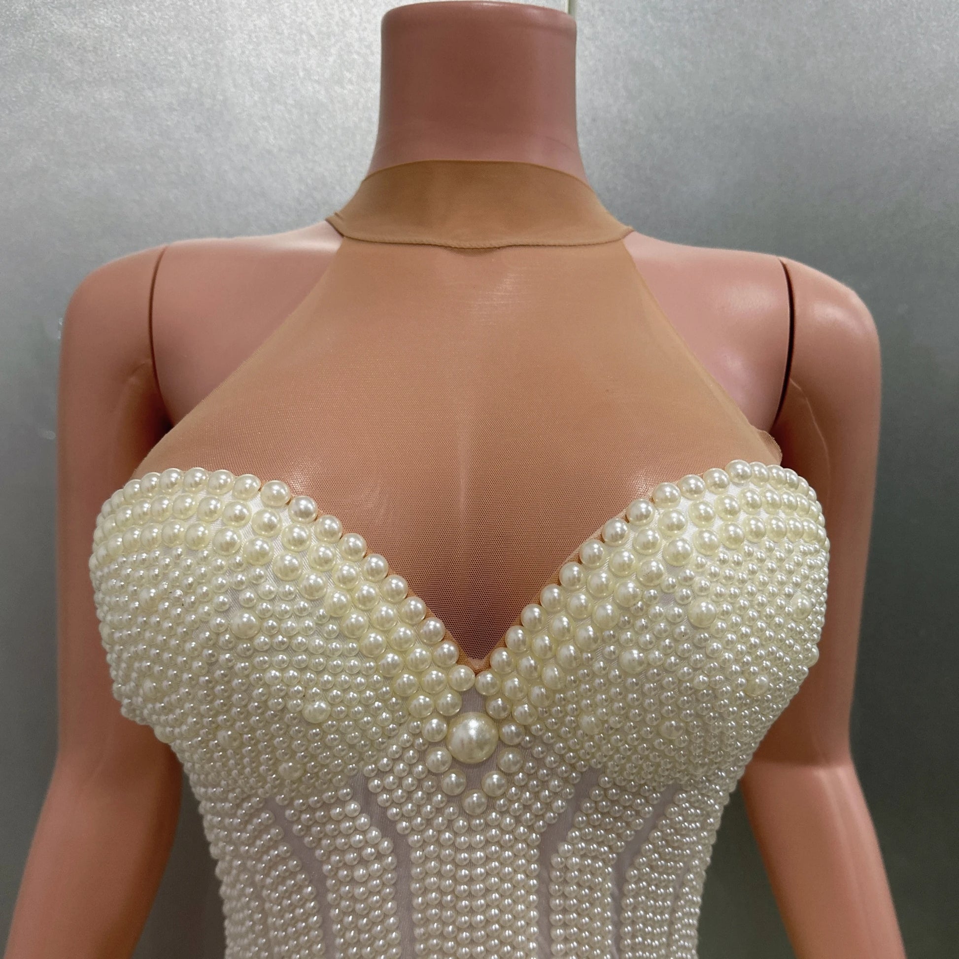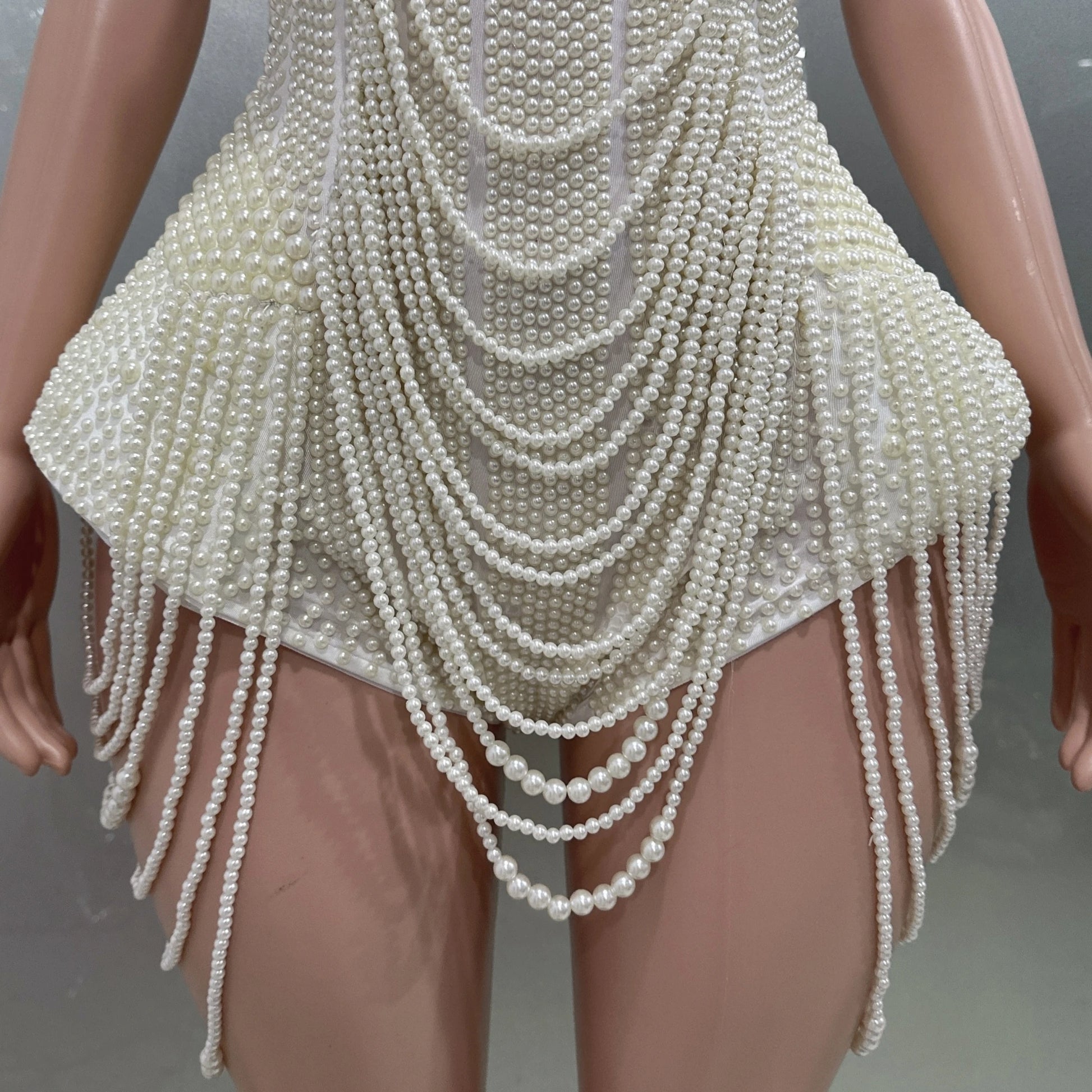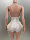 Elevate your evening style with this luxurious halter backless bodysuit, beautifully embellished with intricate pearl beading. The sexy design highlights your figure, making it a standout choice for parties, performance costumes, bar and nightclub events, or singer and dancer stage wear. Eye-catching and elegant, this bodysuit brings a touch of glamour and sophistication to any celebration or performance.