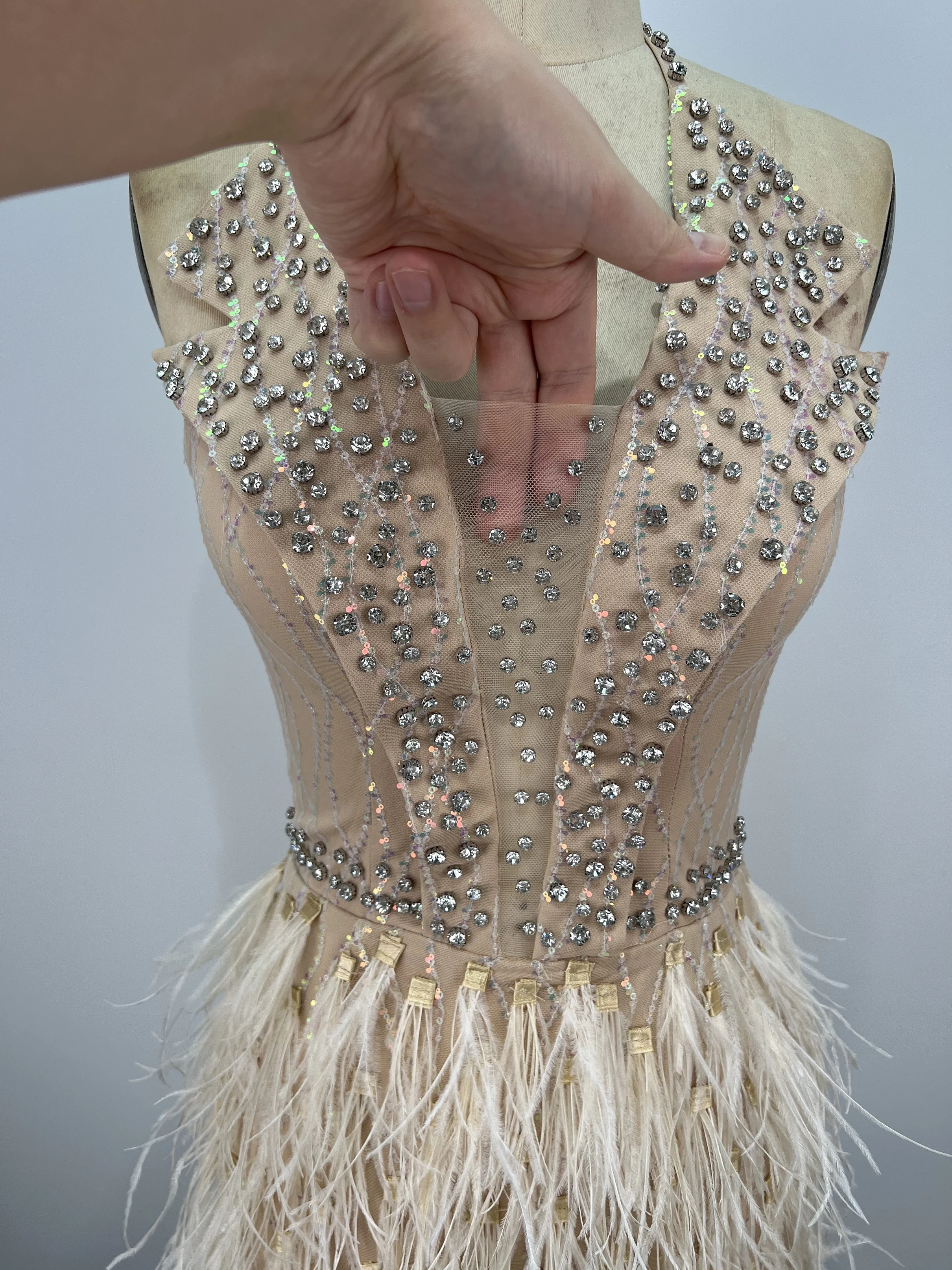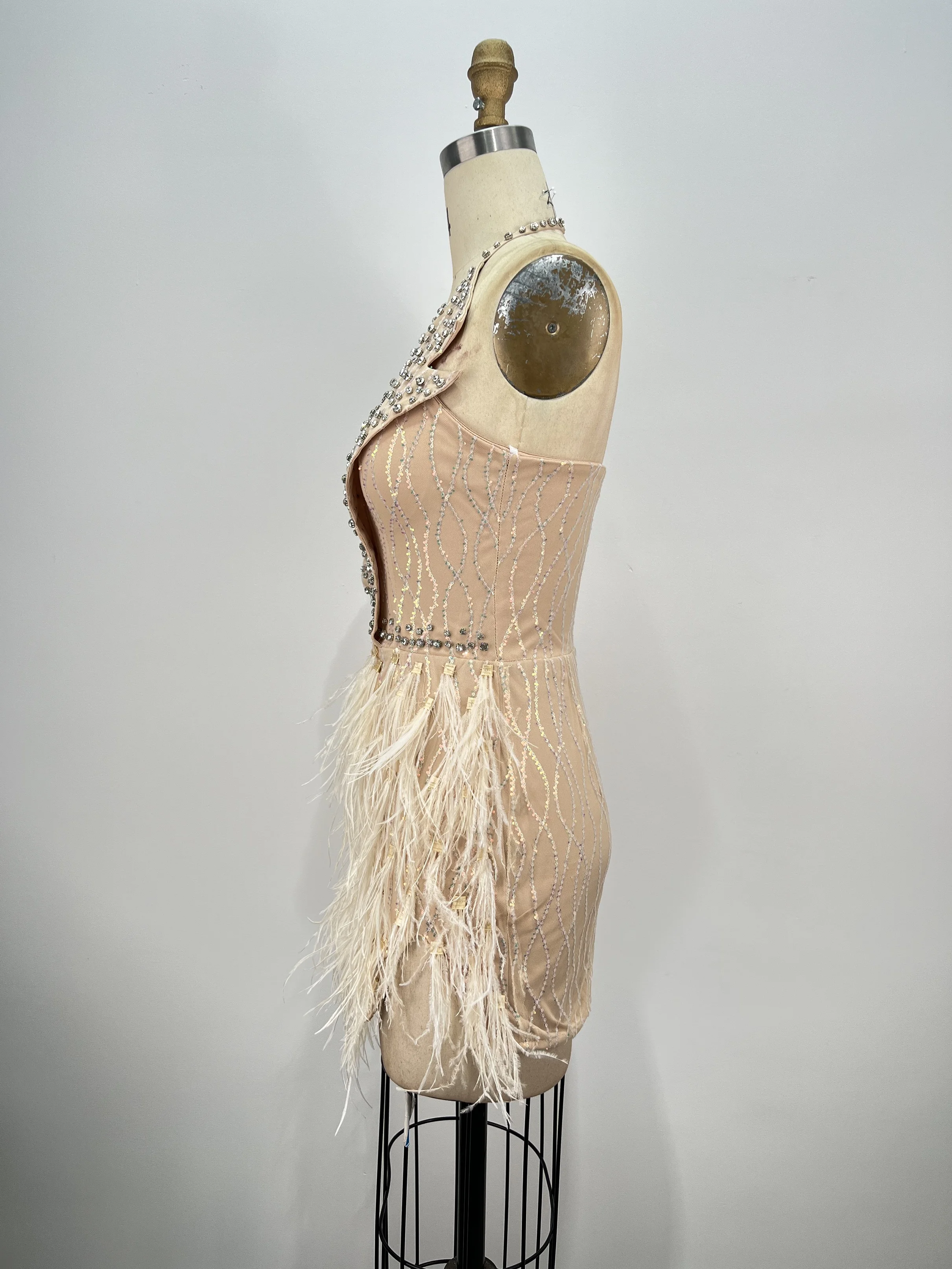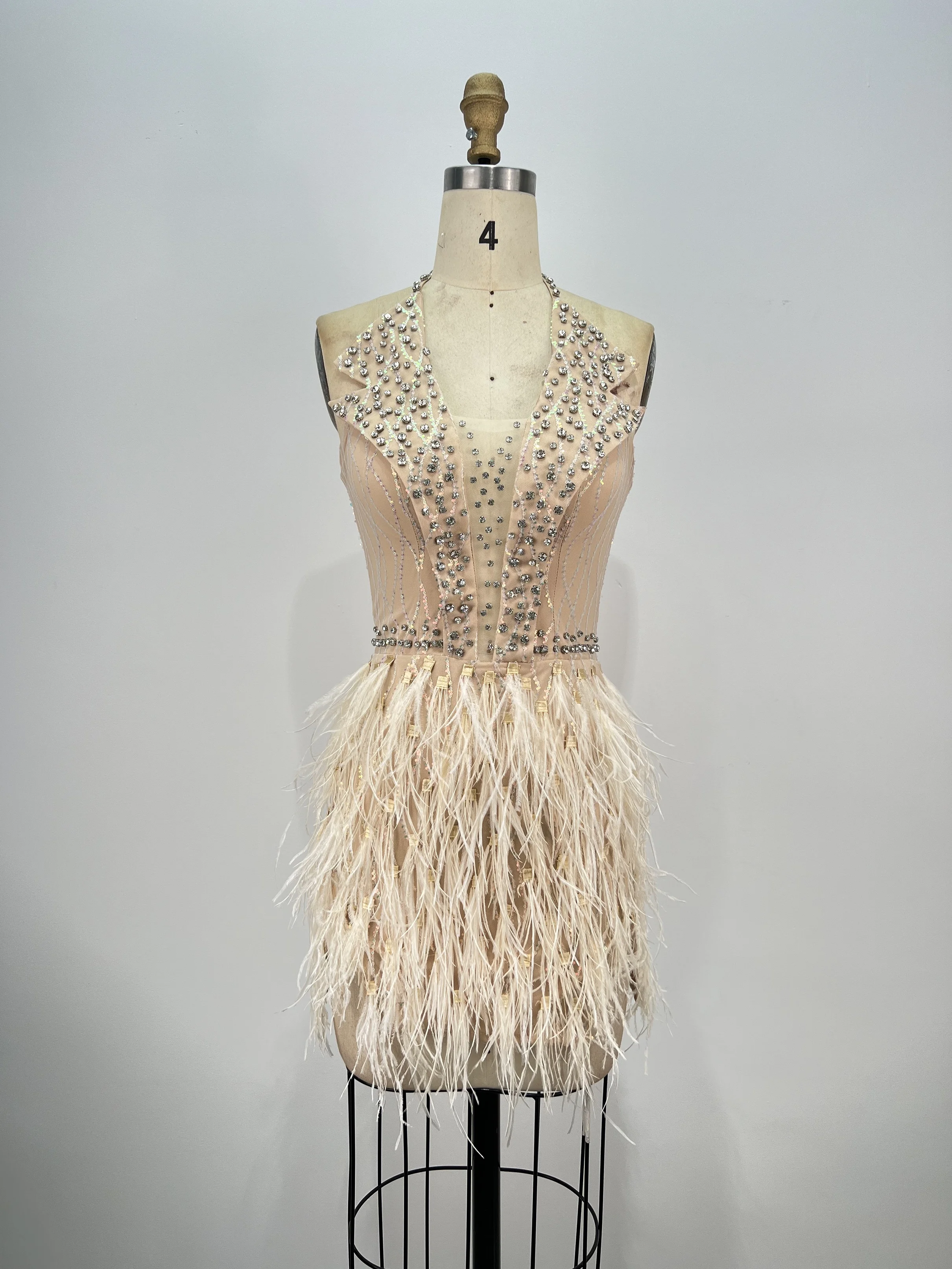 Shine bright in this luxurious mini dress, featuring sparkling rhinestones, shimmering sequins, and elegant feather accents. Designed for the fashion-forward woman, this sexy and glamorous outfit is perfect for nightclubs, parties, stage performances, or singer and dancer roles. Make a statement and captivate every audience with this stunning performance costume.