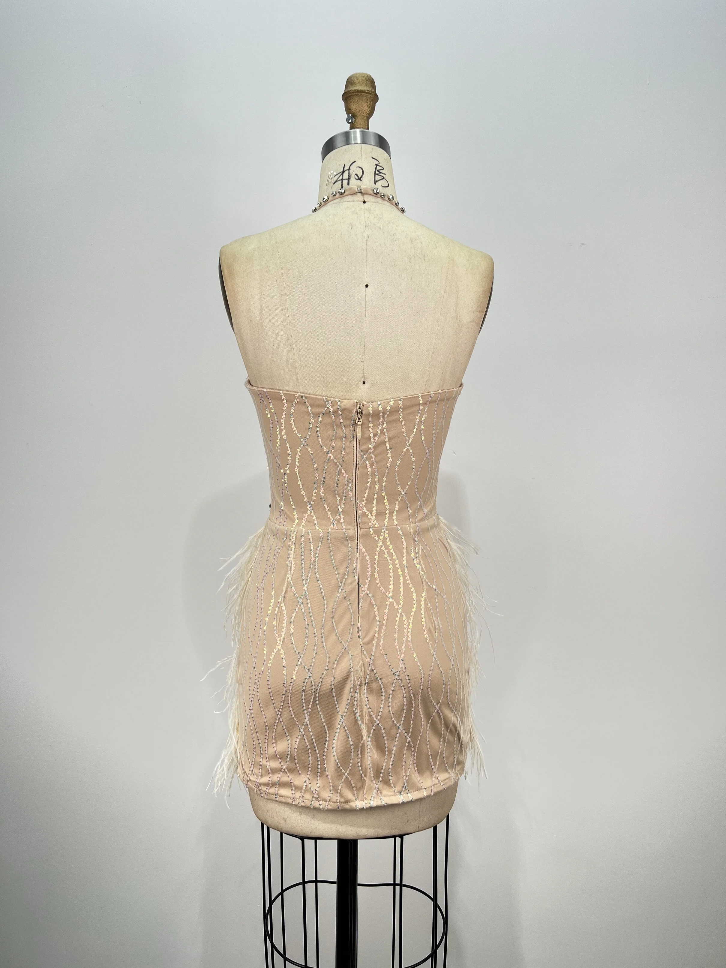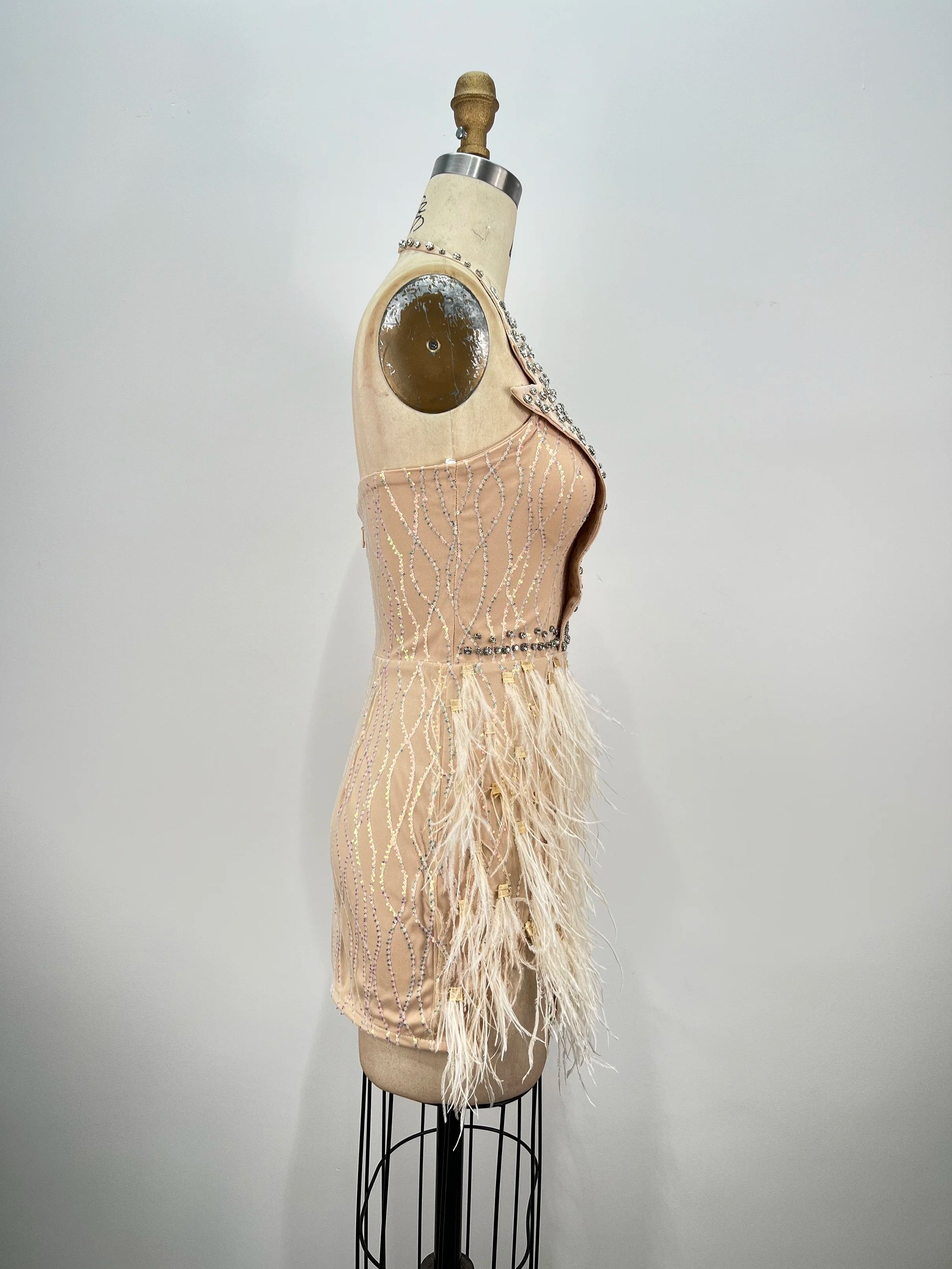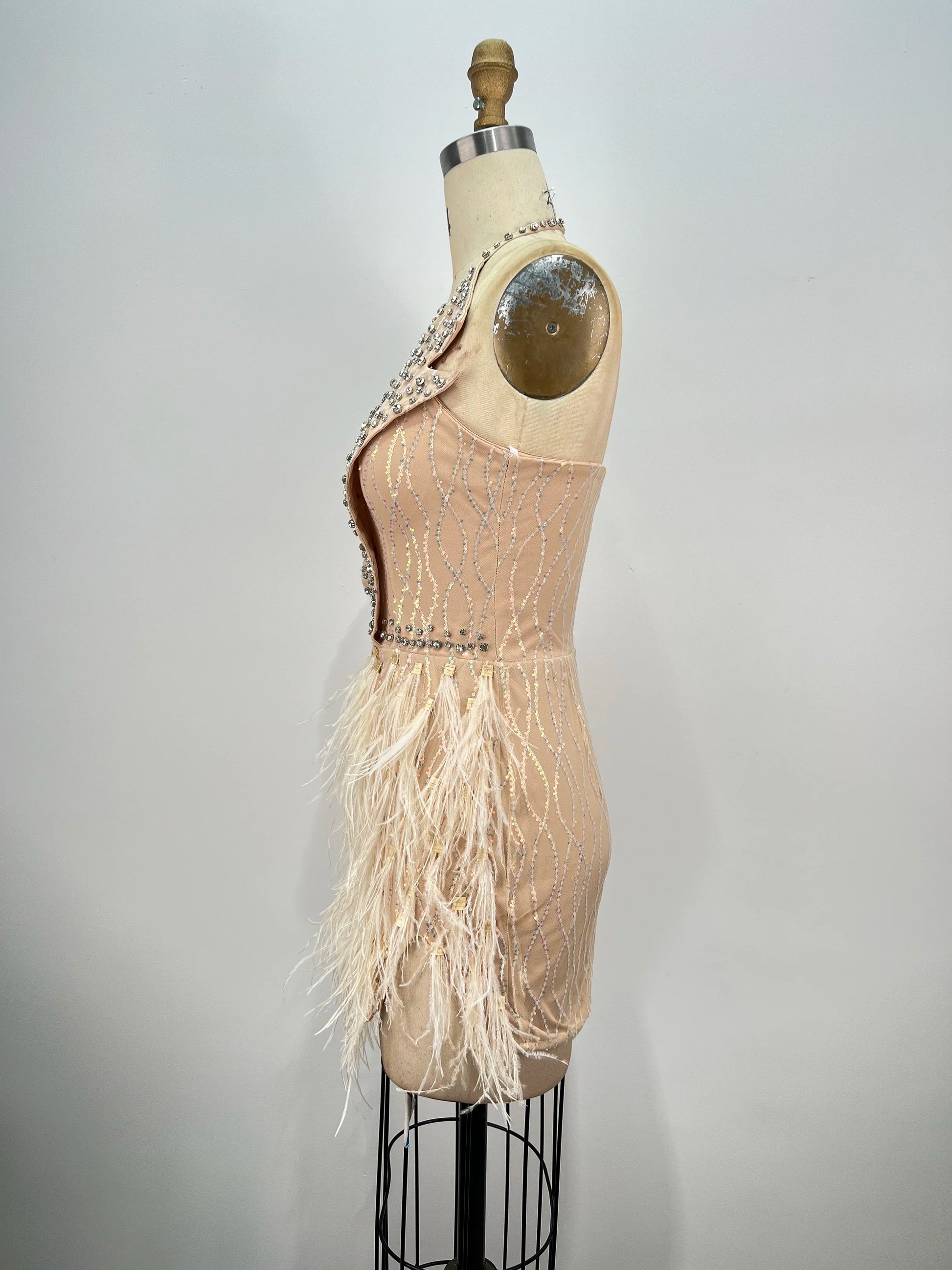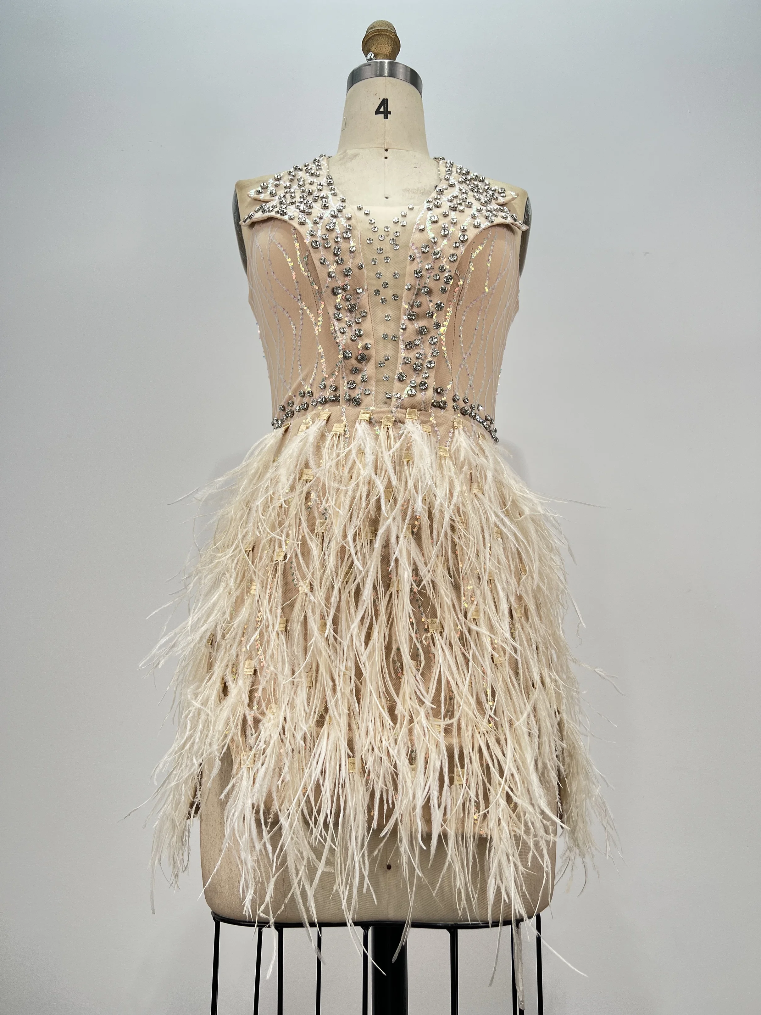 Shine bright in this luxurious mini dress, featuring sparkling rhinestones, shimmering sequins, and elegant feather accents. Designed for the fashion-forward woman, this sexy and glamorous outfit is perfect for nightclubs, parties, stage performances, or singer and dancer roles. Make a statement and captivate every audience with this stunning performance costume.