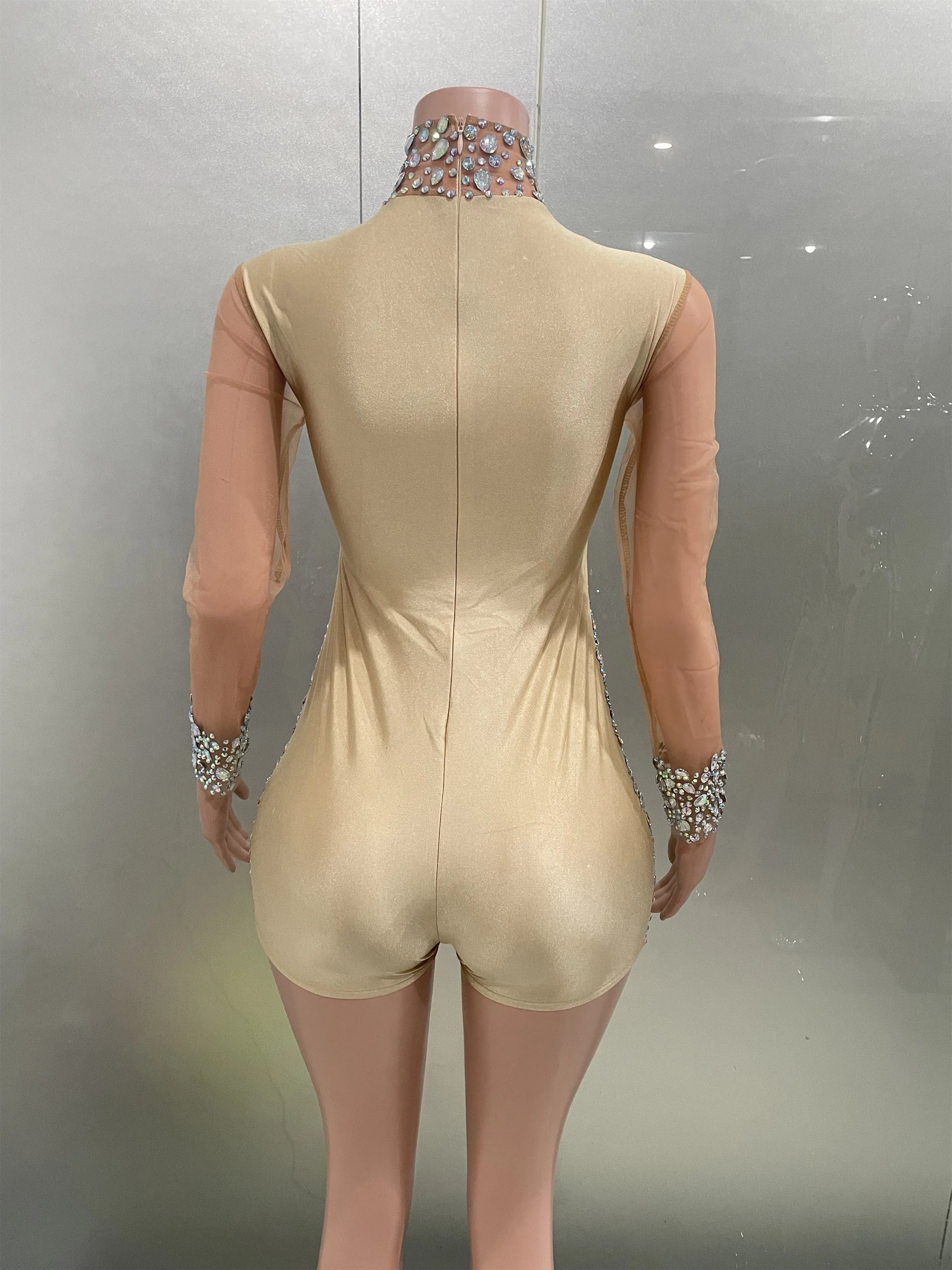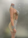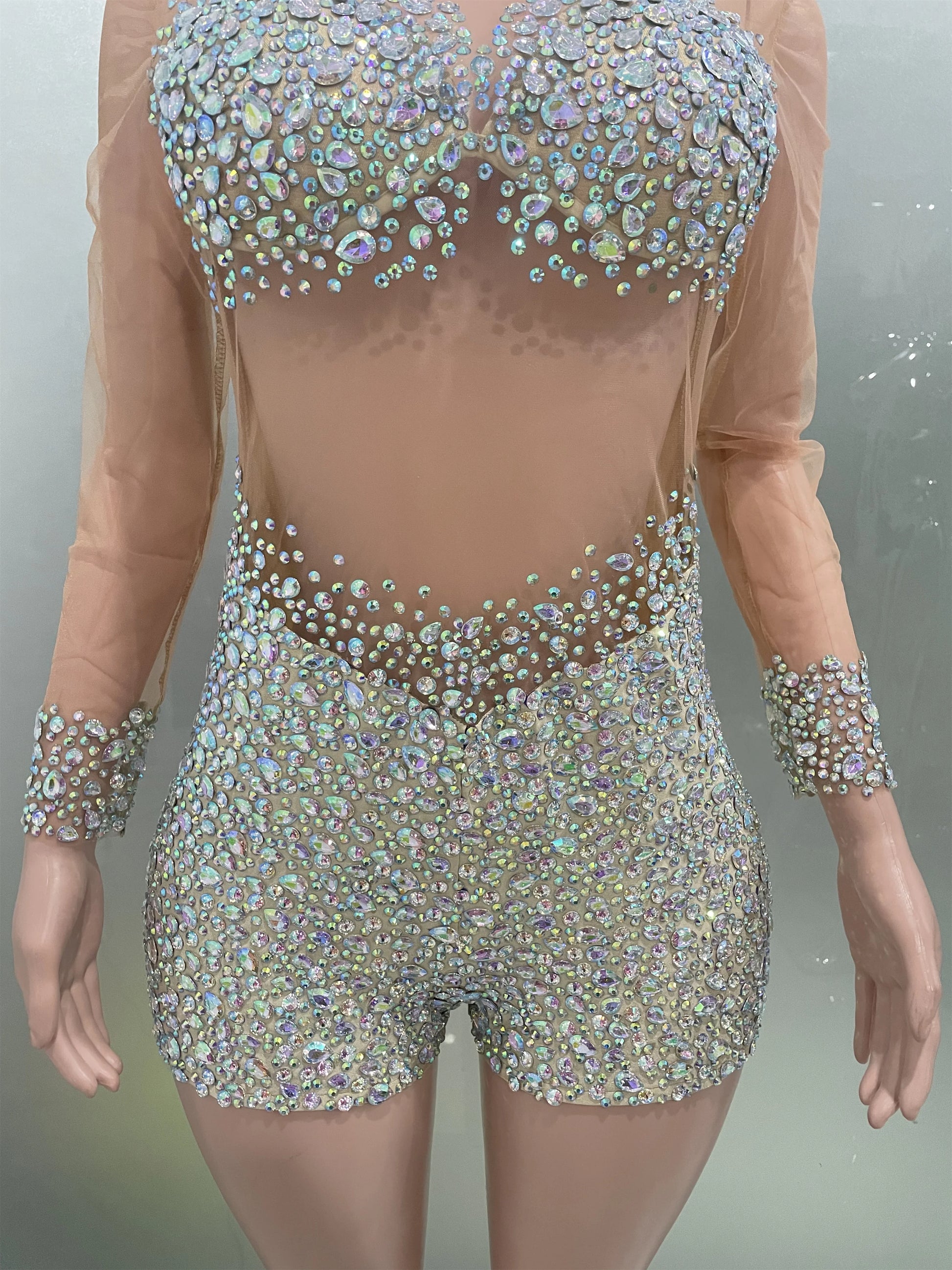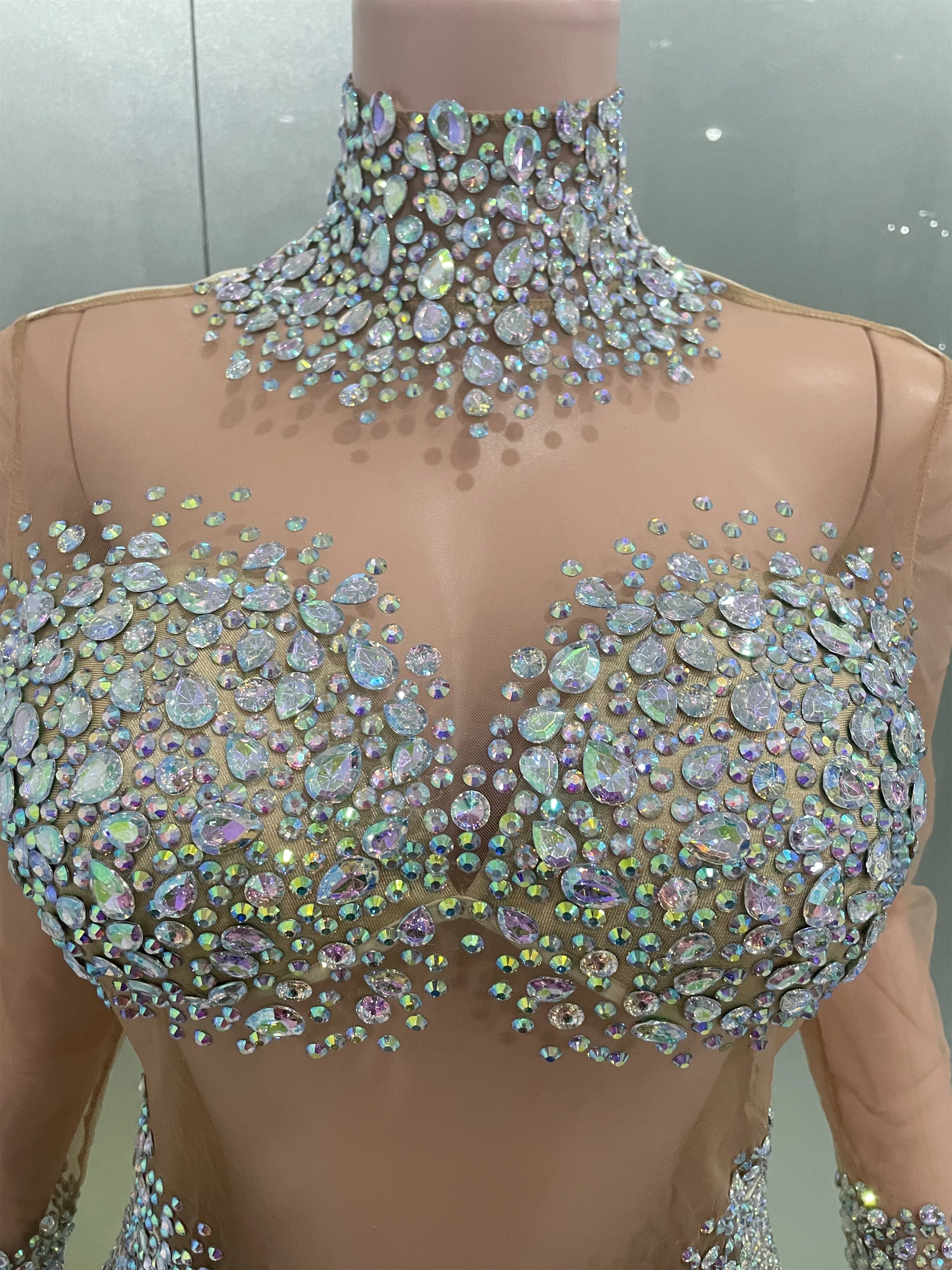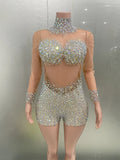 Luxury Sparkle Rhinestones Sexy See-Through Bodysuit Evening Party Performance Costume Bar Nightclub Singer Dancer Stage We