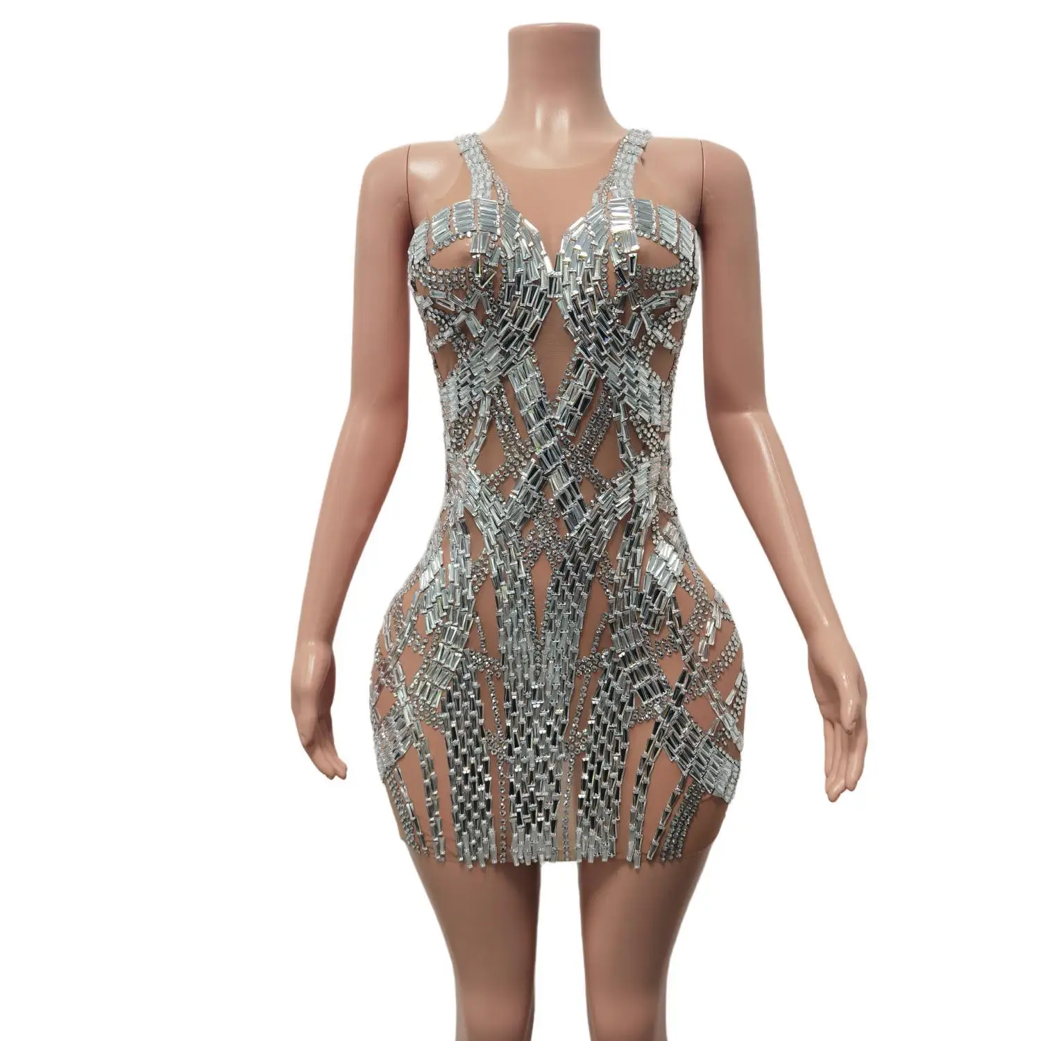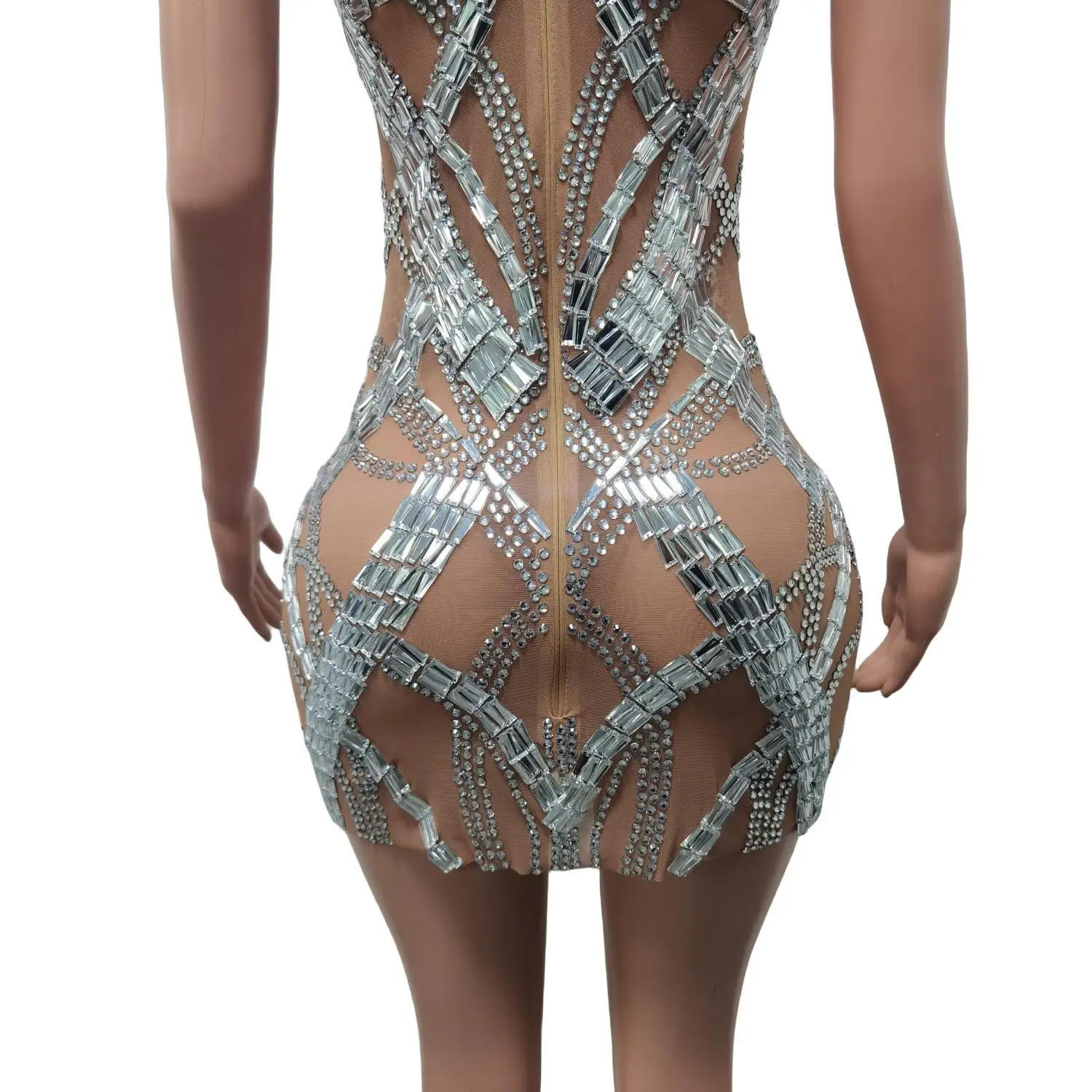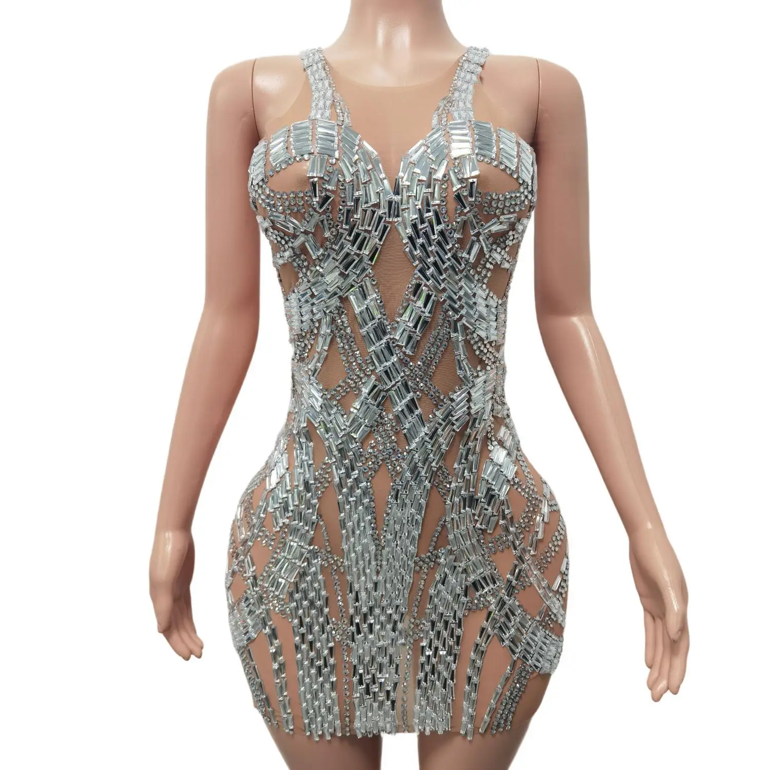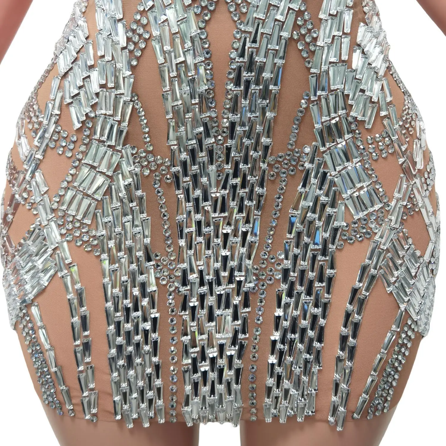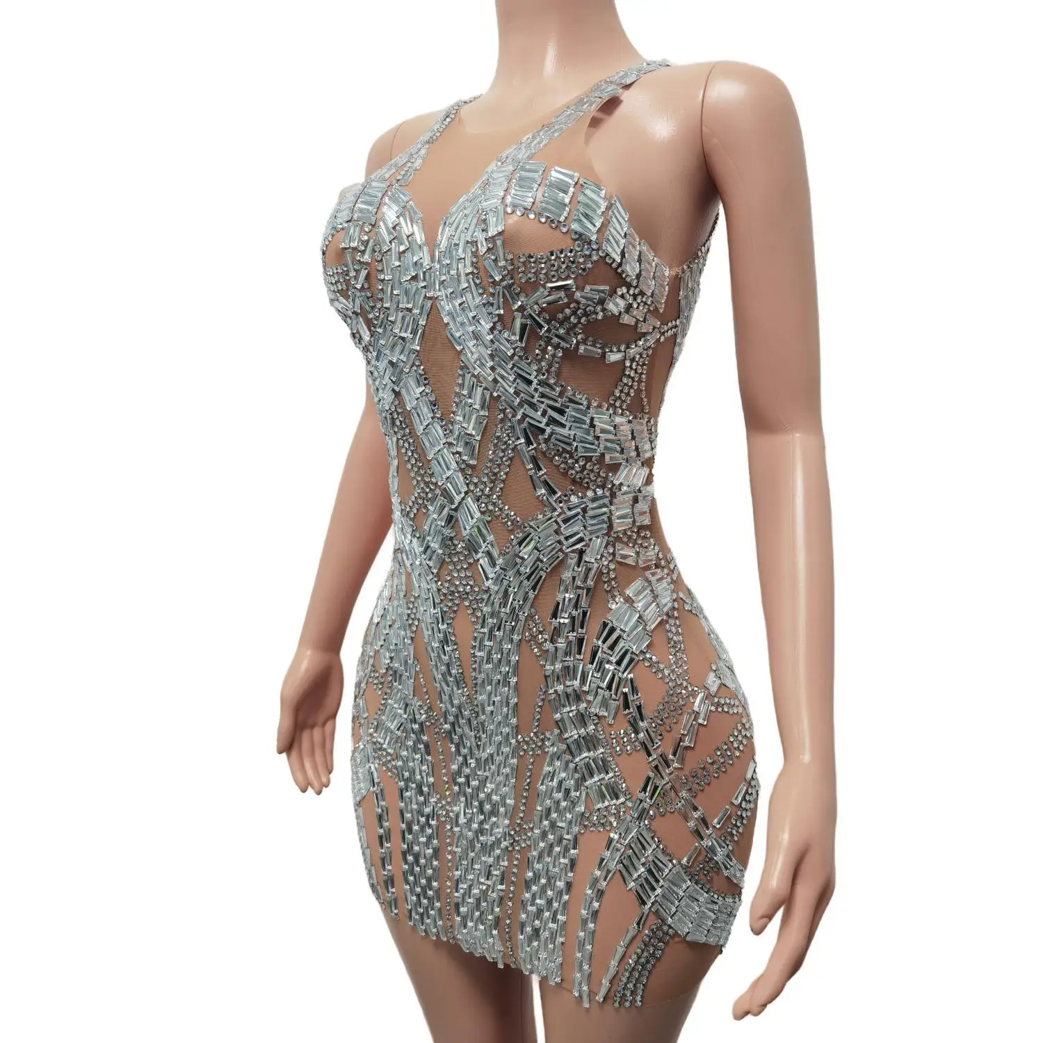 Luxury Sparkly Rhinestones Silver Sleeveless Short Dress for Women Birthday Celebrate Party Outfit Singer Stage Costume
