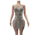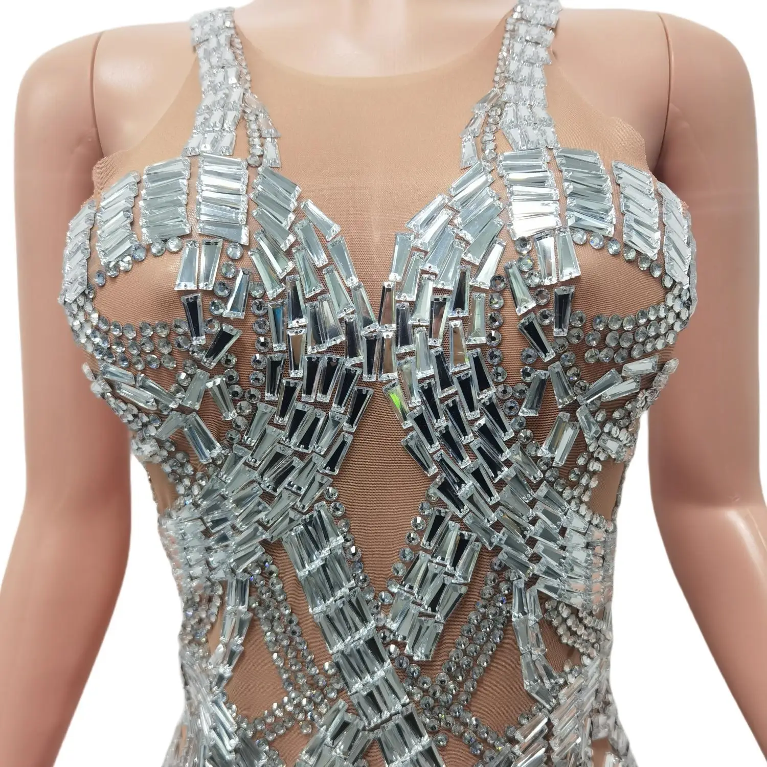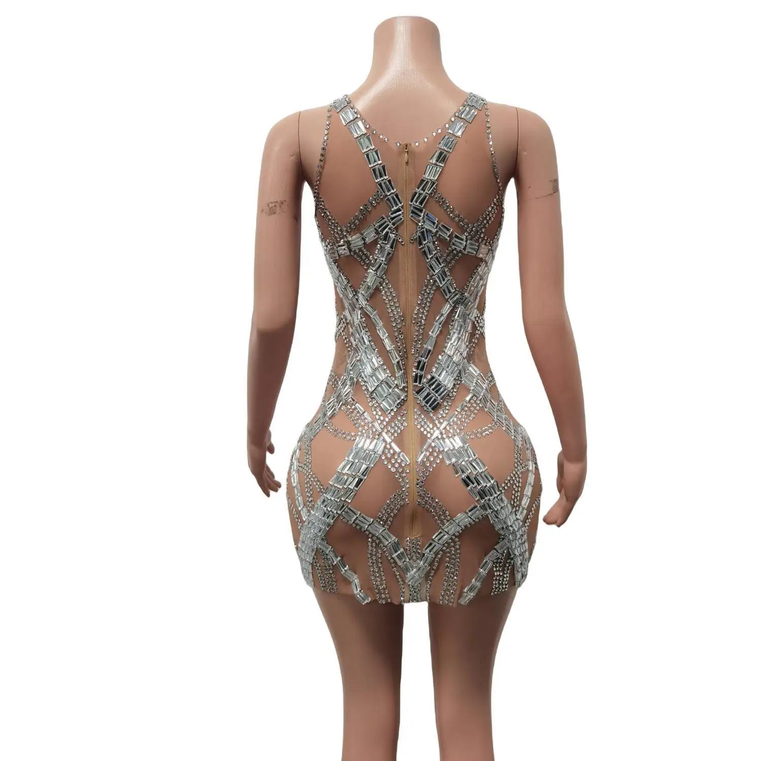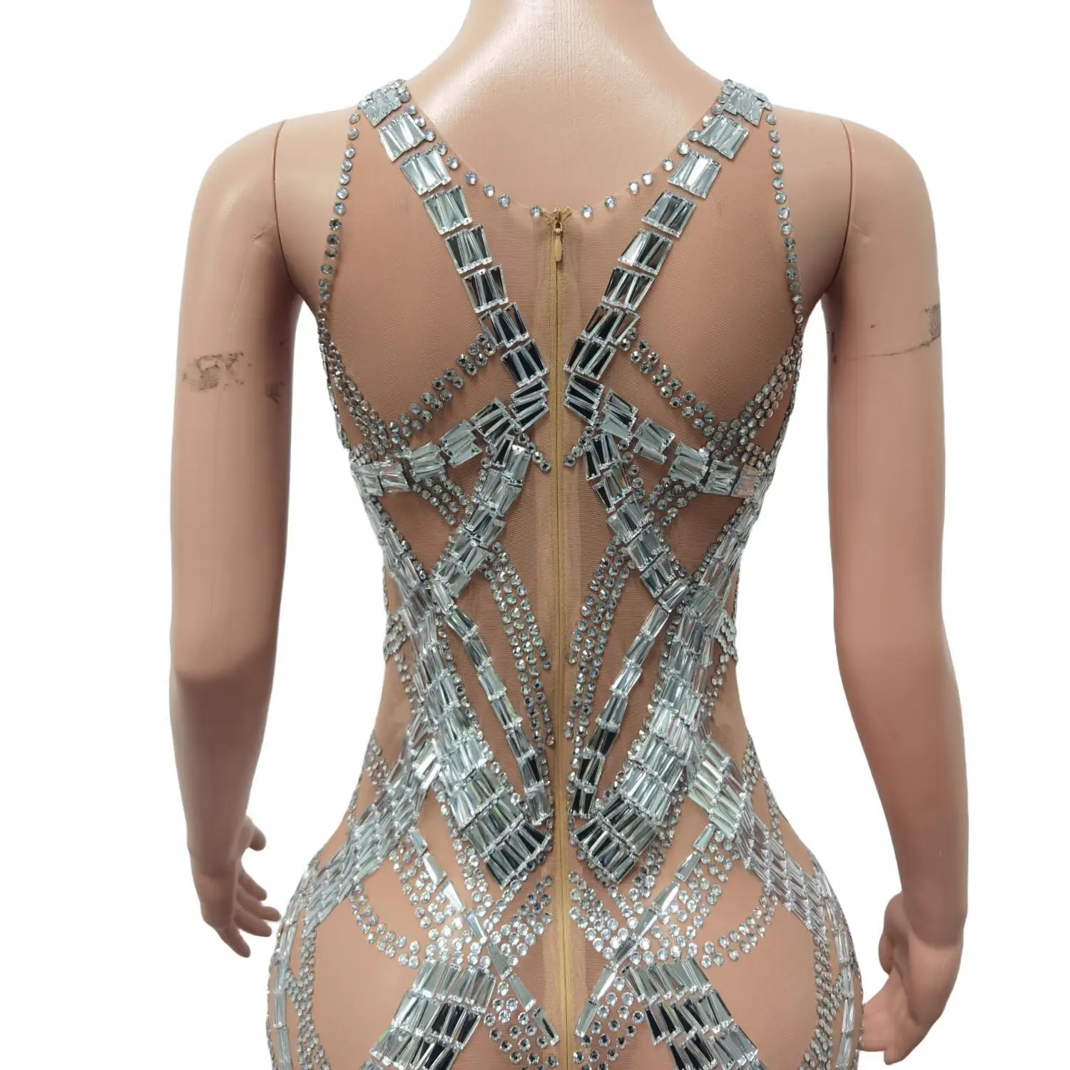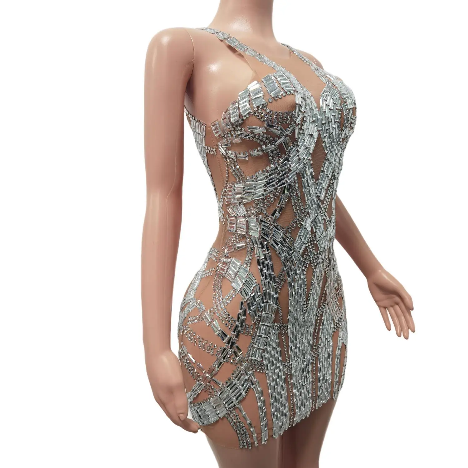 Luxury Sparkly Rhinestones Silver Sleeveless Short Dress for Women Birthday Celebrate Party Outfit Singer Stage Costume