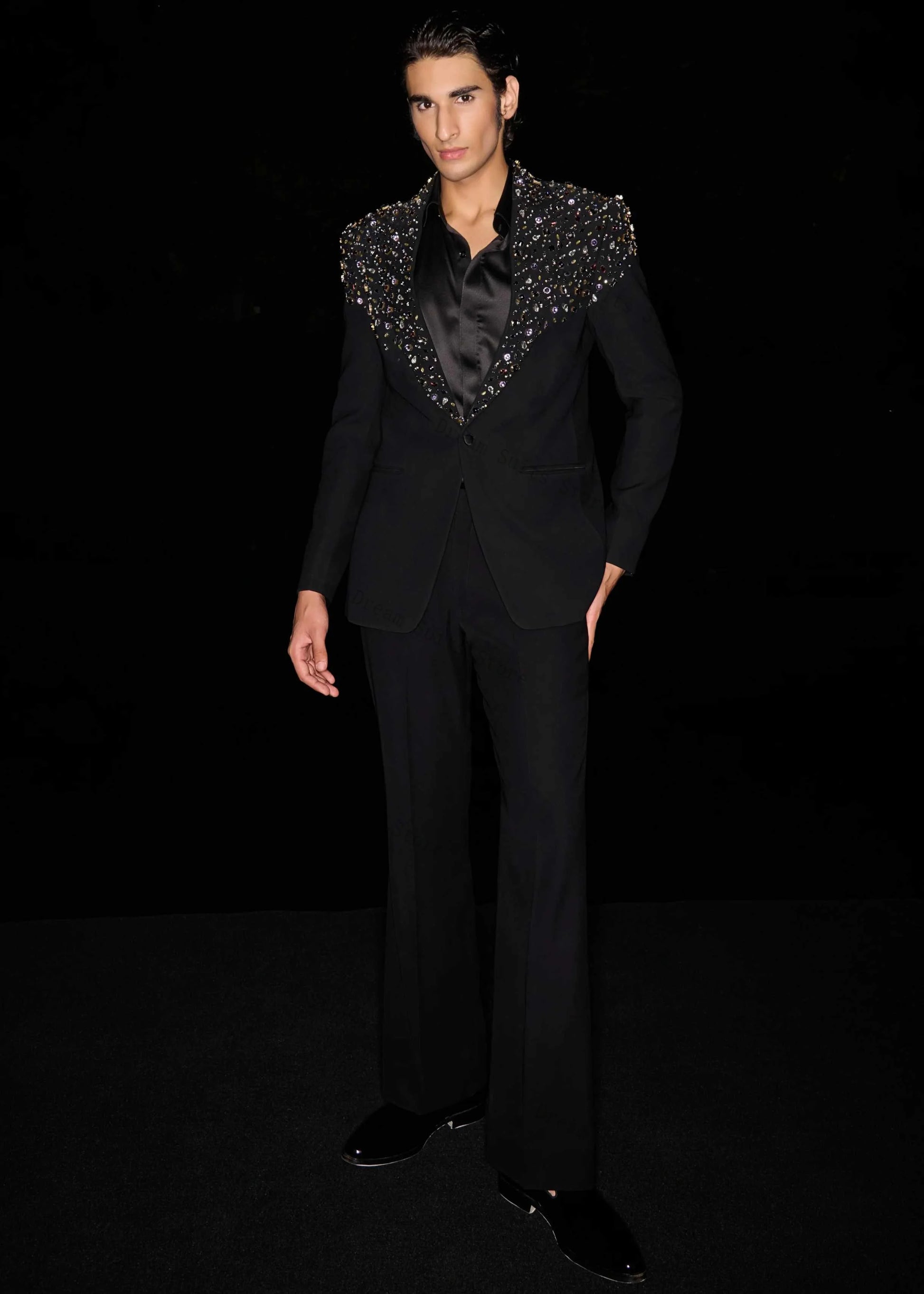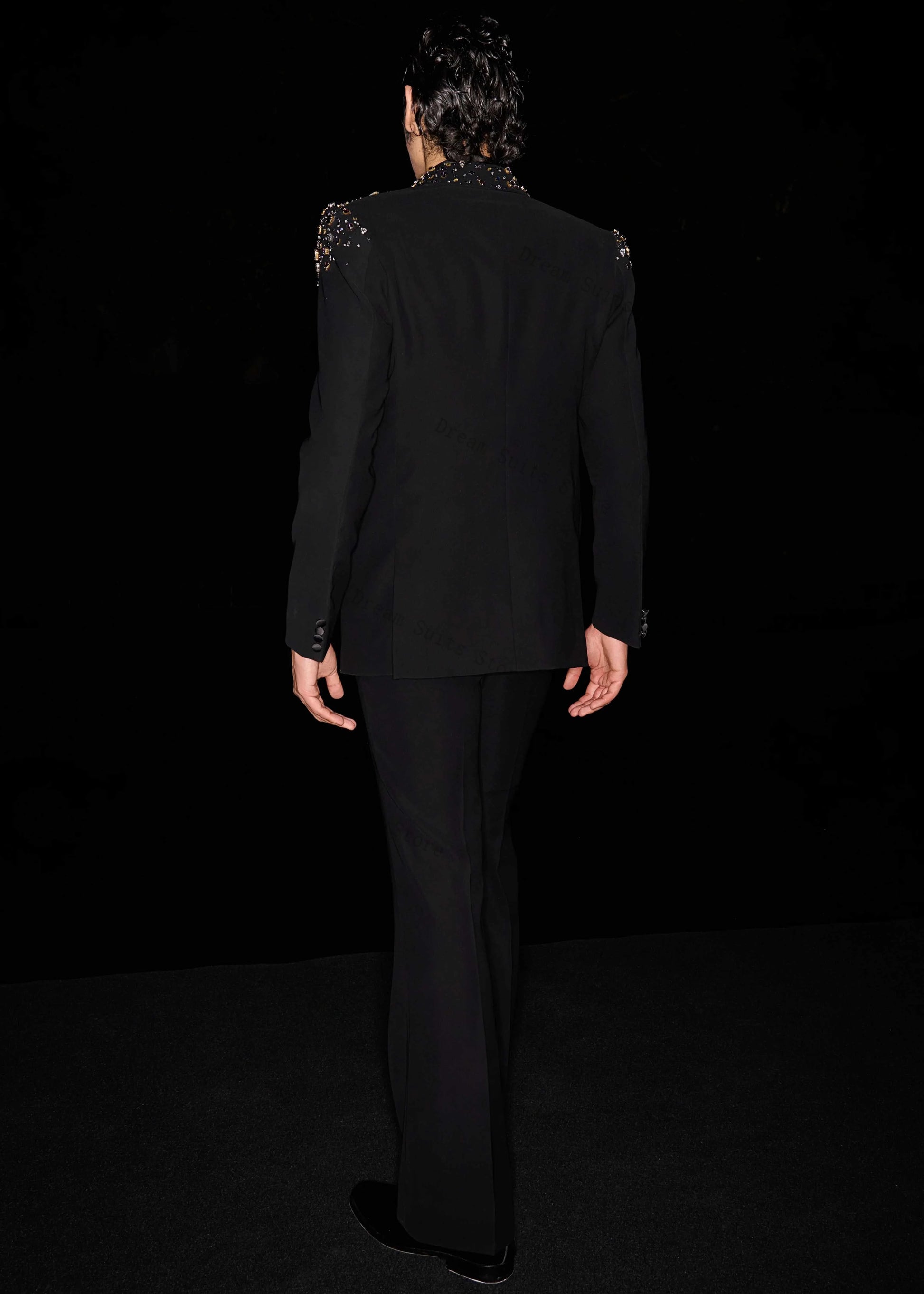 Make a bold, refined statement with the Luxury Stone Crystals Men Suit Set — a meticulously crafted two-piece ensemble that pairs a sharply tailored black blazer with matching pant trousers, embellished with tasteful stone crystal accents for a sophisticated sparkle. Designed for the modern gentleman who wants to combine classic tailoring with haute-couture detailing, this suit is ideal for weddings, proms, red-carpet events, formal office occasions, and any moment when you need to stand out with understated glamour.