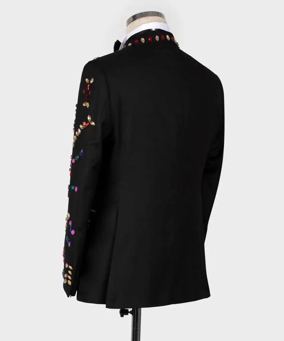 Elevate your wedding day or formal event with this Luxury Wedding Tuxedo — a meticulously crafted double-breasted, two-piece ensemble designed for the modern groom who demands both opulence and impeccable tailoring. This set includes a richly detailed blazer and matching pants, created from premium fabric that offers a soft hand-feel, elegant drape, and long-lasting structure. The blazer features a striking peaked lapel finished with hand-applied crystals and beadwork that catch and reflect light, producing a refined sparkle that reads luxurious without appearing ostentatious.