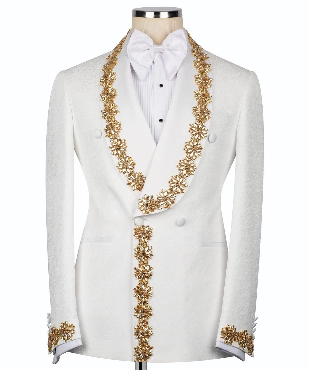 Elevate your wedding or formal event with this Elegant Tailor‑Made 2‑Piece Suit: a shawl‑lapel jacquard blazer subtly embellished with crystal accents, paired with perfectly tailored trousers. Designed for grooms and formal occasions where refined texture and tasteful sparkle create a memorable, photogenic look.