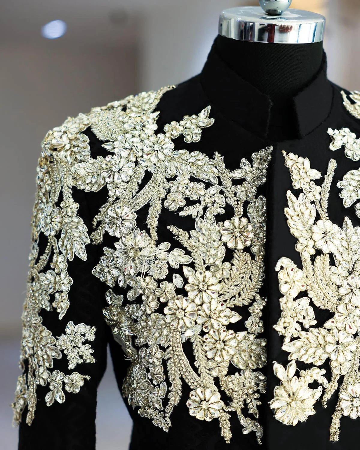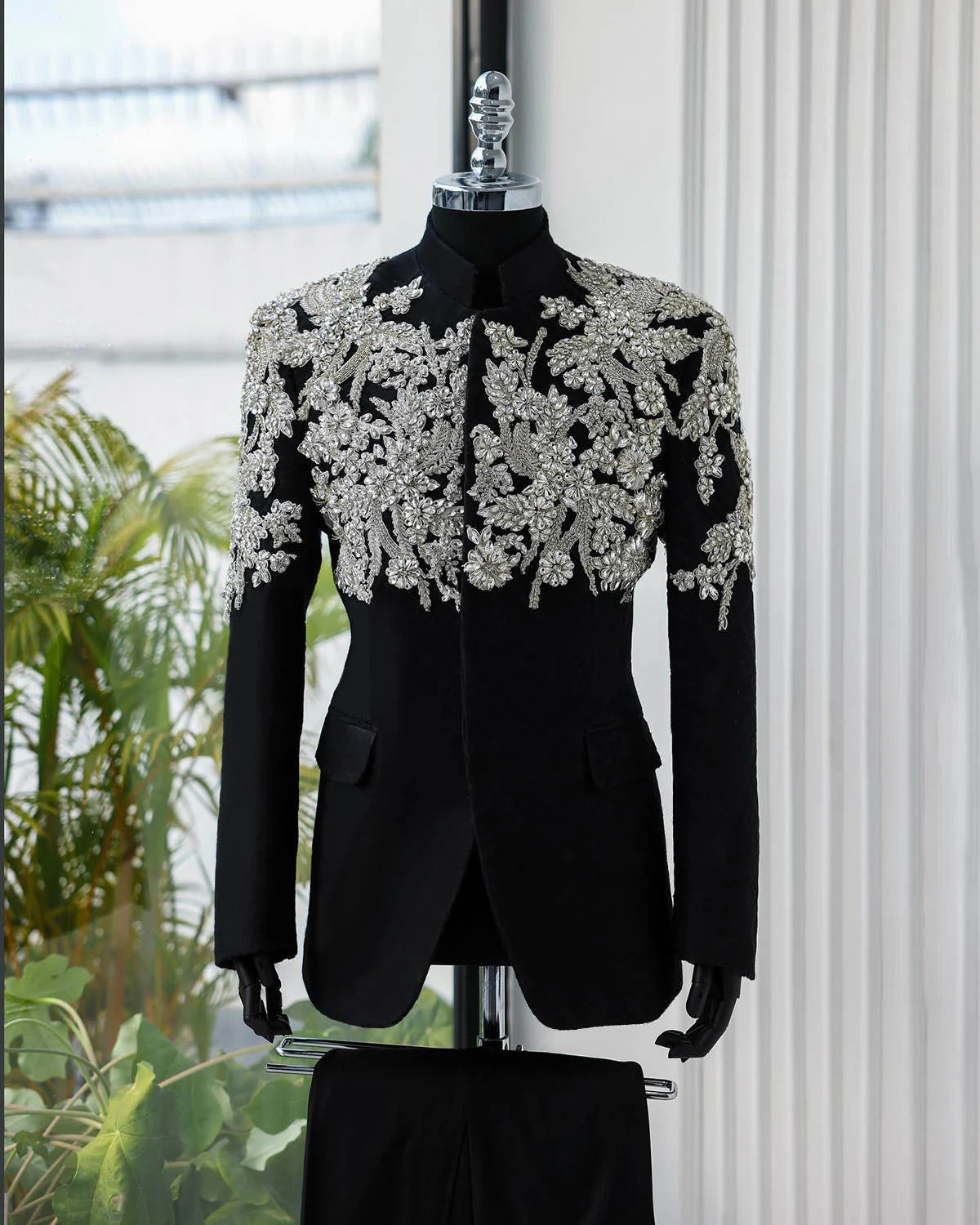 Elevate your wedding day look with this Luxury Men’s Stand Collar Tuxedo, a sophisticated 2-piece set designed for the modern bridegroom who wants to blend high-fashion detail with timeless tailoring. The standout feature is a refined stand (band) collar jacket adorned with hand-applied crystal appliqués that catch the light and add subtle, couture-level sparkle without overpowering the silhouette. Paired with tailored trousers, this tuxedo is equally suited for evening ceremonies, black-tie receptions, and upscale after-parties.